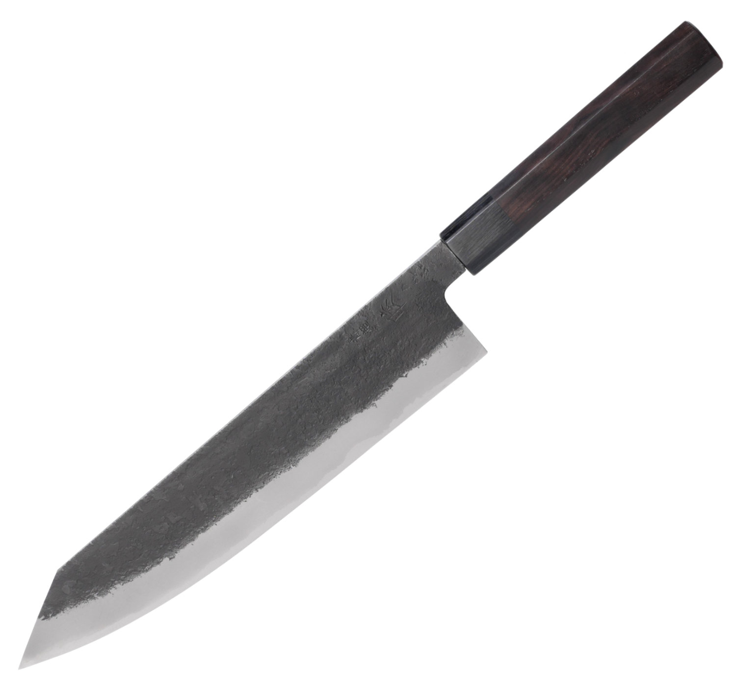 Mutsumi Hinoura has created a knife with substantial weight while maintaining a very thin and delicate edge. The thick spine features a clear taper from the forging process, allowing the knife to cut exceptionally well despite itshefty geometry. Perfect for those who want both a robust feel and a thin, high-performance edge.