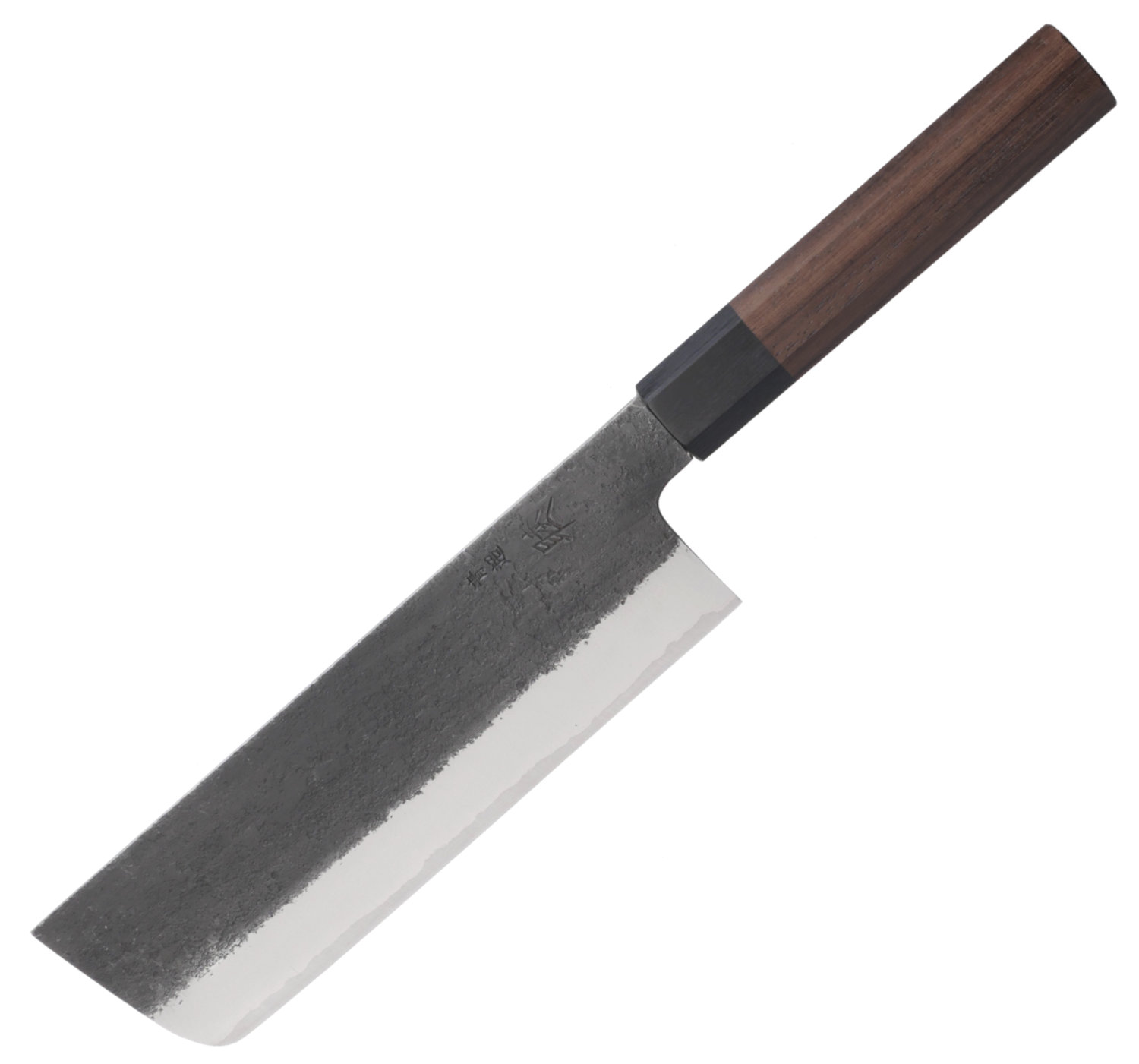The blade features a nashiji kurouchi finish, giving it a raw yet elegant appearance with a black-oxidized texture. The knife is fitted with an elegant rosewood handle with black pakkawood ferrule.