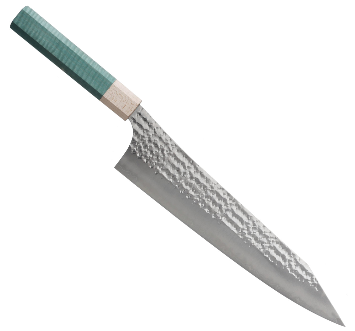 In this line Kurosaki uses stainless SG-2 power steel with blade sides that he hammers to a unique pattern. The finish has high gloss and the knife gives a great feeling of quality.