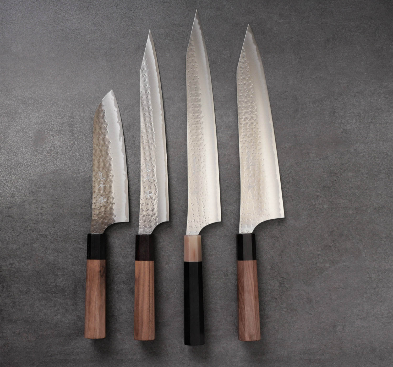 Featuring Aogami Super carbon steel core, the blade is razor-thin and offers extraordinary edge retention. The stainless cladding is hammered, darkened, and polished, creating a bold contrast with the shimmering edge.