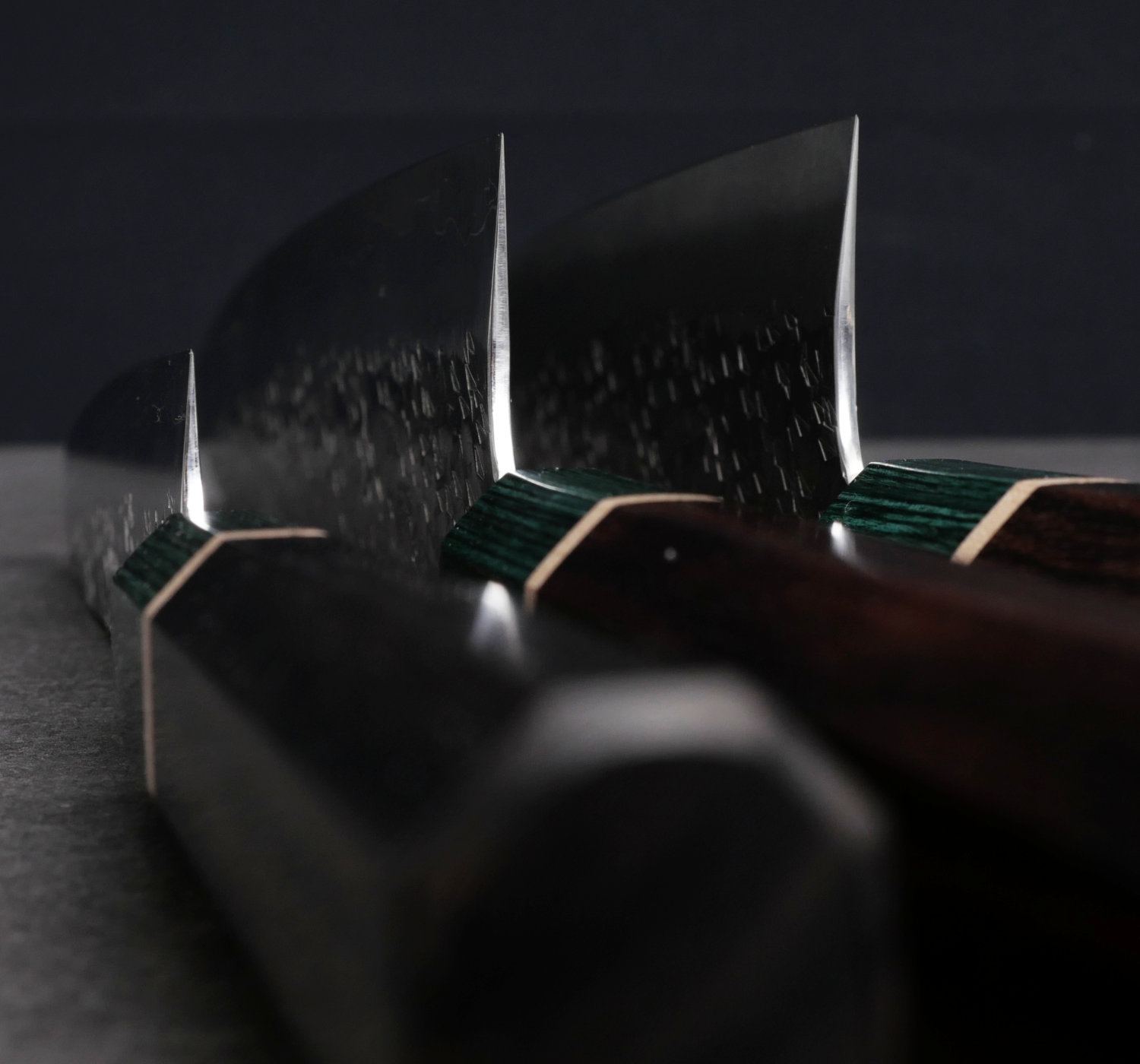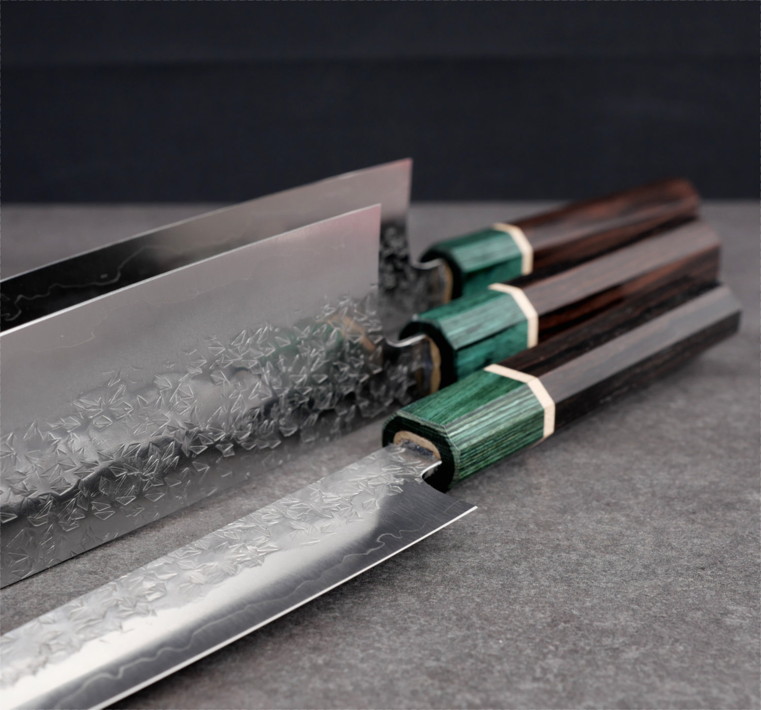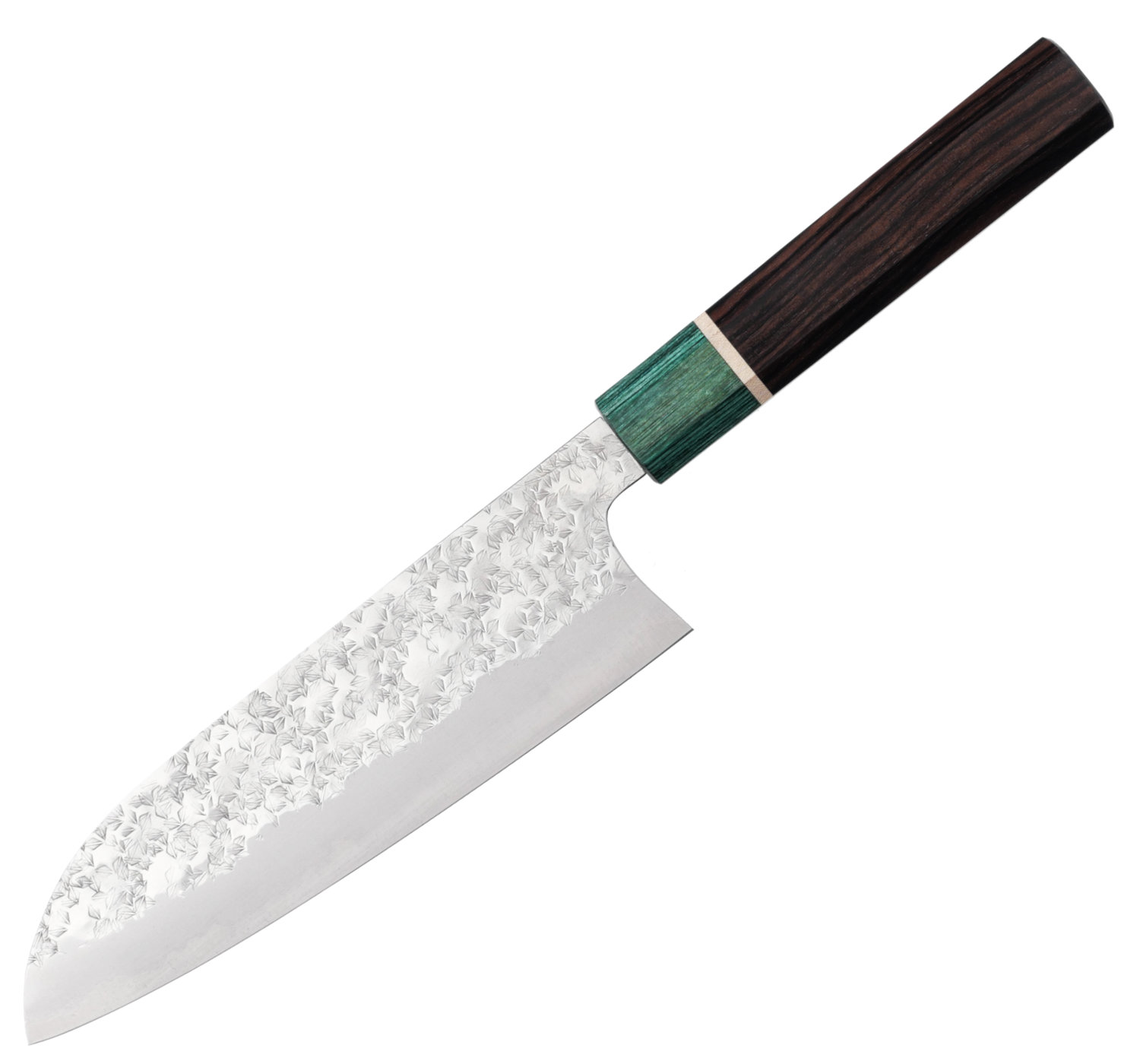 The knife is fitted with an octagonal wa handle made from rosewood, paired with a green pakkawood ferrule. The shape provides a stable and well-defined grip, especially for pinch grip, while the materials offer a good balance between feel and durability.