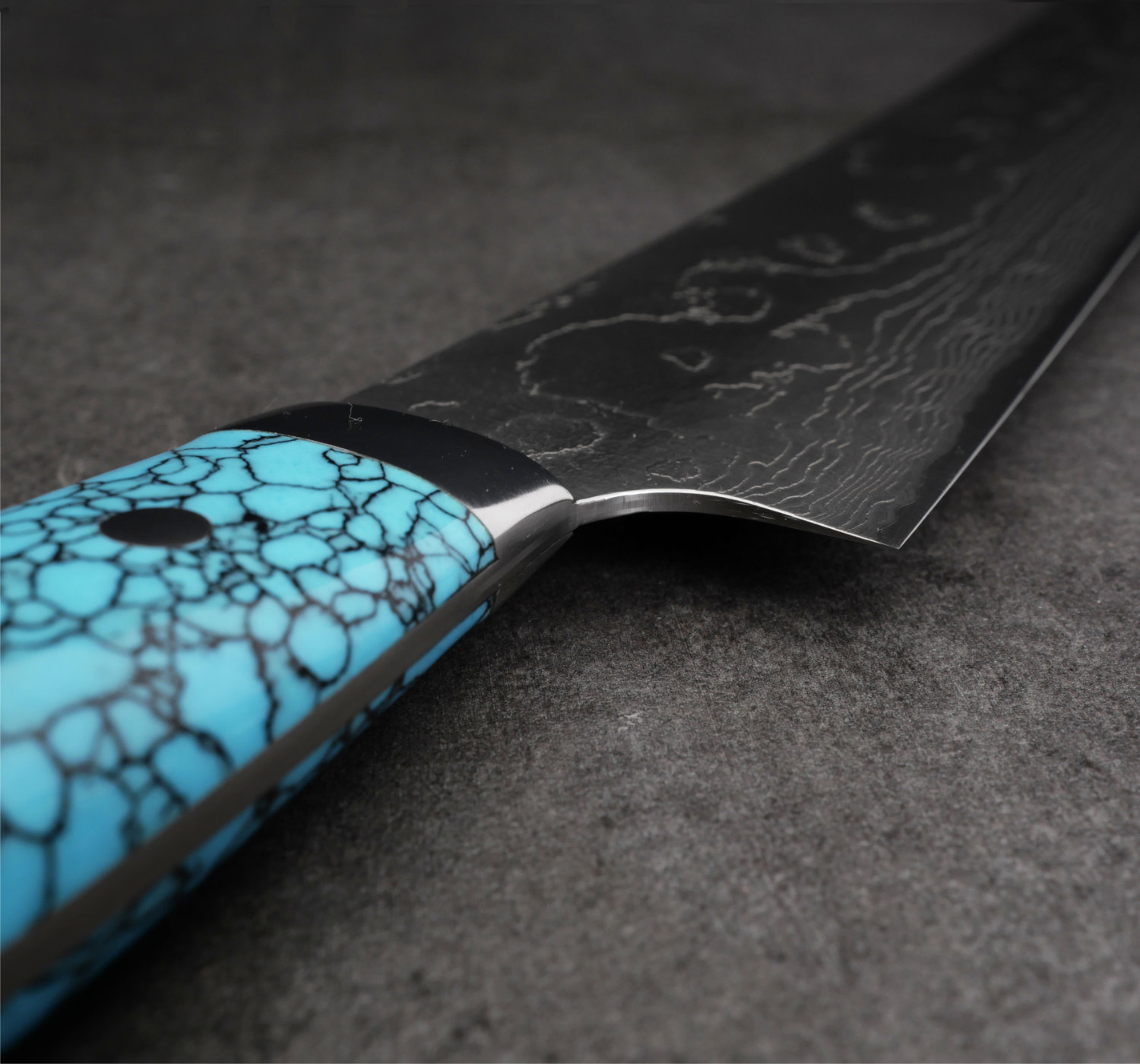 This luxurious piece is handcrafted in Saji’s forge in Takefu, Japan. The blade features a stainless SG-2 powder steel core, clad in a stunning layer of Damascus steel.