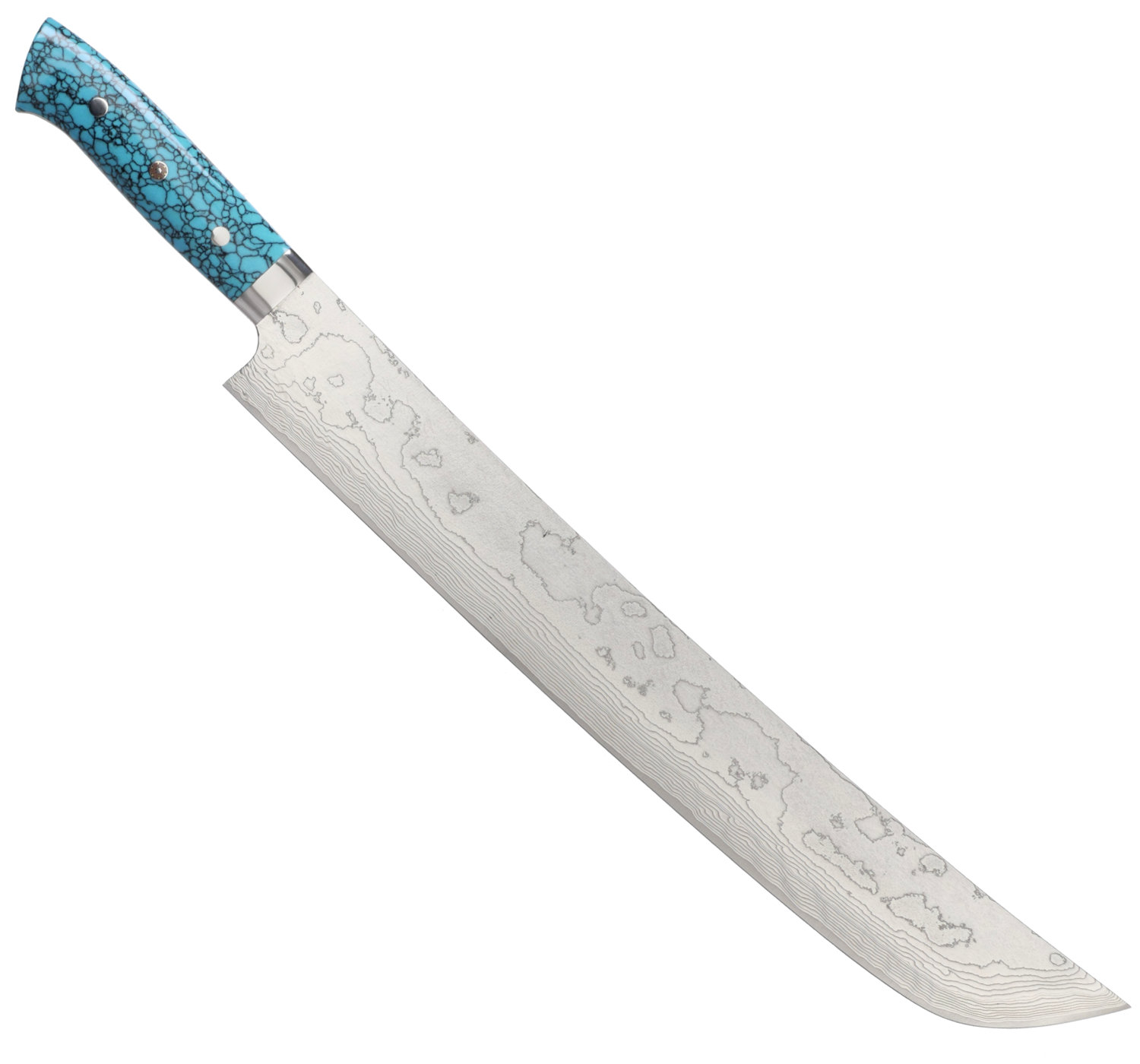 What a sword! A unique masterpiece by Takeshi Saji, a slicer with an impressive 405 mm blade crafted from beautiful damascus steel.