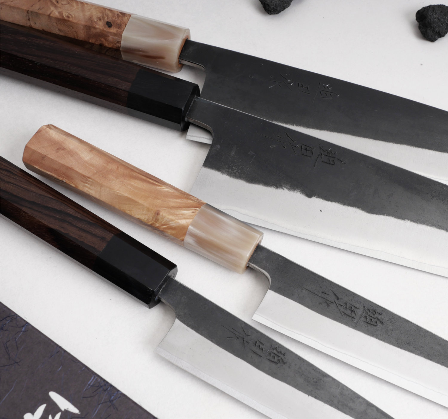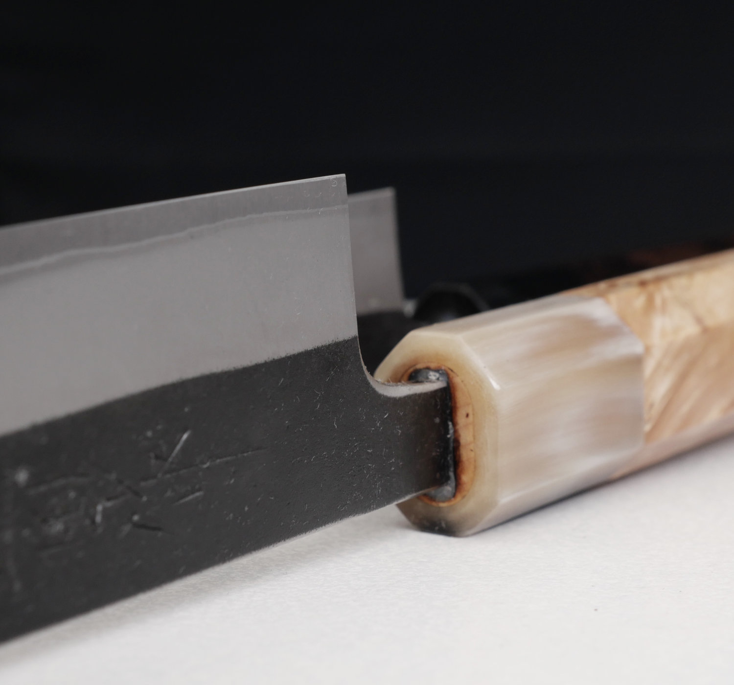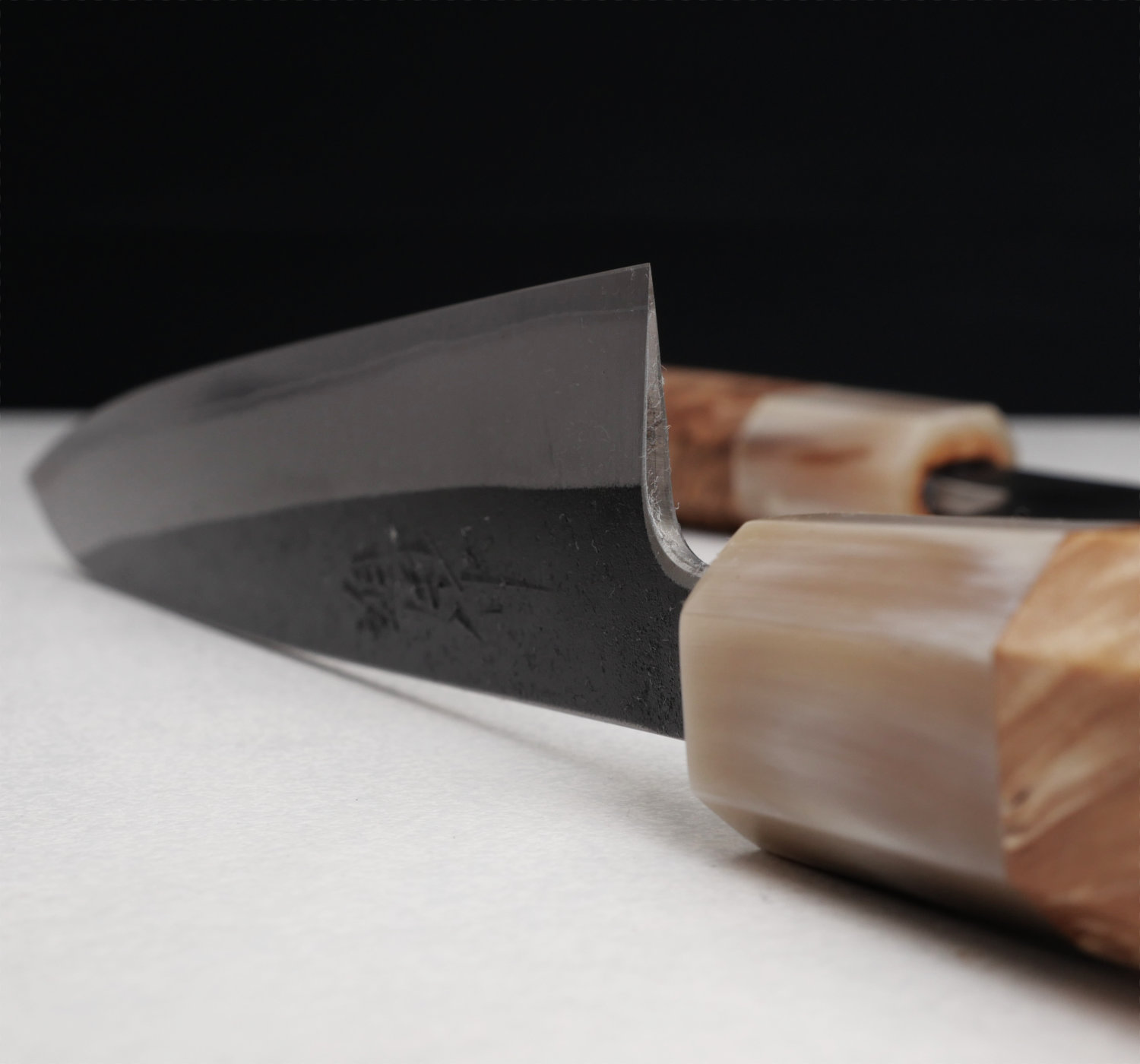 This knife is handmade in a traditional Japanese workshop that uses techniques dating back over 400 years. The workshop was founded in 1973 by Haruyoshi-san in Susaki, Tosa. Today, it is led by Tsuyoshi-san, the second-generation blacksmith in the family. Tsuyoshi has studied under some of Japan’s top bladesmiths and sharpeners for over 20 years, and now possesses outstanding skill in both grinding and sharpening.