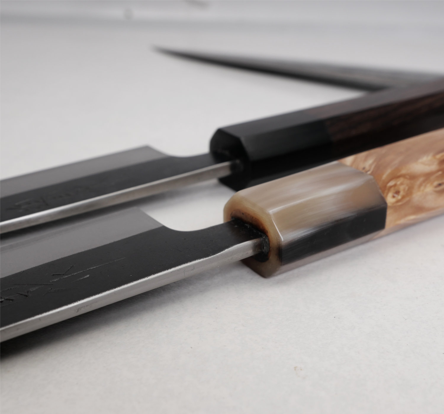 A Japanese petty knife with 150 mm edge length. The handle is octagonal and made from quincewood burl with blond buffalo horn ferrule.