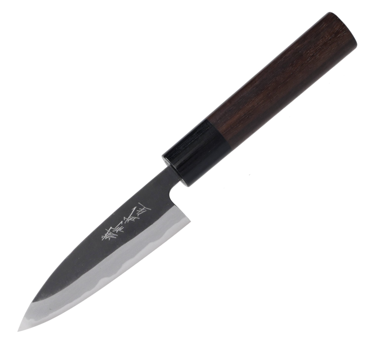 This knife is hot forged by hand in aogami#2 carbon steel, heat treated to 63-64 HRC. The blades are tapered and the finish is black kurouchi. The grind is thin, very thin, and they cut like lasers. A really good pick up that we truly recommend.