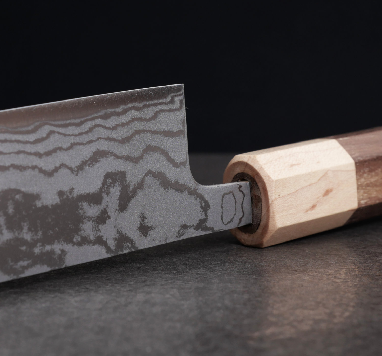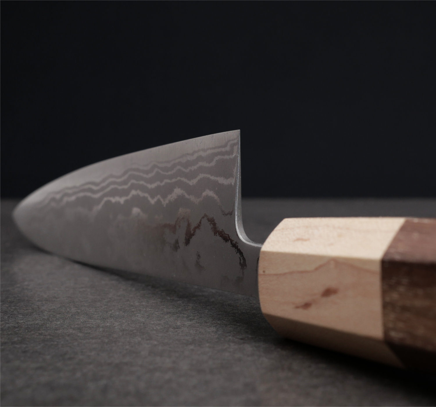 This knife is hot forged by hand in aogami#2 carbon steel, heat treated to 63-64 HRC. The blades are tapered and the core steel is surrounded by beautiful iron damascus. The grind is thin, very thin, and the knives cut like lasers. A really good pick up that we truly recommend.