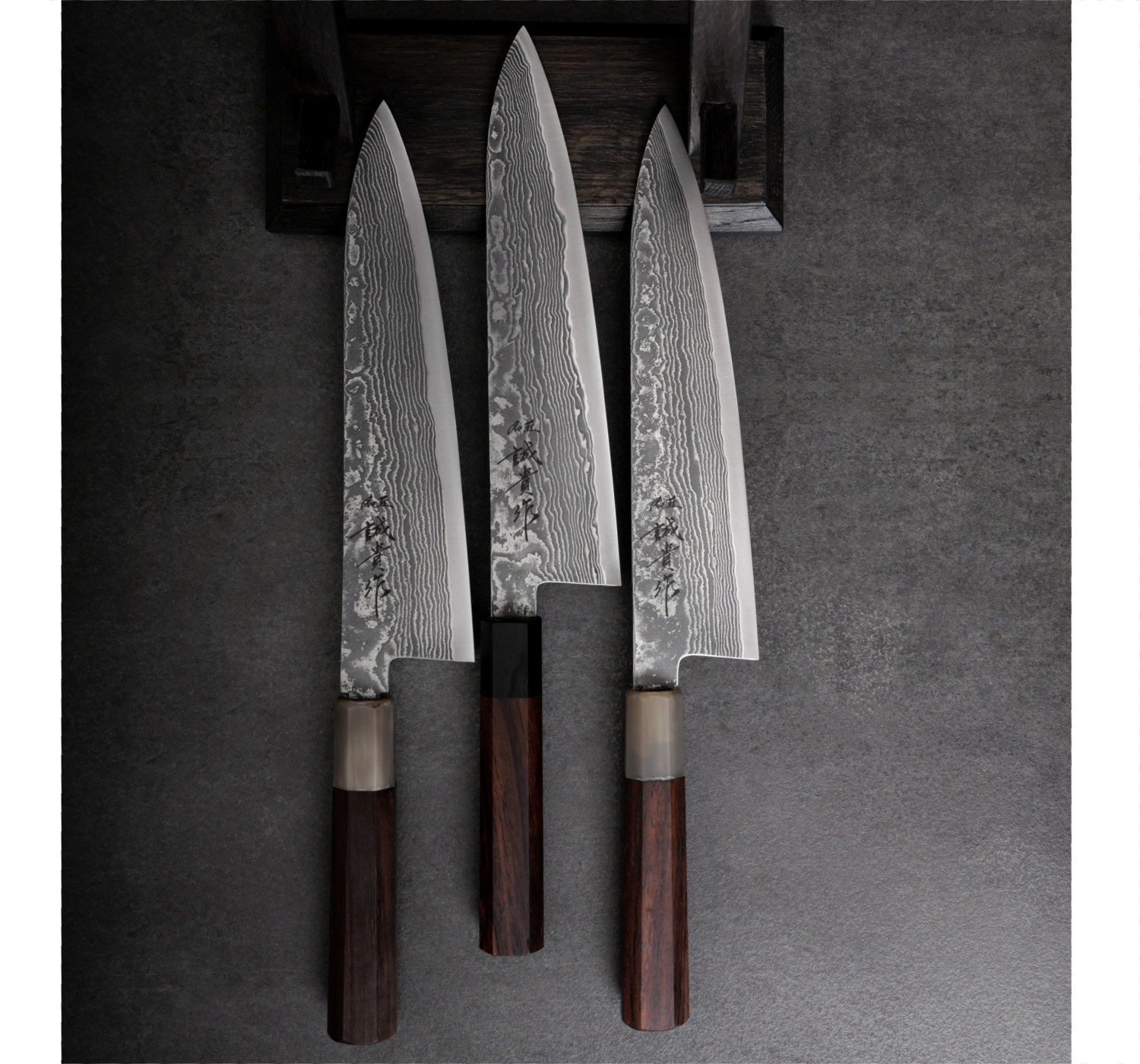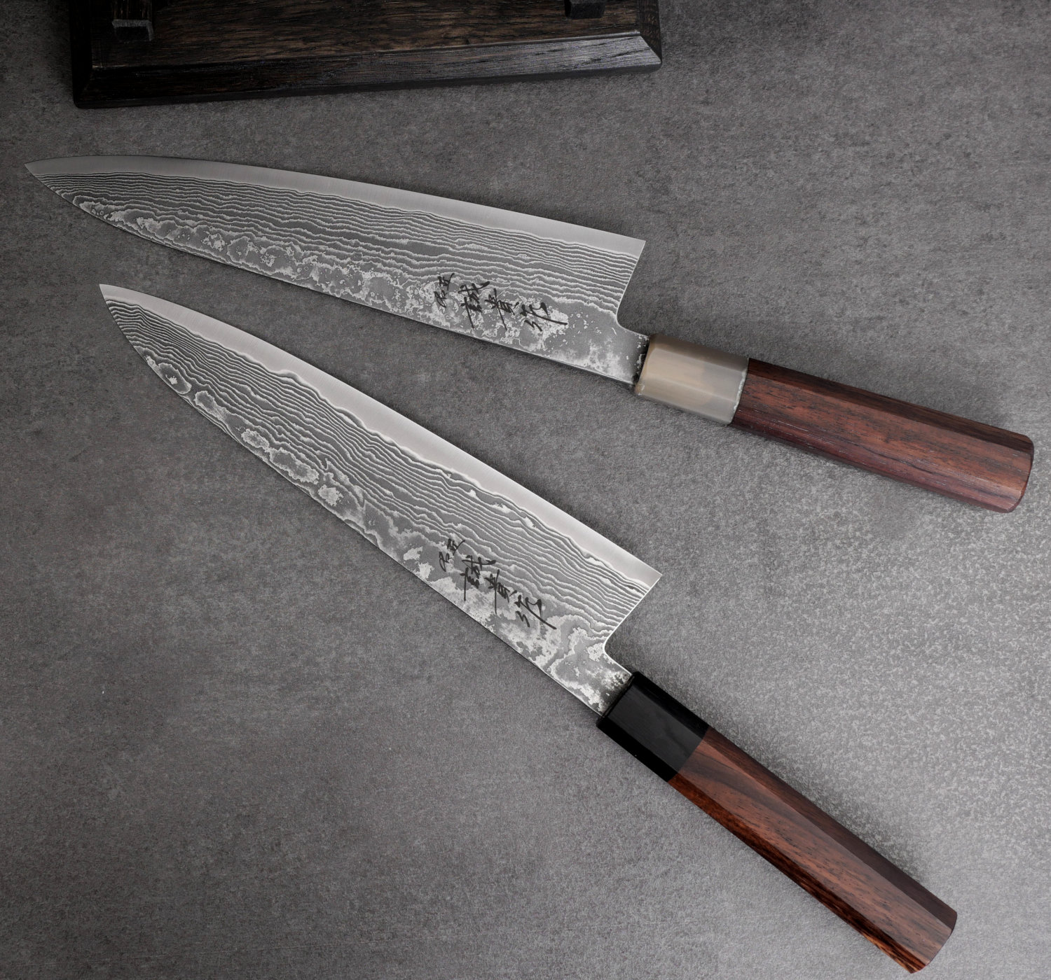 The blacksmith behind these knives is Shigeki Tanaka, known for producing blades that are as beautiful as they are sharp. The blade features a core of SG2 powdered steel, delivering exceptional sharpness and edge retention, with a hardness of 62–63 HRC. Surrounding the core are 32 layers of steel, creating a striking damascus pattern.