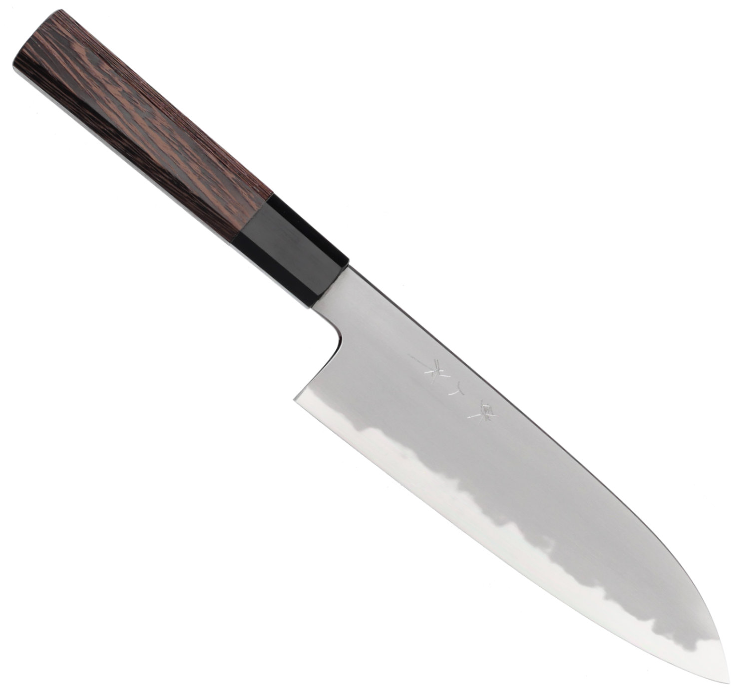 Together they manufacture premium knives in the carbon steel Aogami #2. The forging is extremely fine caliber in the classic Sakai spirit. The knife is robust in hand, but with a delicate edge with just the right edge flex.