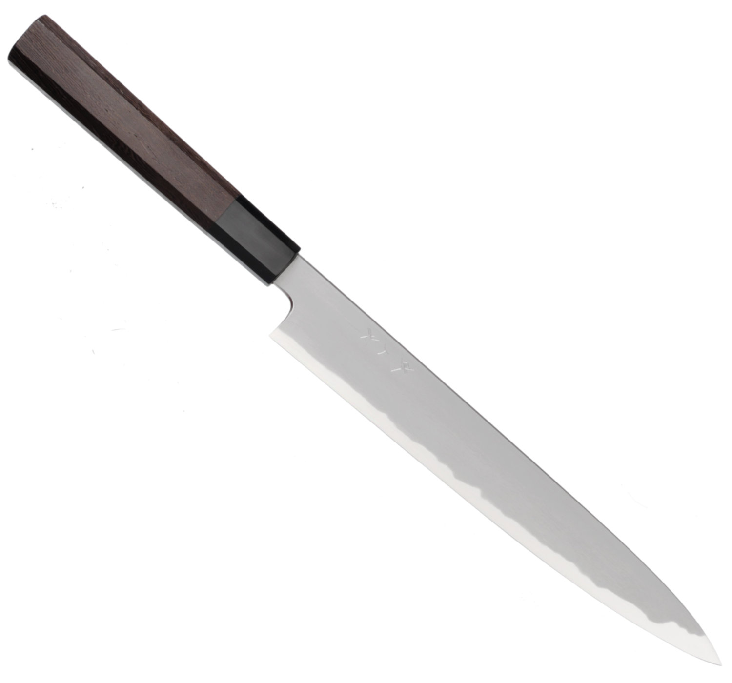 Sujihiki slicer with 232 mm long blade (measured from tip to heel). This is such a nimble knife. Its a little shorter than your average sujihiki, has a thin and delicate edge and well rounded spine and choil. This a a dream knife if you are looking for a high performance laser with great fit and finish.