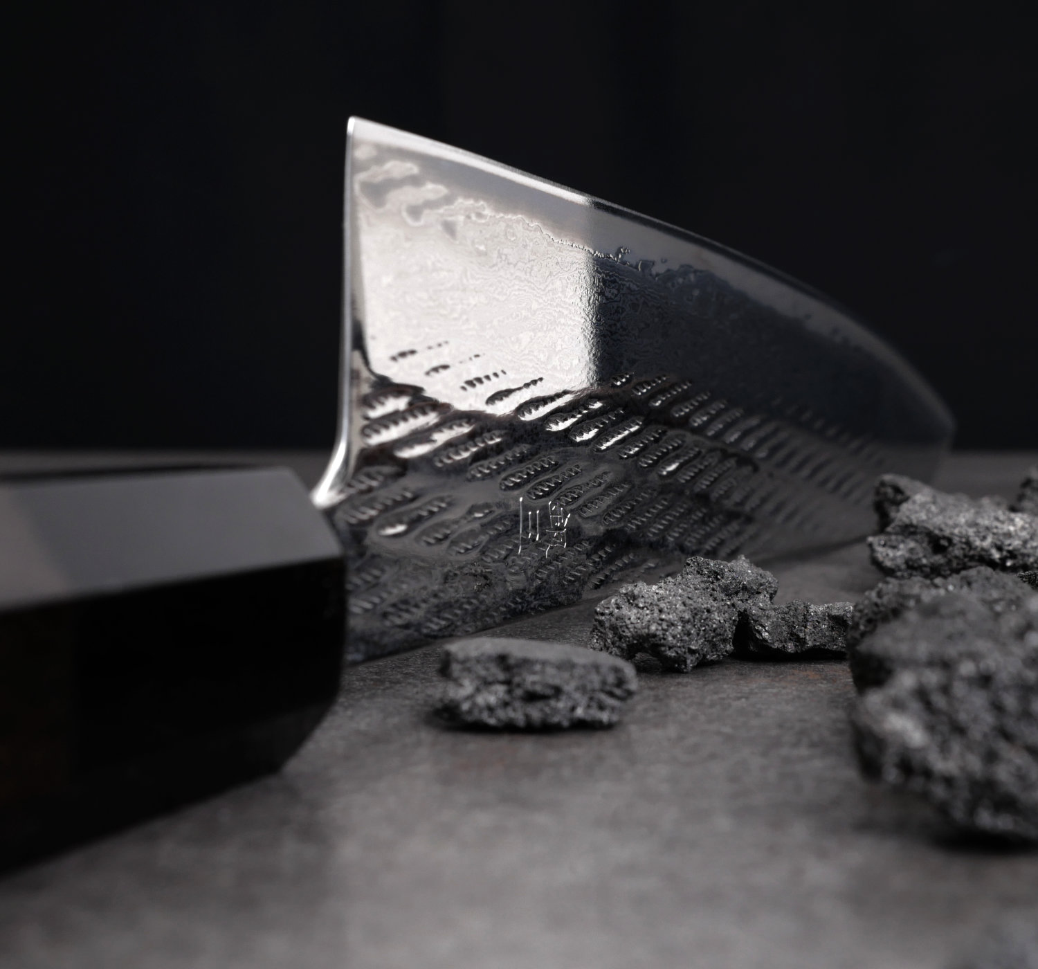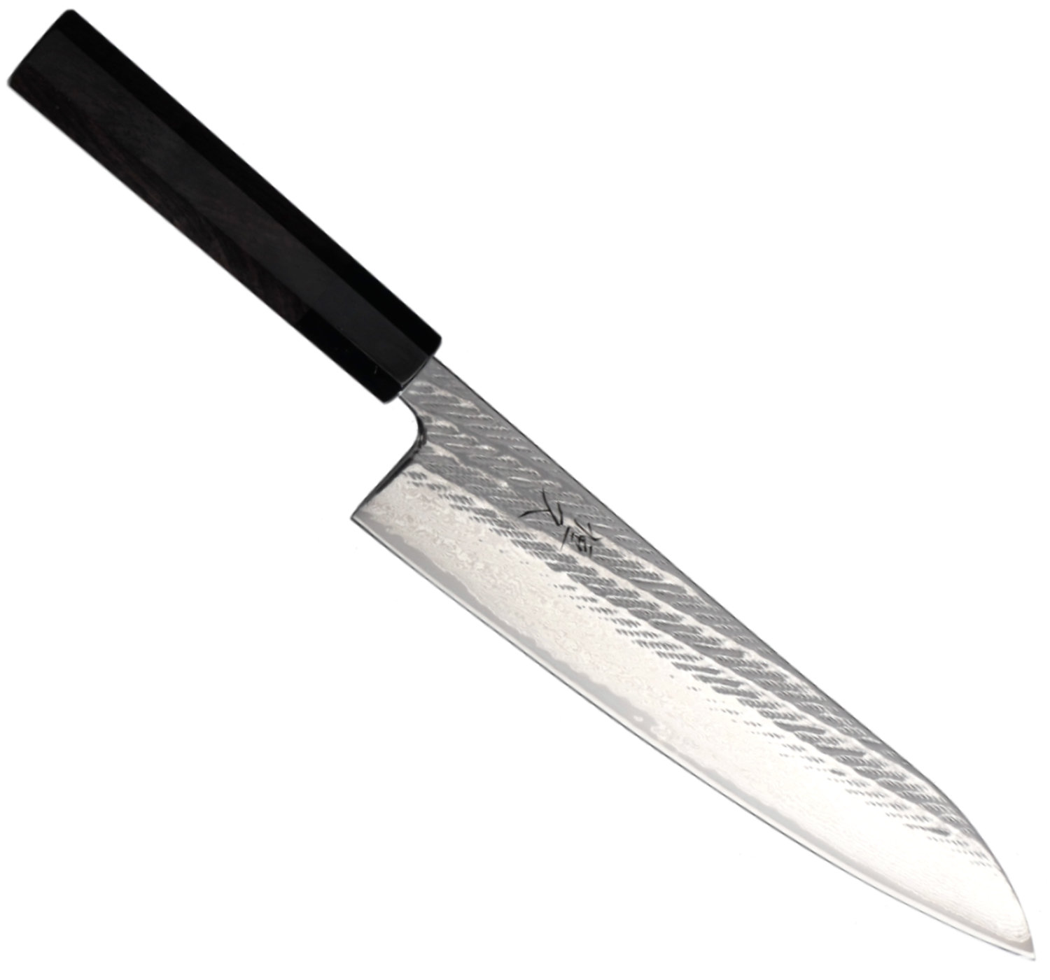The core steel is called Gingami #3, which is a very fine stainless steel with a hardness of 61 HRC. Around the core steel are several layers of stainless steel (called Damascus steel) with a spectacular texture that has been polished to a mirror finish.