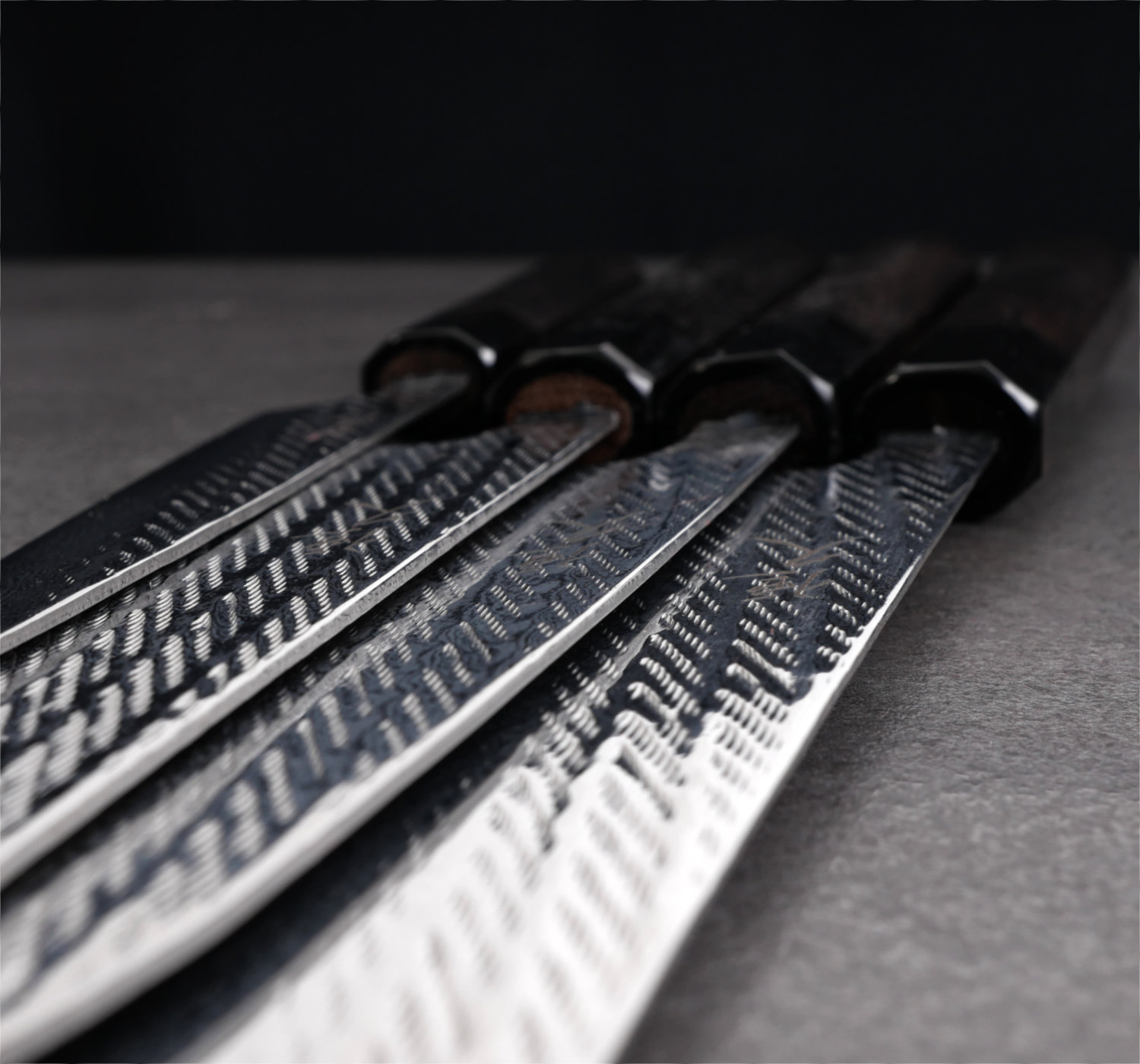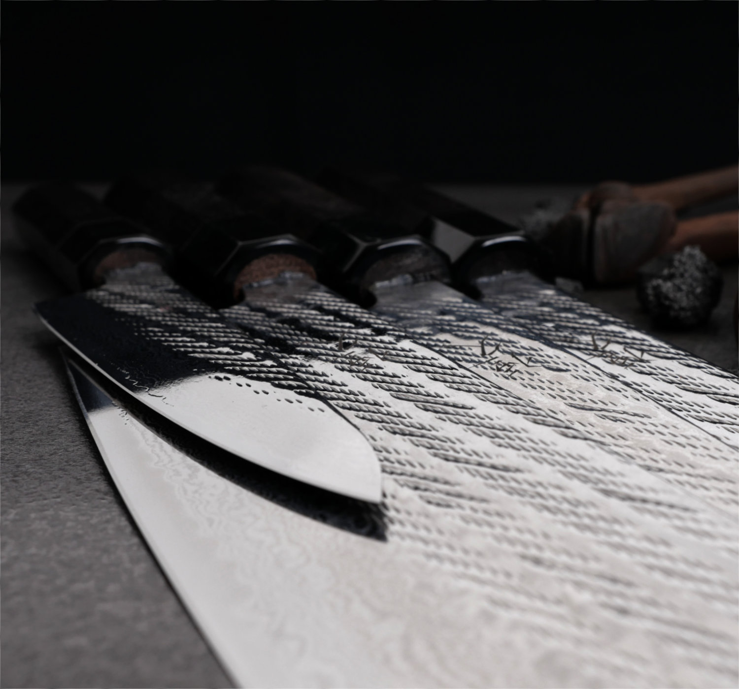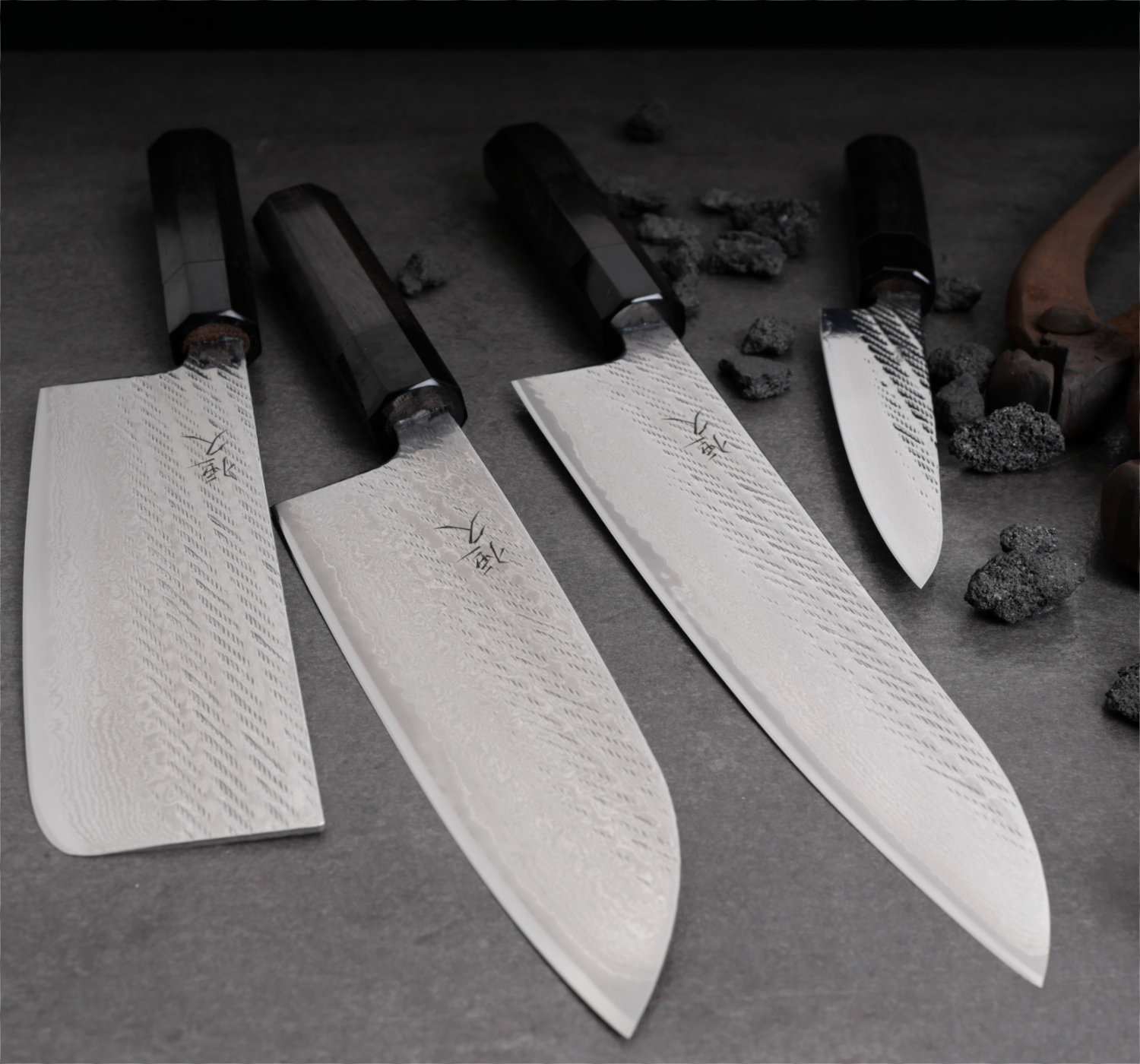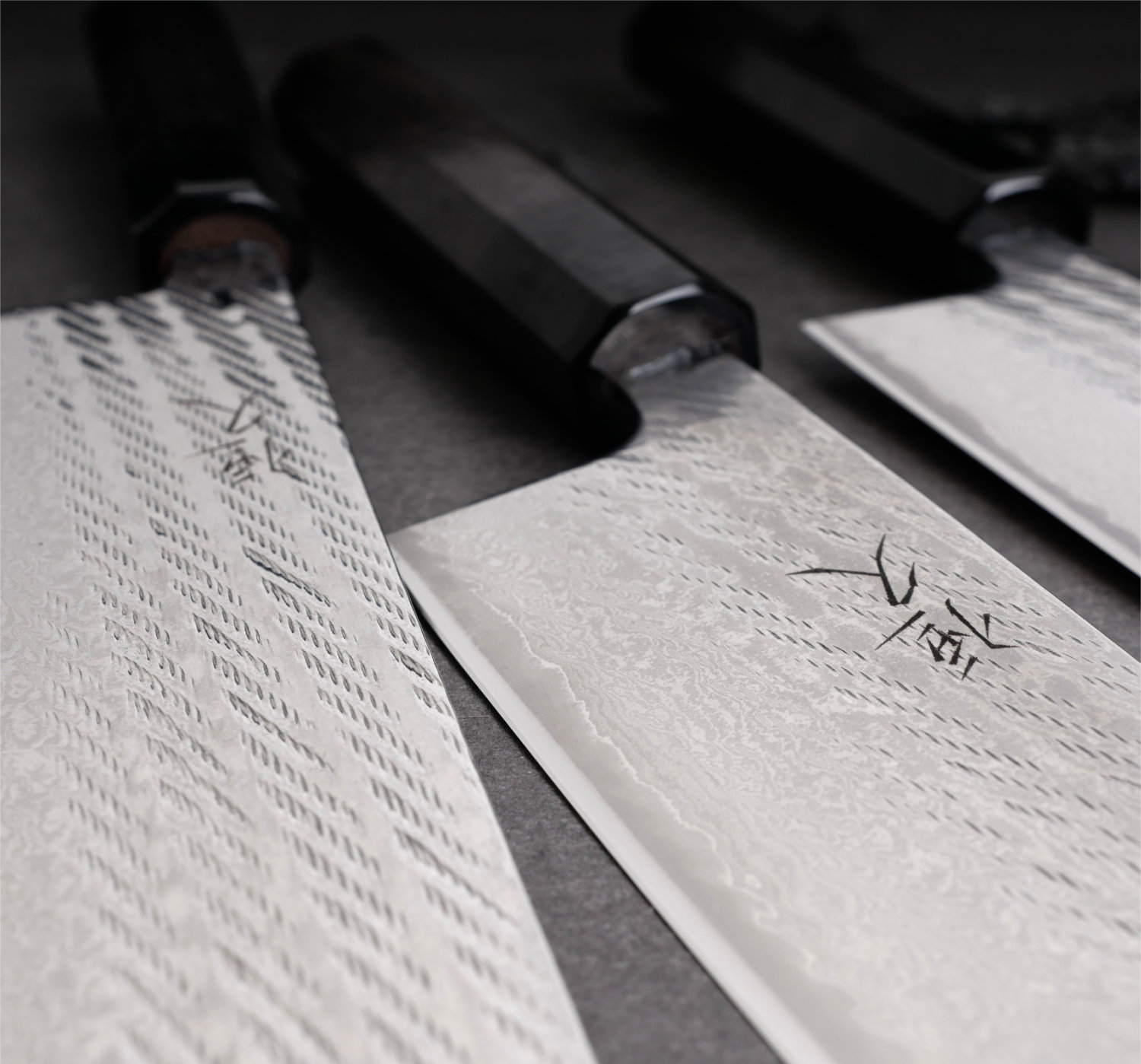 The core steel is called Gingami #3, which is a very fine stainless steel with a hardness of 61 HRC. Around the core steel are several layers of stainless steel (called Damascus steel) with a spectacular texture that has been polished to a mirror finish.