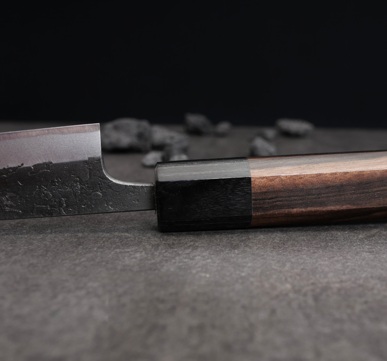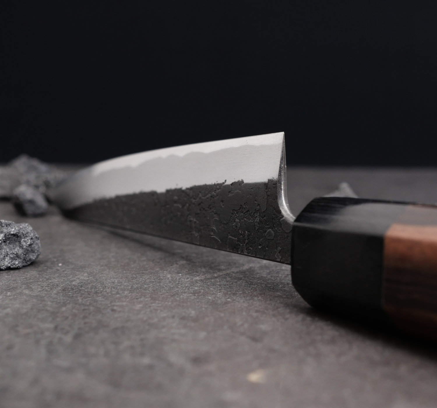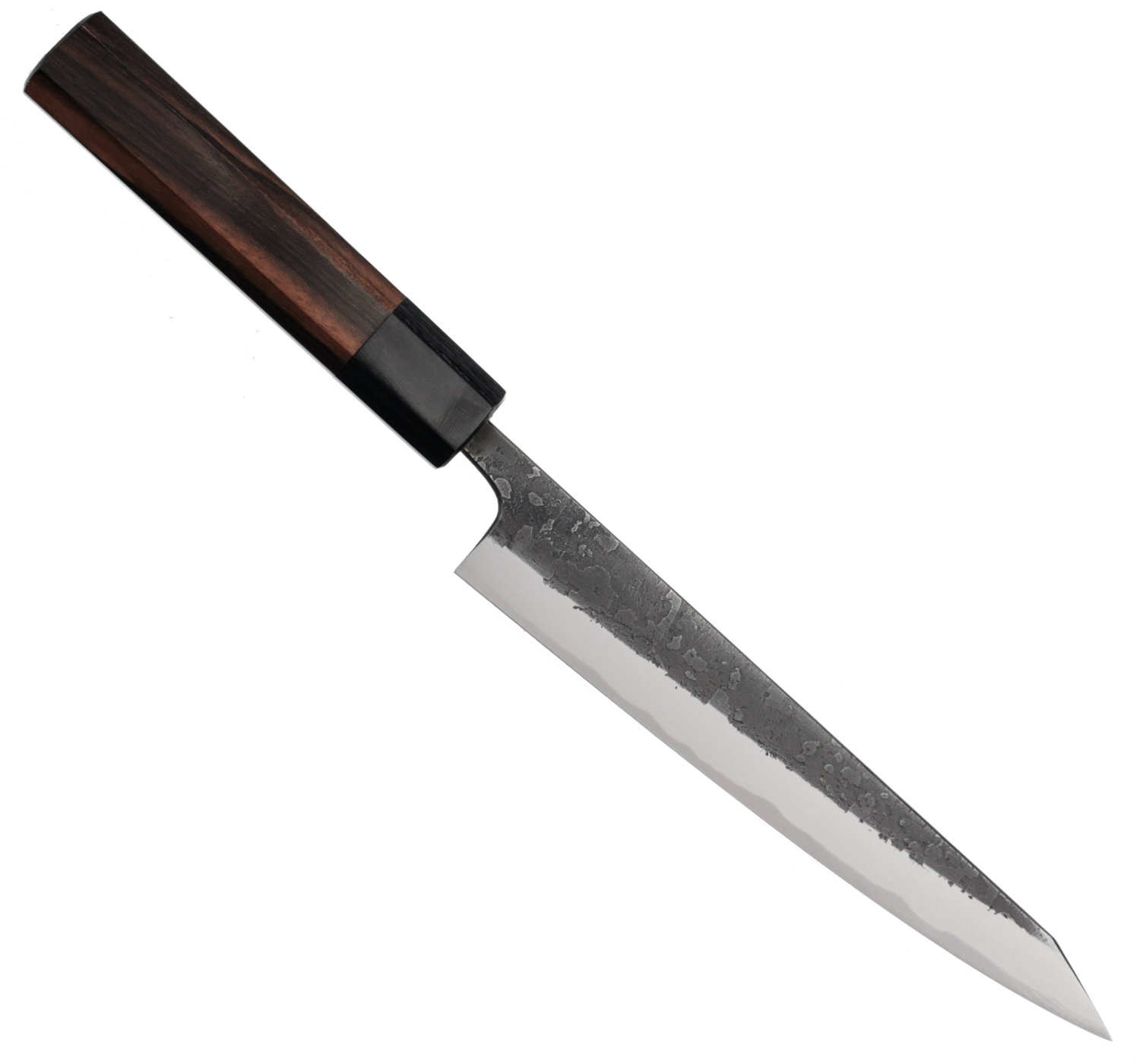 The blade’s finish is called nashiji kurouchi, a rough, blackened surface. Despite the raw finish, Wakui has rounded all edges and given the blade smooth contours. He skillfully tapers the blade (narrowing from spine to tip), resulting in excellent balance and feel.