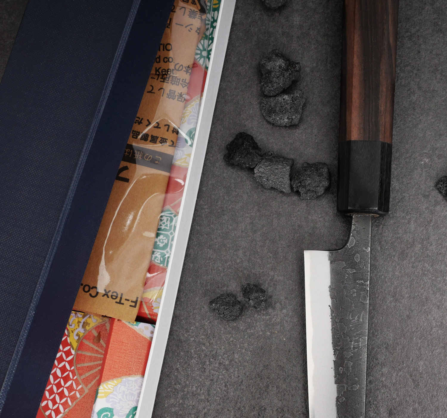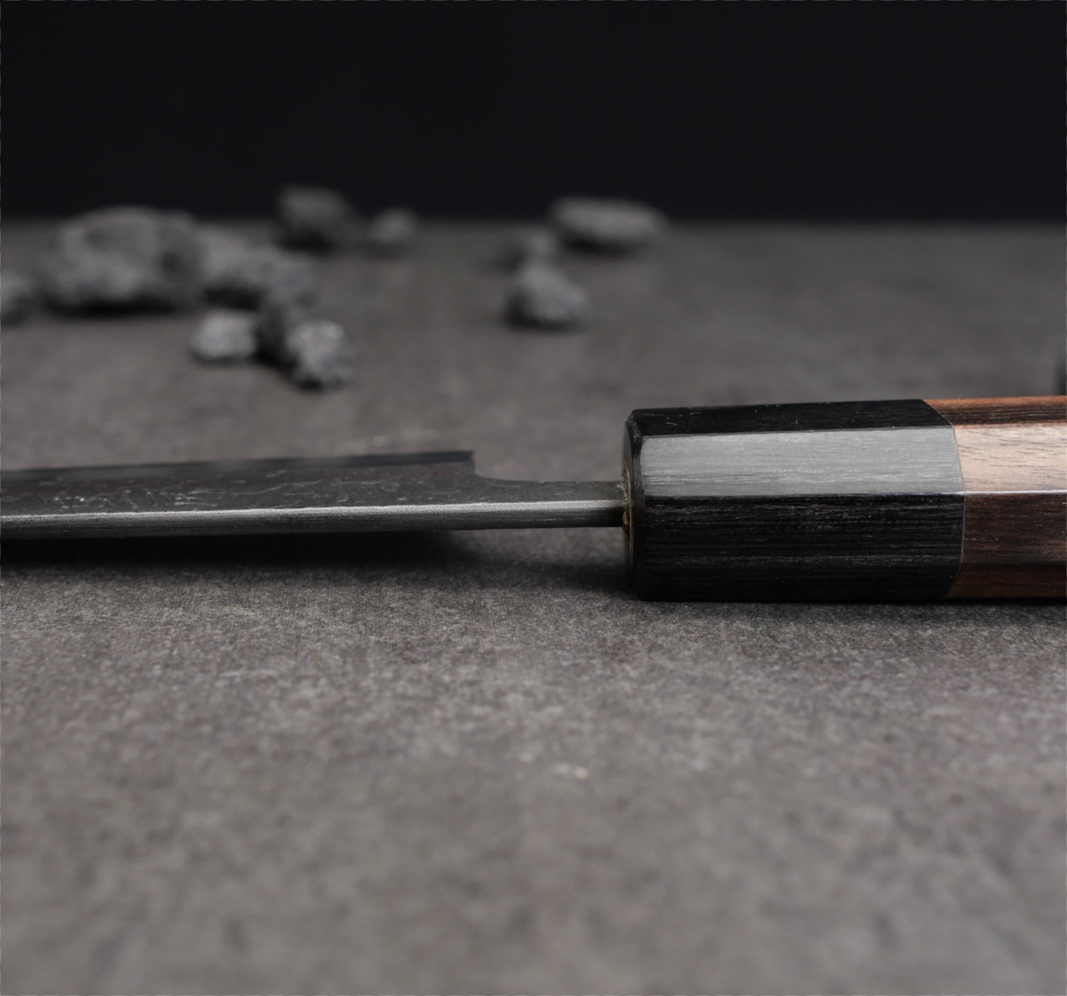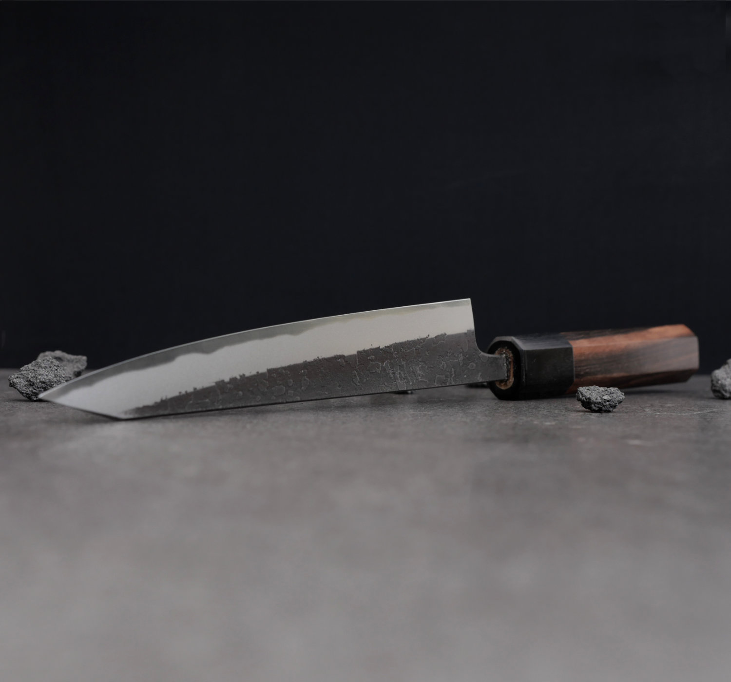 The blade’s finish is called nashiji kurouchi, a rough, blackened surface. Despite the raw finish, Wakui has rounded all edges and given the blade smooth contours. He skillfully tapers the blade (narrowing from spine to tip), resulting in excellent balance and feel.