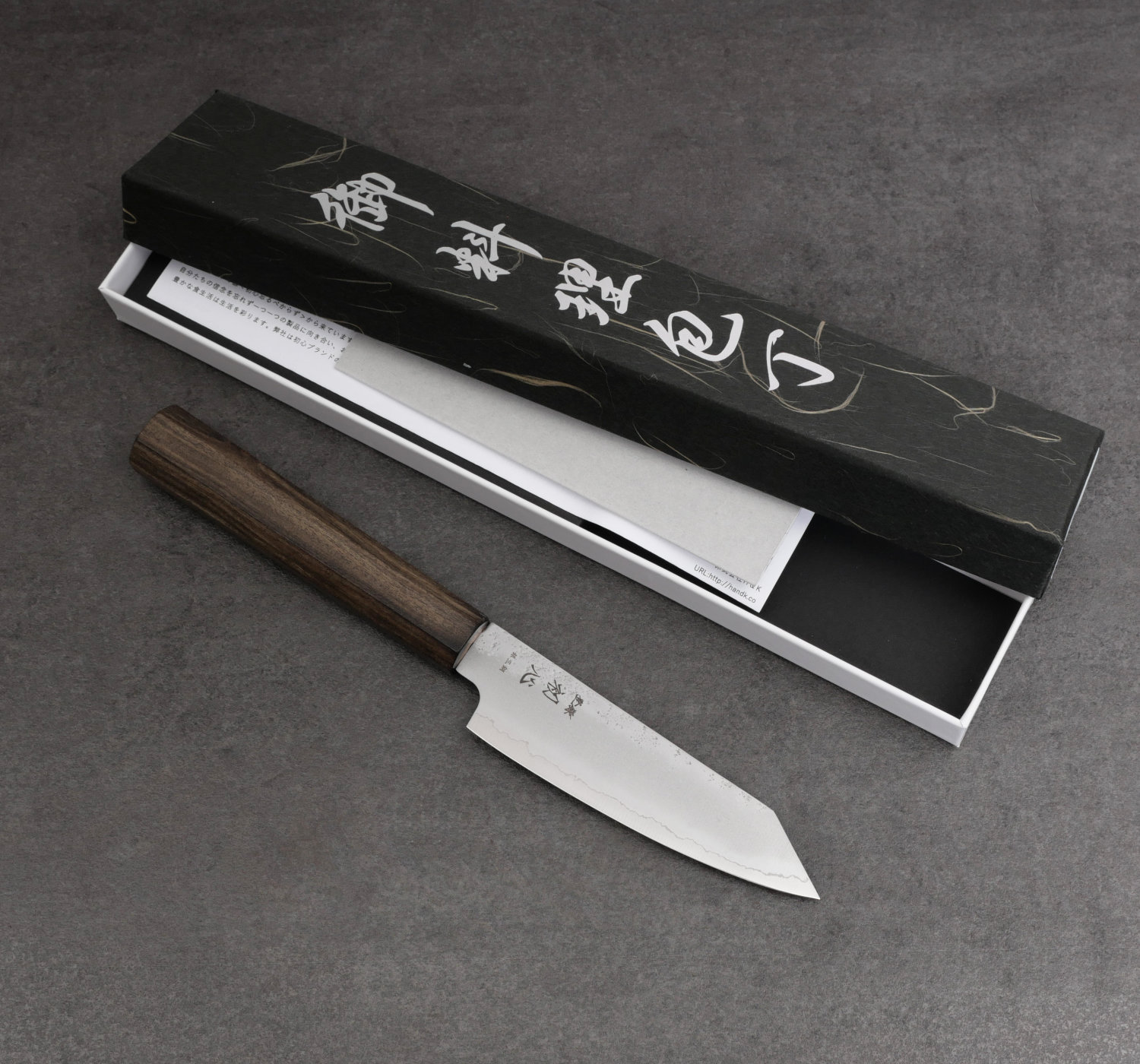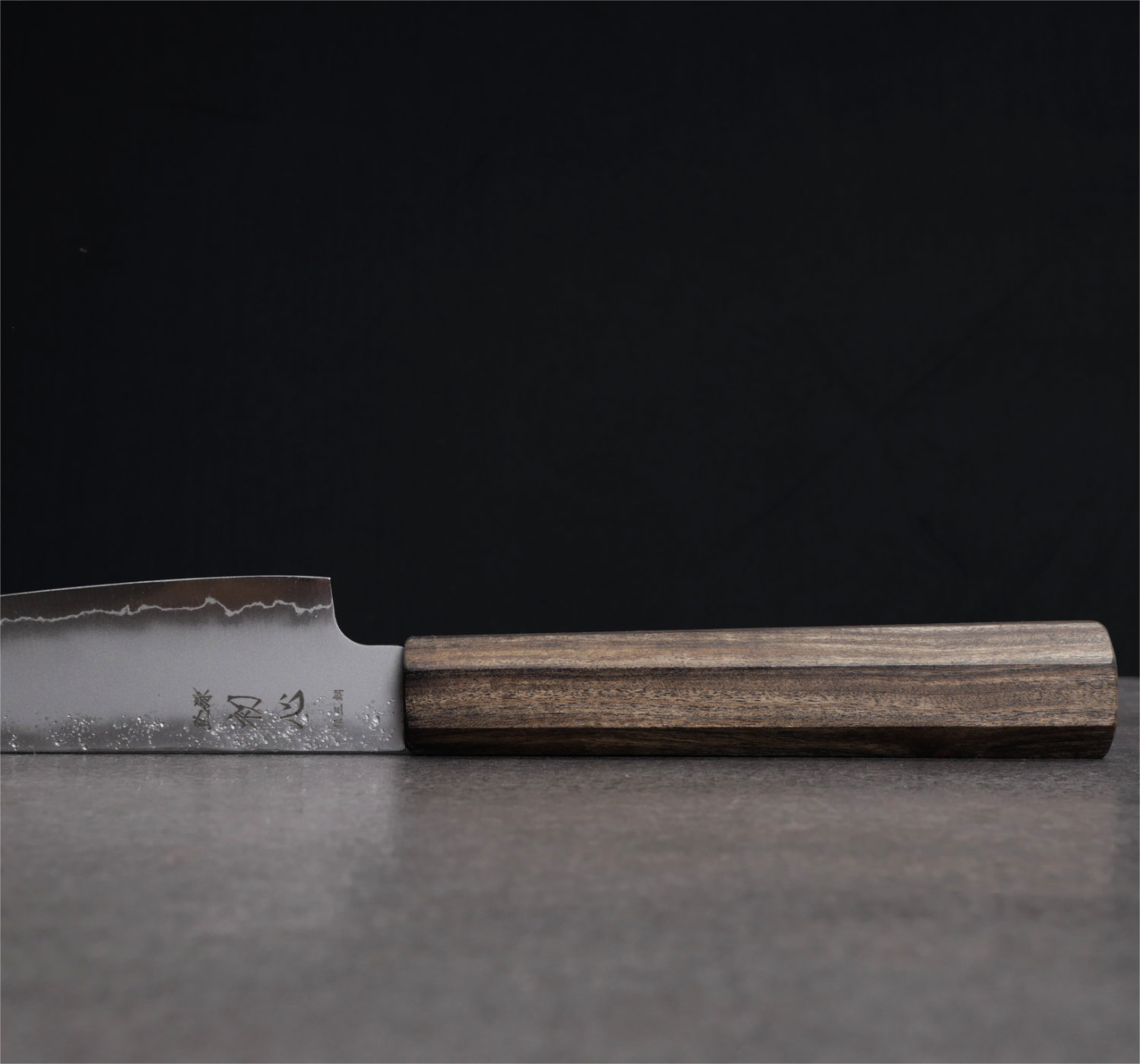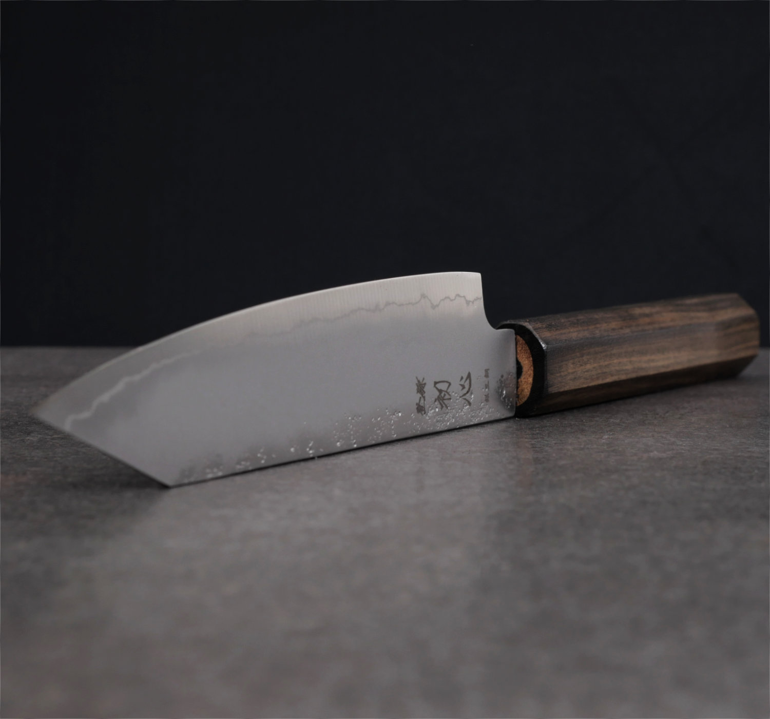 The Hatsukokoro Ginrei is an affordable yet high performing knife with a beautiful rustic finish and a thin, refined edge. The core steel is called Gingami #3, a very high-quality stainless steel with a hardness of 61 HRC. Around the core steel are two layers of steel with a coarse nashiji finish, also in stainless steel. The handle is octagonal and made from bubinga wood.