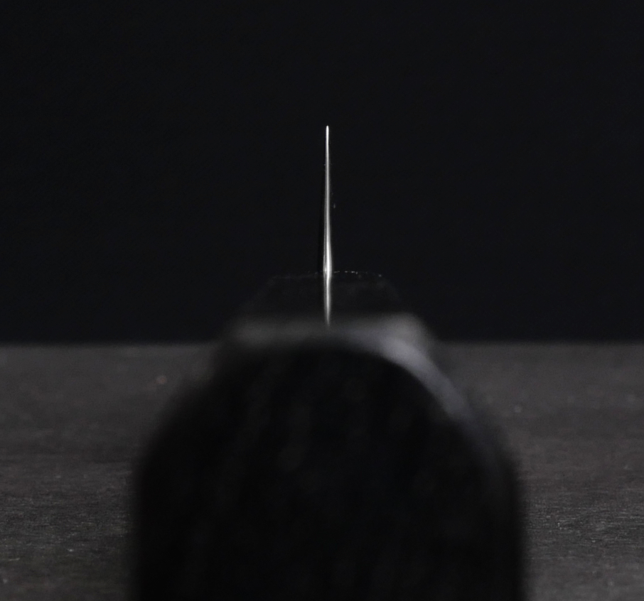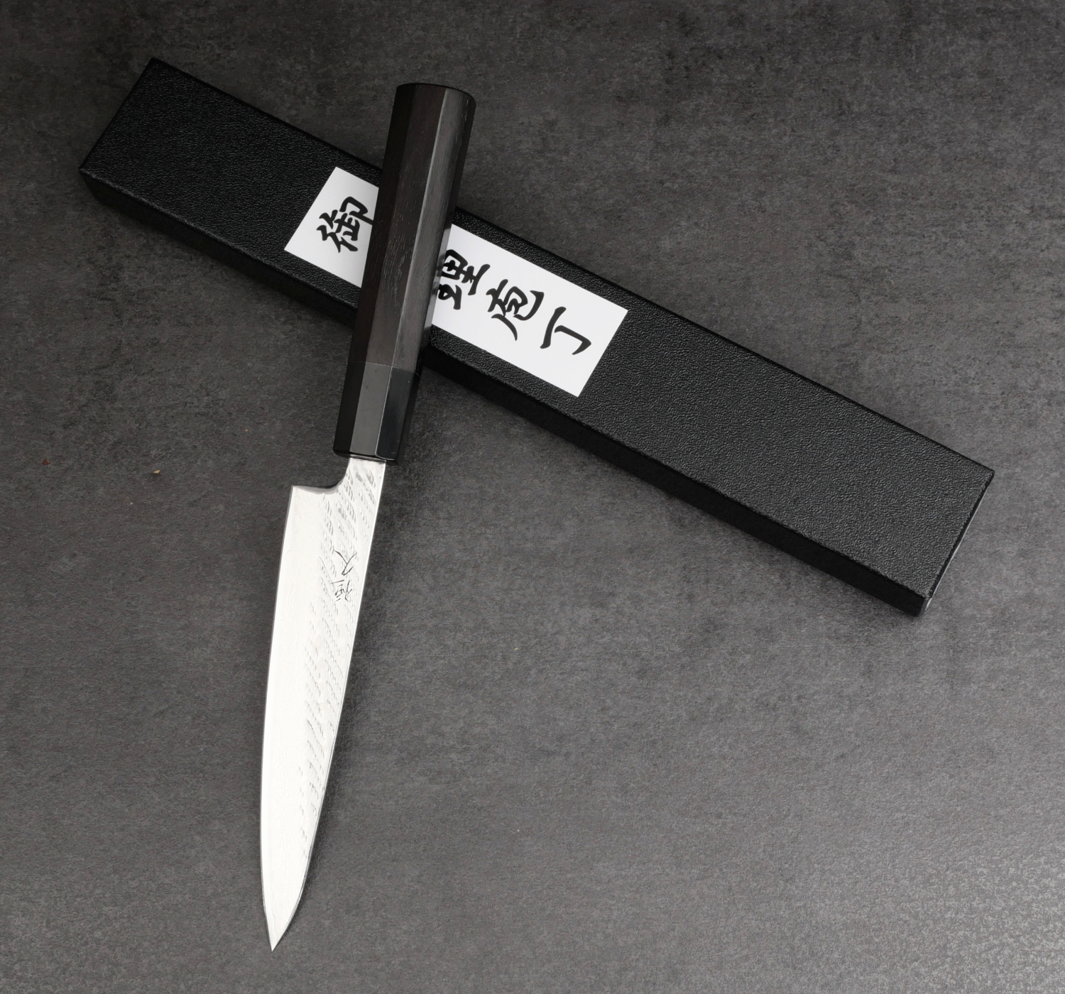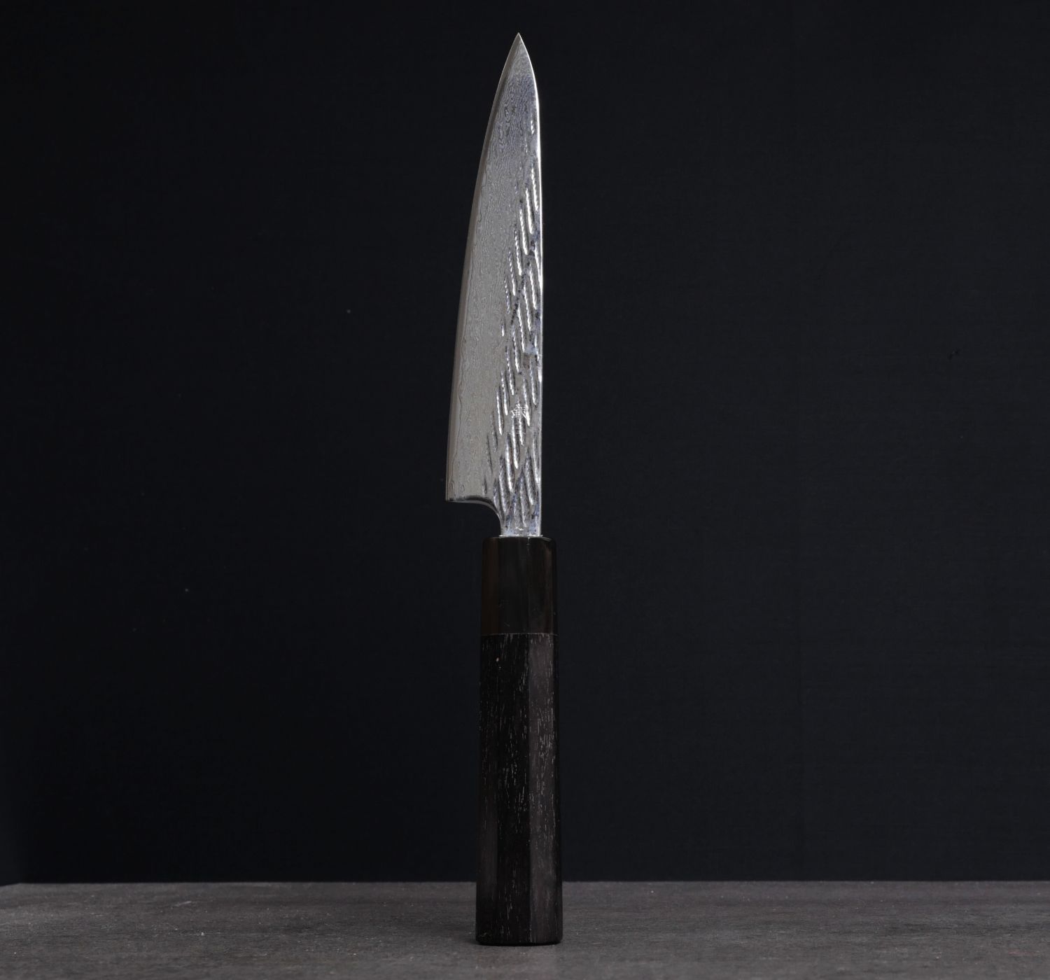 The core steel is called Gingami #3, which is a very fine stainless steel with a hardness of 61 HRC. Around the core steel are several layers of stainless steel (called Damascus steel) with a spectacular texture that has been polished to a mirror finish.