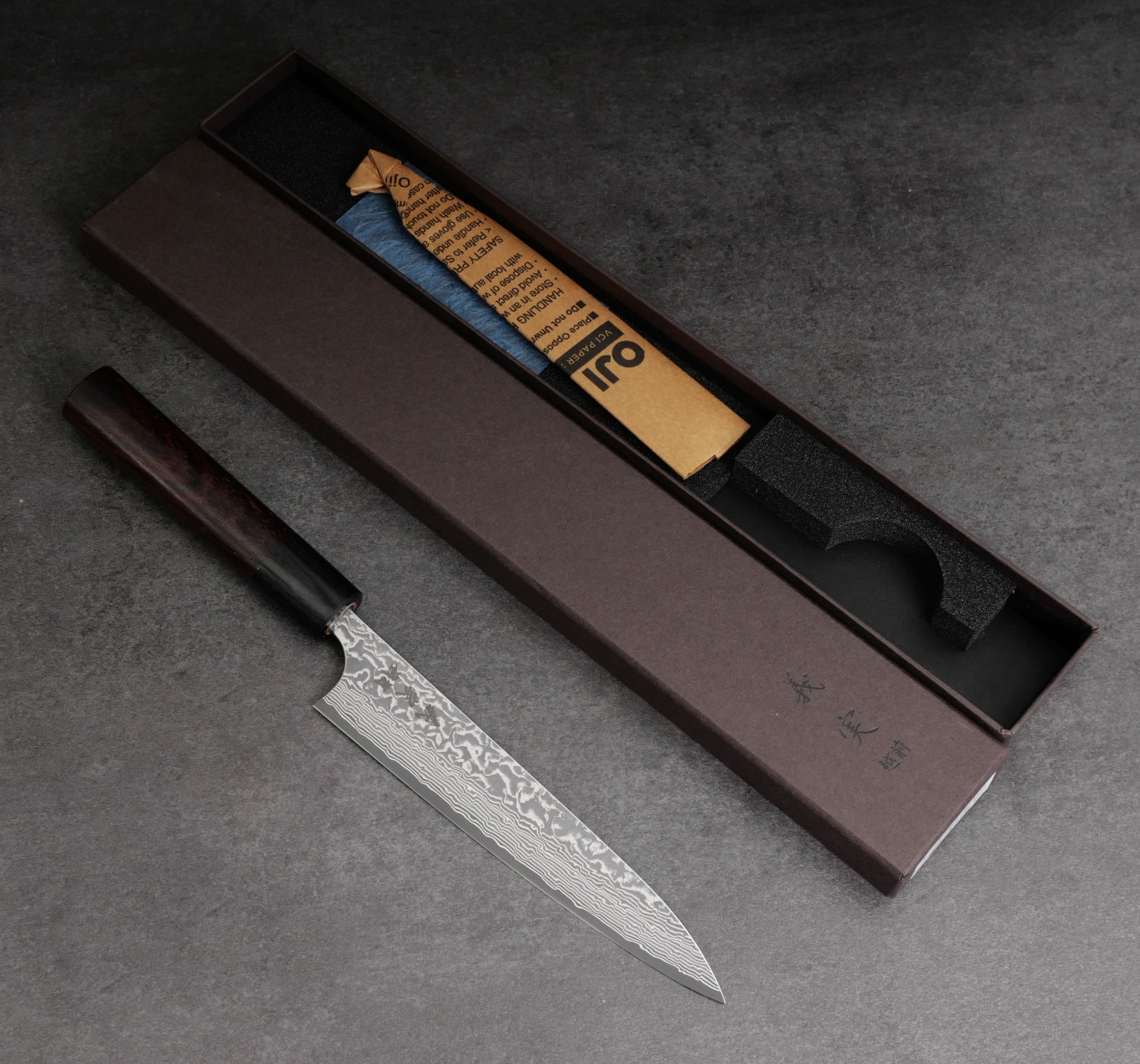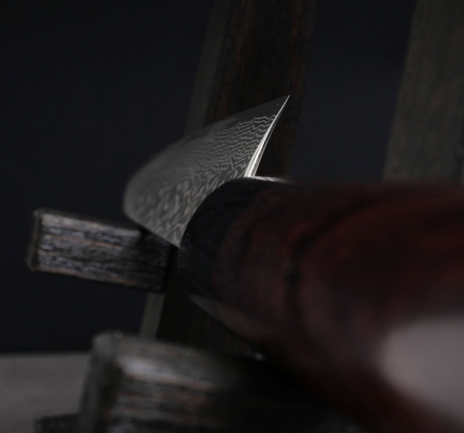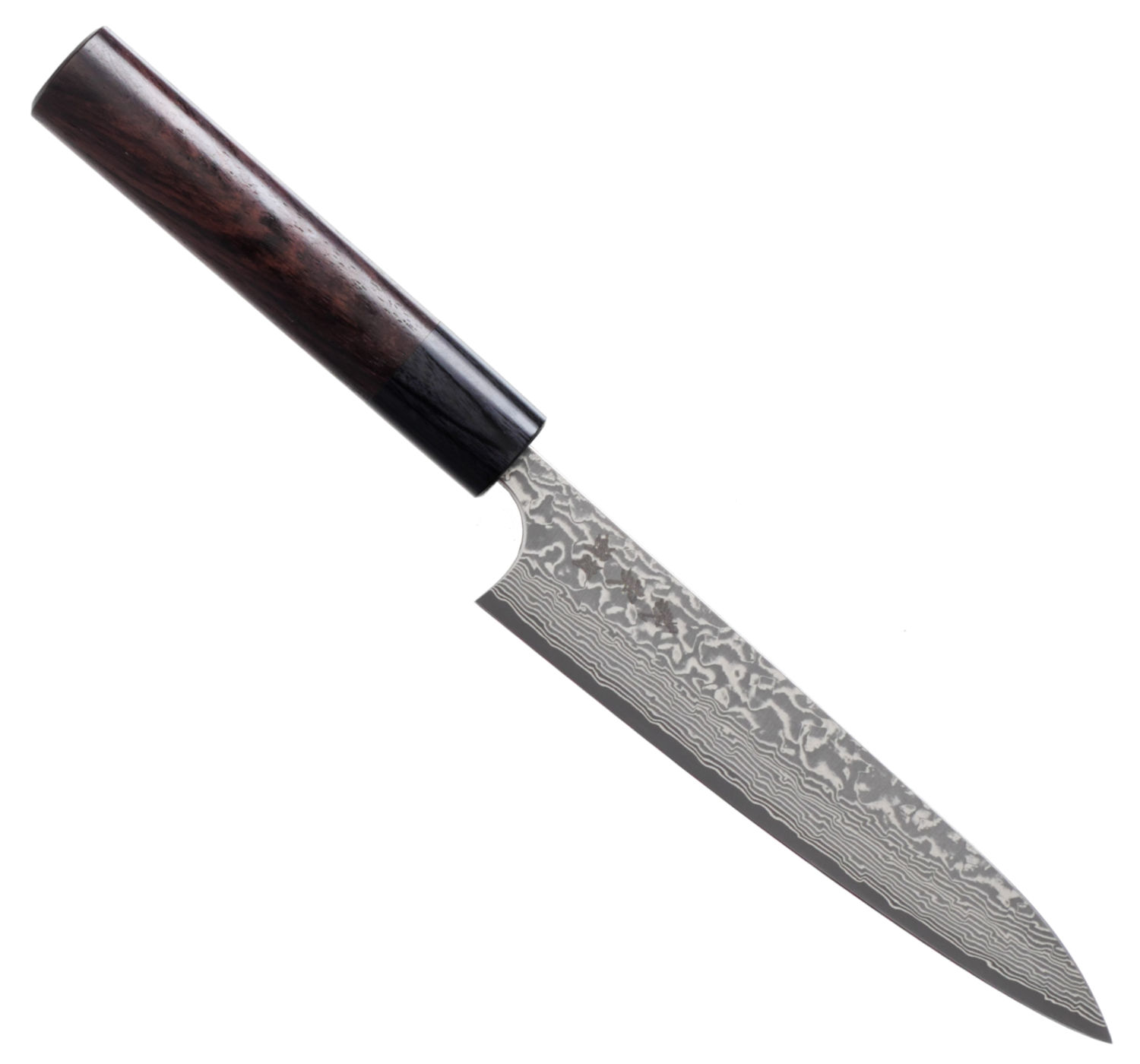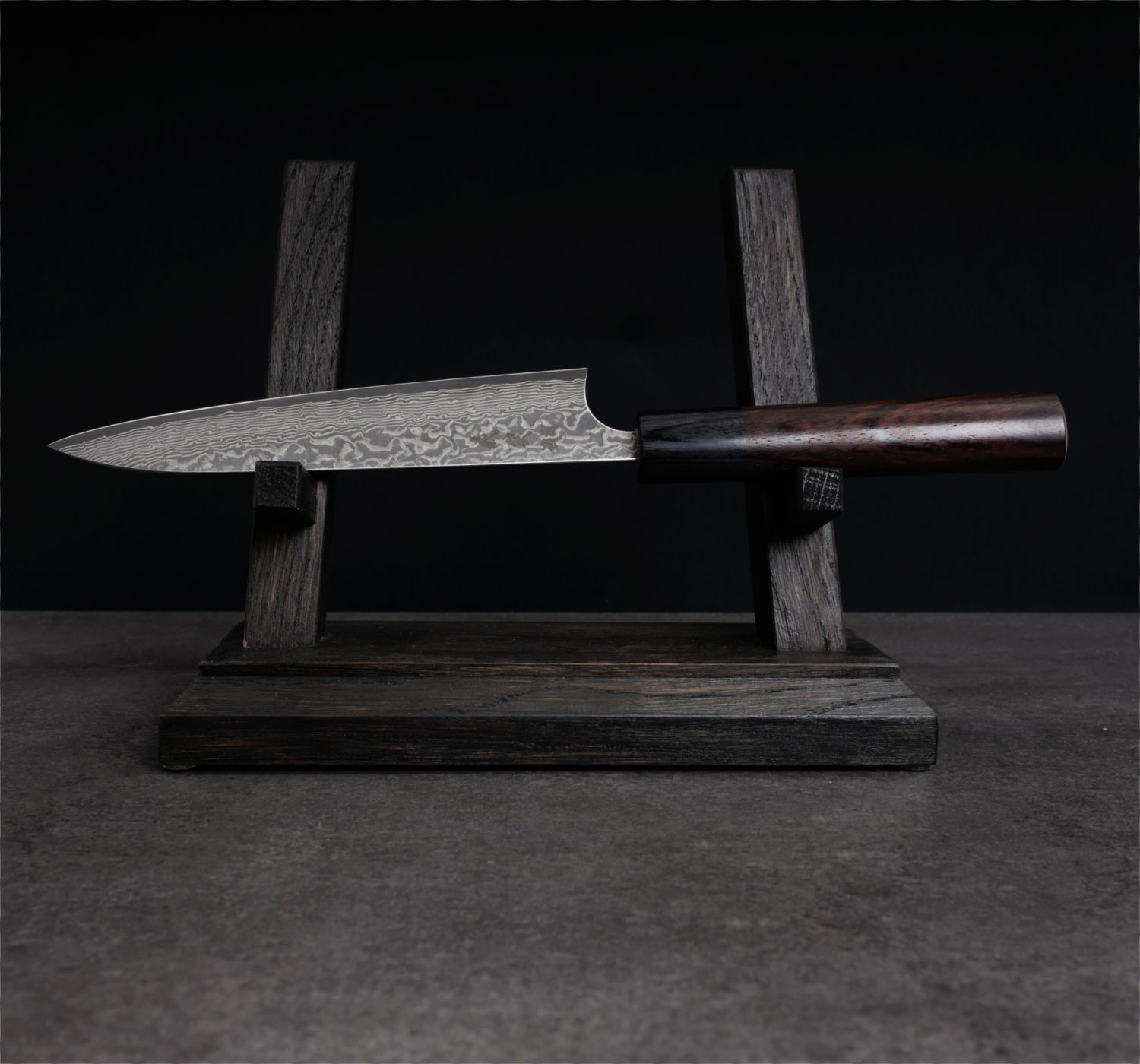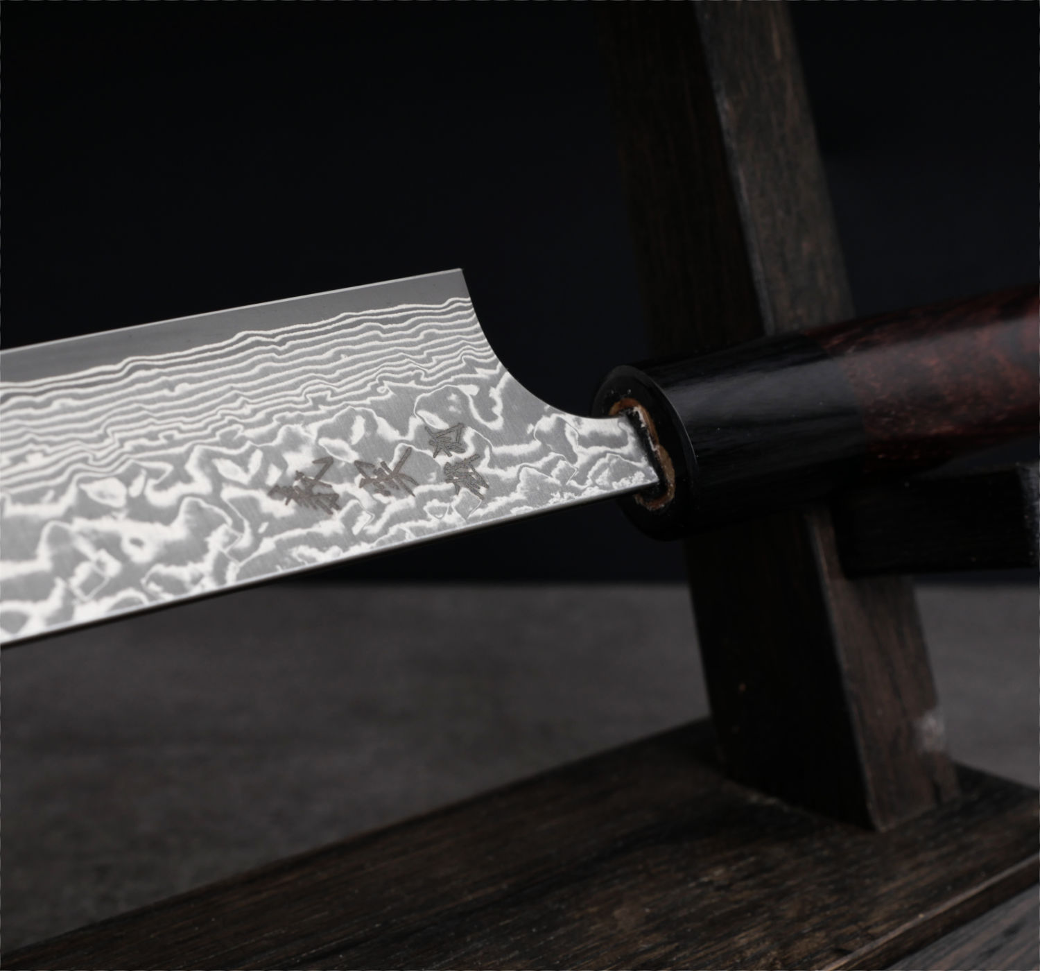 Yoshimi Kato is a highly talented blacksmith from the town of Takefu in Japan. In this beautiful knife series, he combines a VG-10 core steel with a cladding of nickel Damascus. The result is a striking contrast between bright and dark, creating a truly spectacular appearance. The knife fits perfectly in the hand, and the thin blade can be sharpened to a razor-like edge.