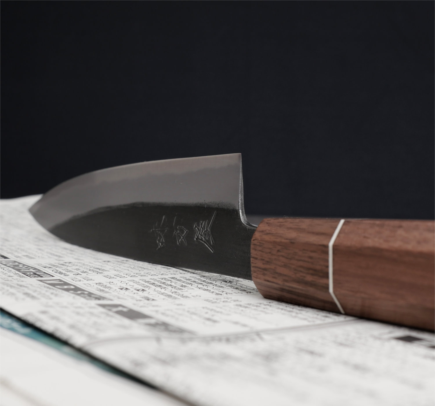 The blades in the Ajikataya series feature a beautiful nashiji-kurouchi finish, characterized by a coarse, black-oxidized surface that gives a rustic and genuine feel. The final edge is adorned with a stunning kasumi finish, which enhances the contrast between the polished core steel and the softer outer layer. This misty and silky kasumi finish is rare and elevates the knife’s aesthetic appeal.