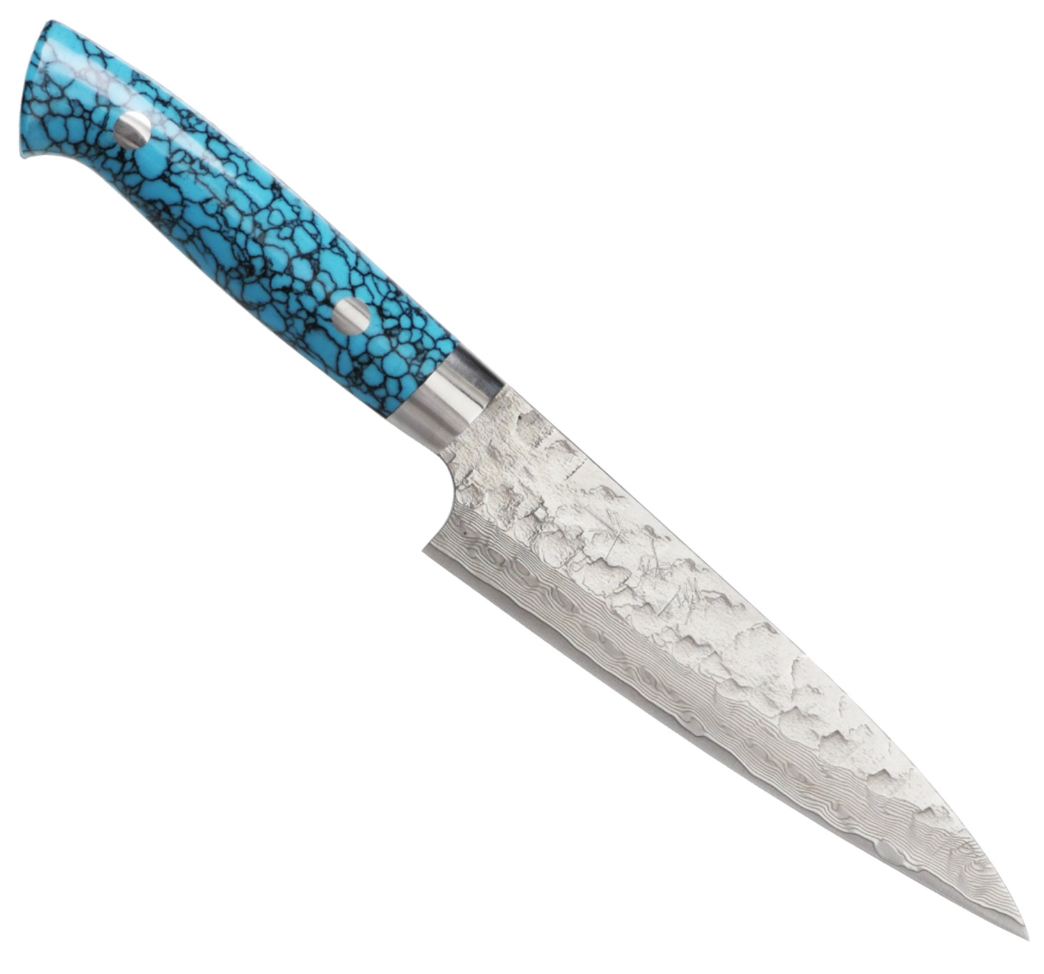 A beautiful masterpiece by Takeshi Saji. This petty knife has a 132 mm blade crafted from VG-10 core steel with stunning damascus cladding.