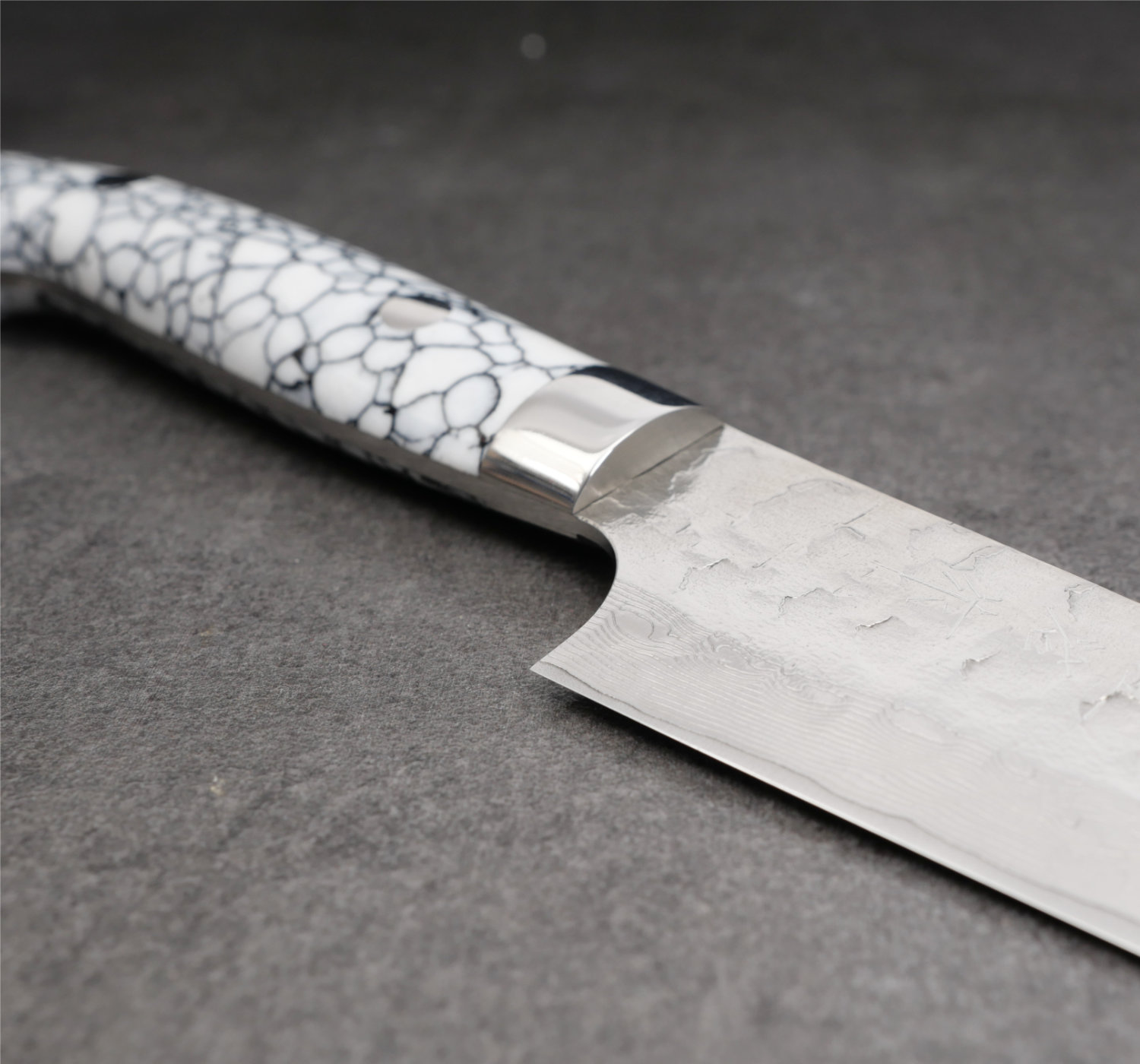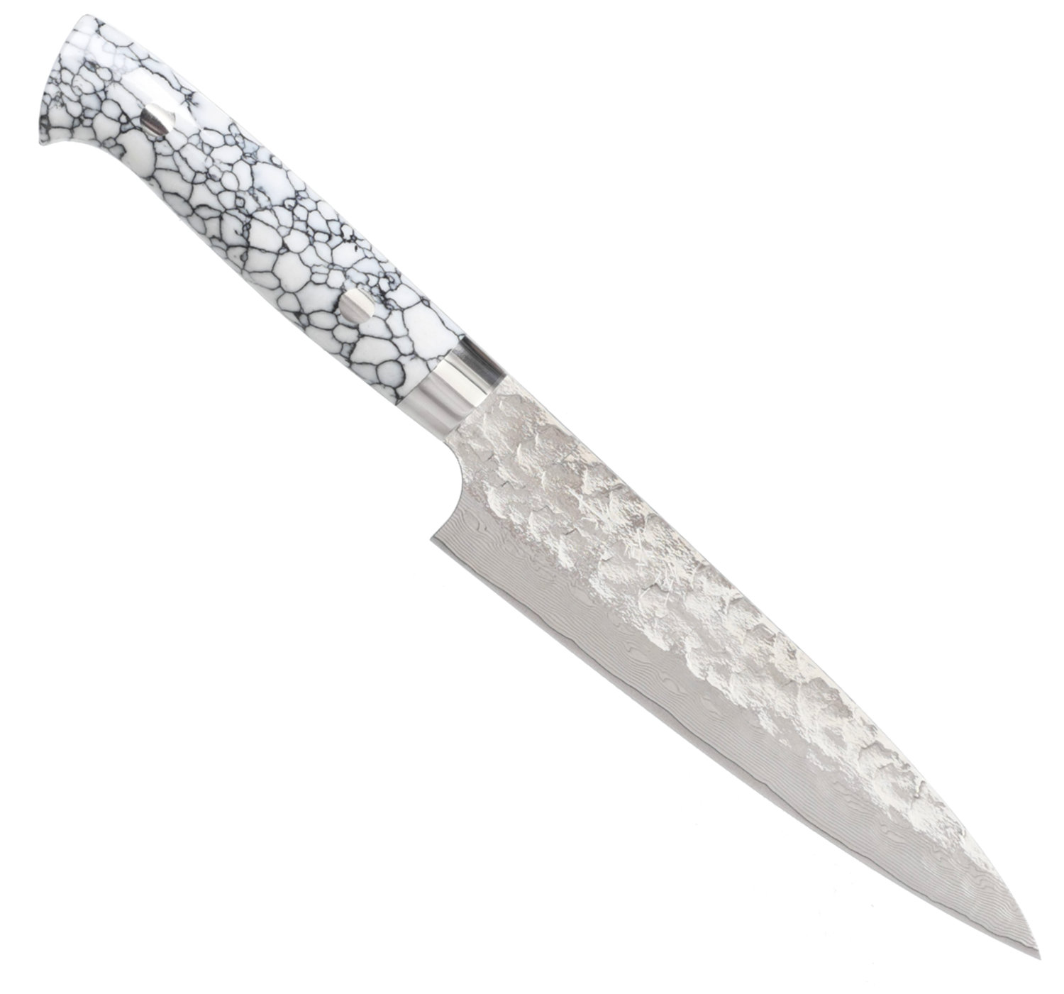 A beautiful masterpiece by Takeshi Saji. This petty knife has a 145 mm blade crafted from VG-10 core steel with stunning damascus cladding.
