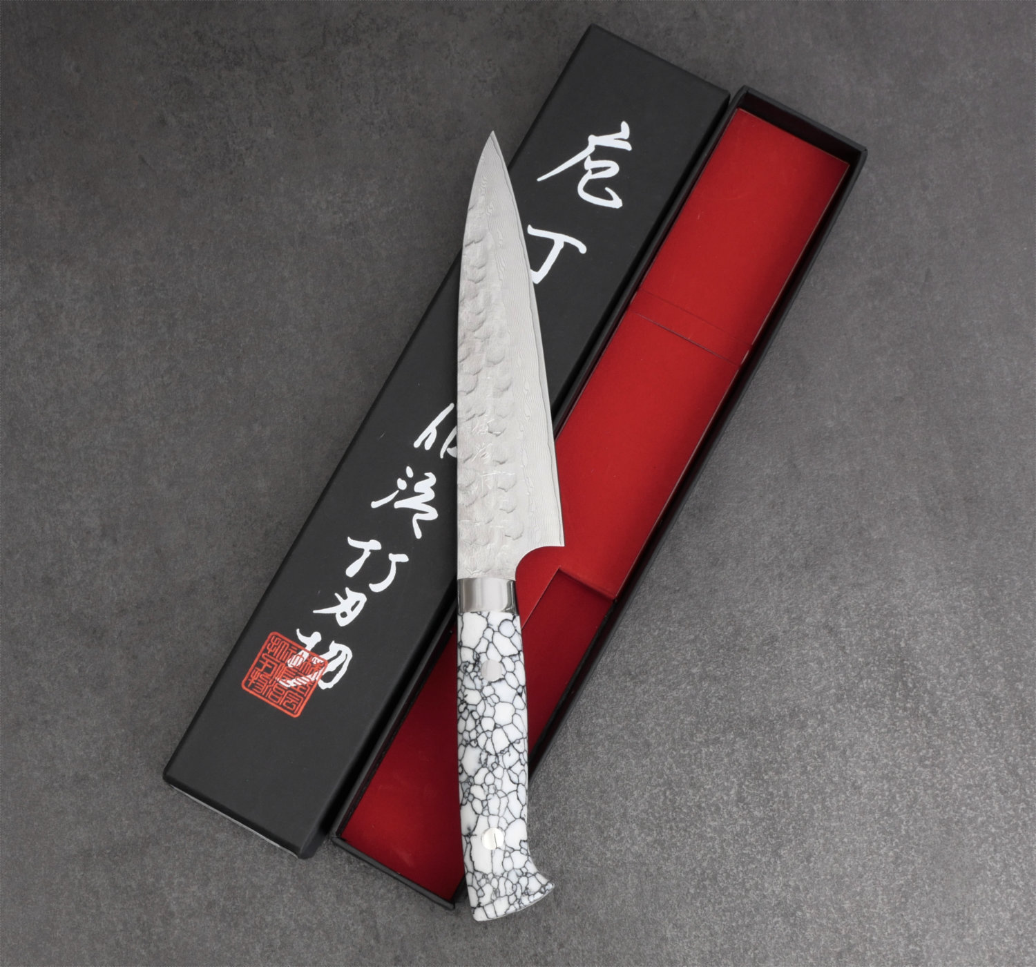 This luxurious piece is handcrafted in Saji’s forge in Takefu, Japan. Takeshi Saji has long held the esteemed title of “Dento Kogeishi” (Traditional Master Craftsman) — an honor awarded by the Japanese government to the nation’s most skilled artisans.