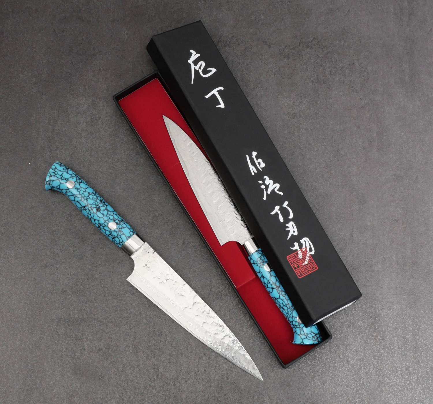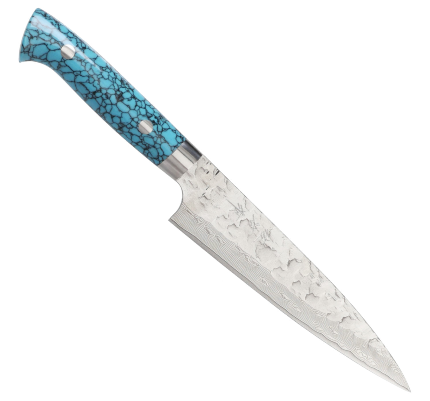 A beautiful masterpiece by Takeshi Saji. This petty knife has a 150 mm blade crafted from VG-10 core steel with stunning damascus cladding.