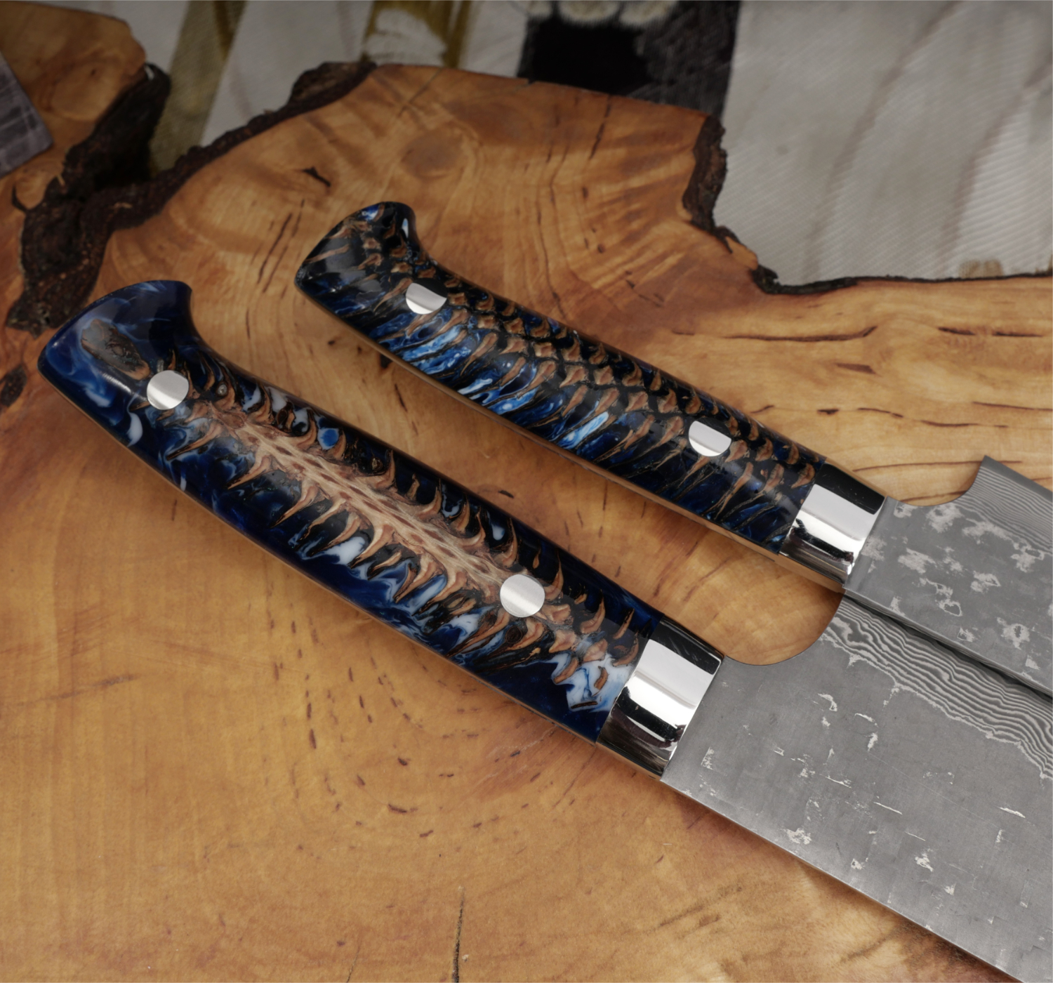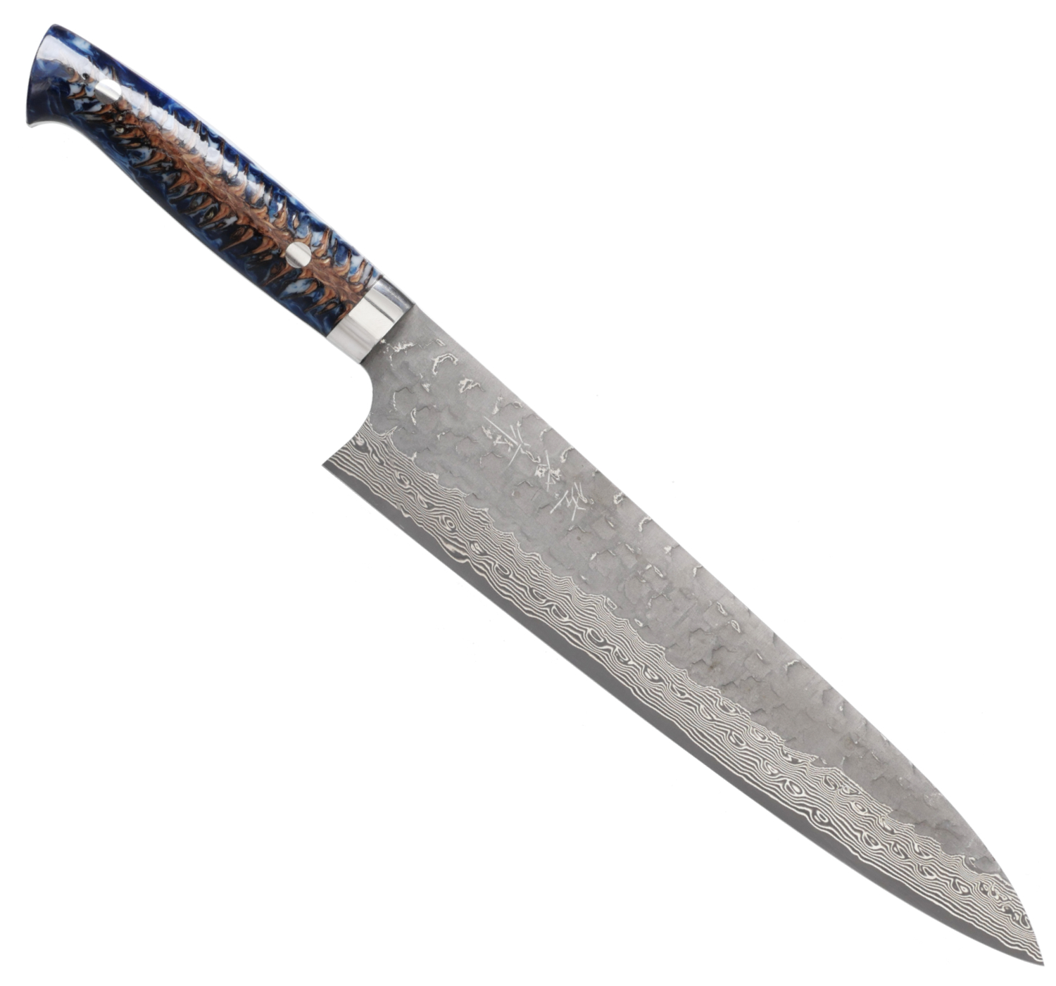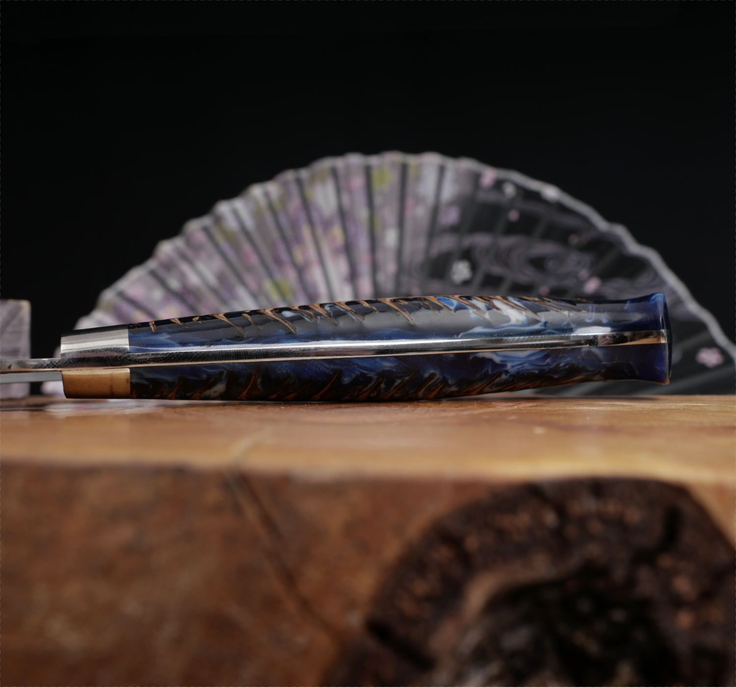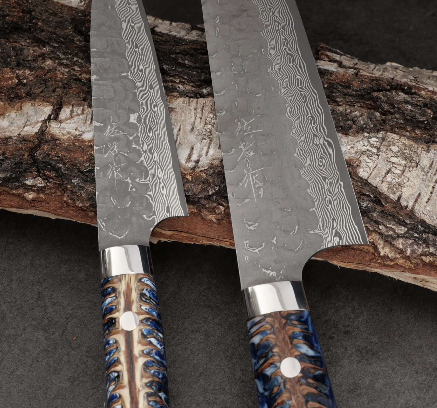 A luxuriously beautiful knife with outstanding design. The blade’s layers of nickel Damascus contrast finely with the grey cladding. The handle is made from stabilized pinecone. This is a truly beautiful and luxurious knife, hand-forged by the blacksmith Takeshi Saji. He works in the Japanese city of Takefu, and Saji has long held the esteemed title of Dento Kogeishi, a title awarded by the Japanese government to the country’s most skilled artisans.