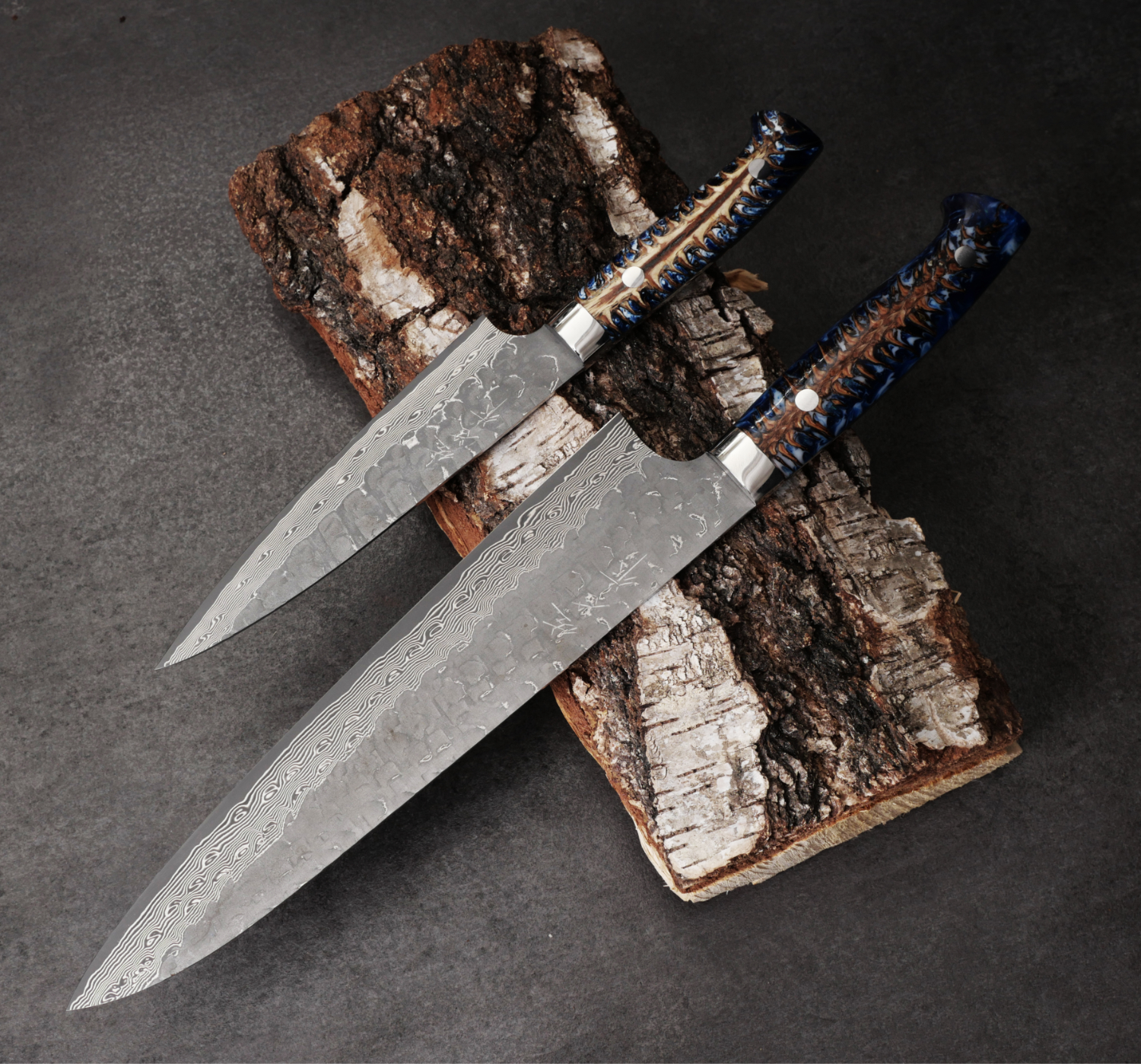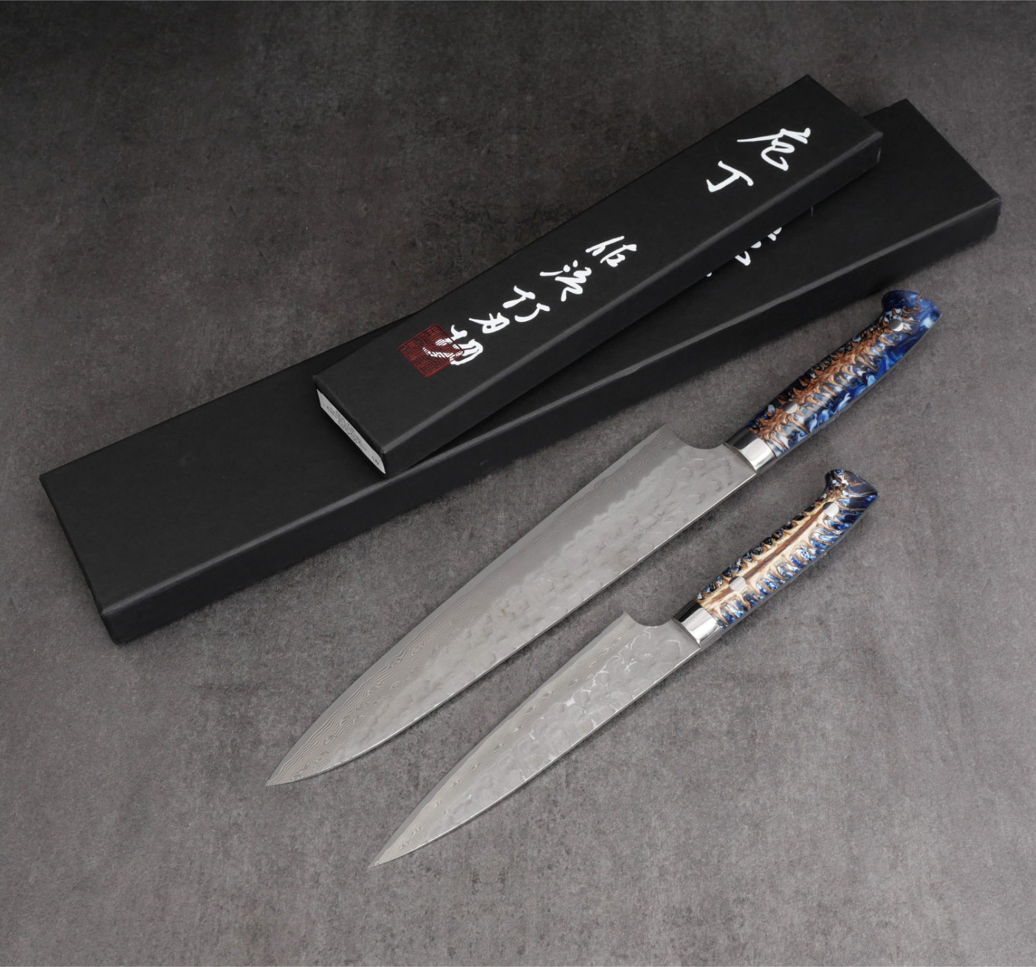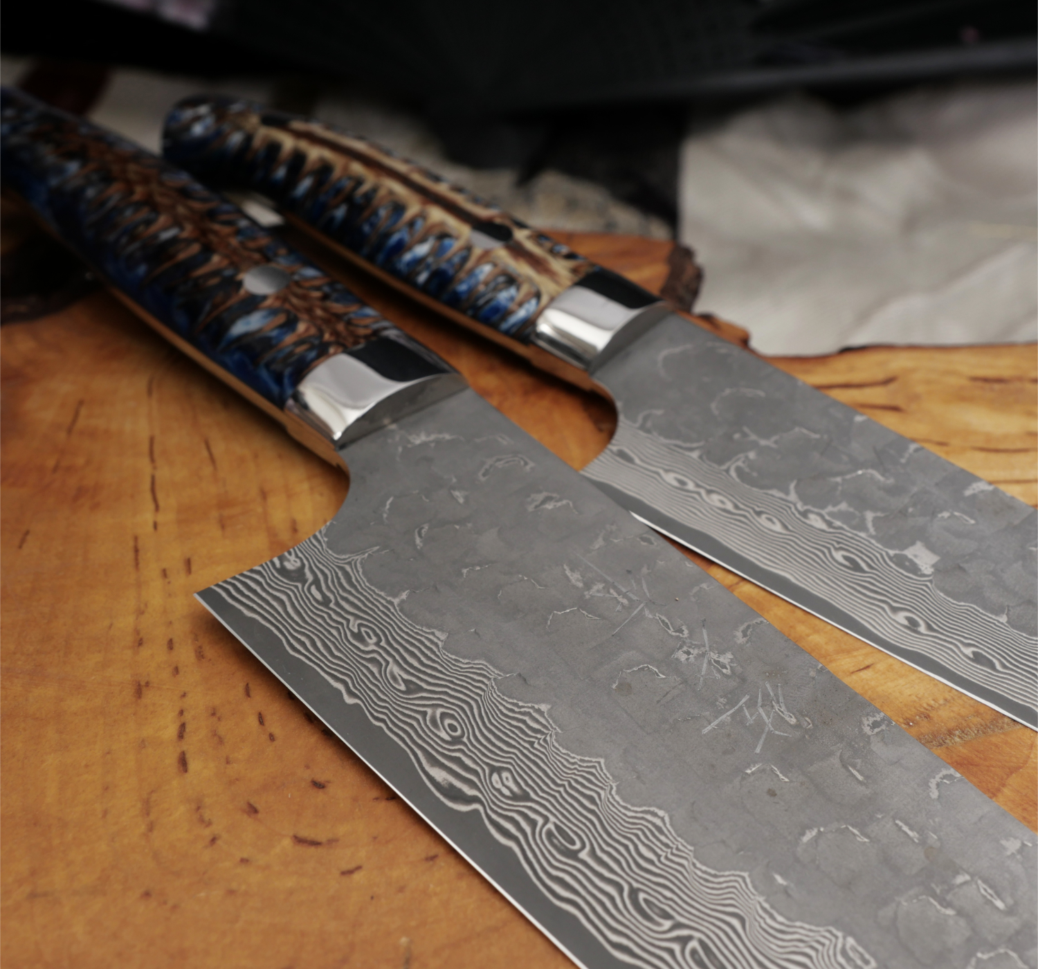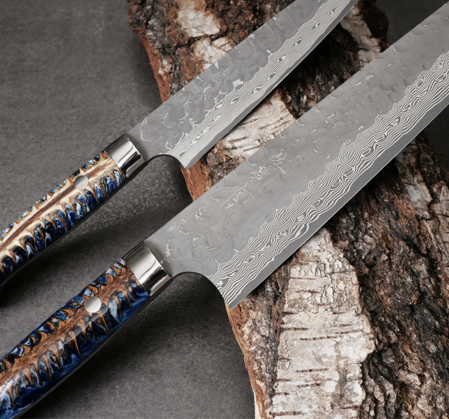 A luxuriously beautiful knife with outstanding design. The blade’s layers of nickel Damascus contrast finely with the grey cladding. The handle is made from stabilized pinecone. This is a truly beautiful and luxurious knife, hand-forged by the blacksmith Takeshi Saji. He works in the Japanese city of Takefu, and Saji has long held the esteemed title of Dento Kogeishi, a title awarded by the Japanese government to the country’s most skilled artisans.