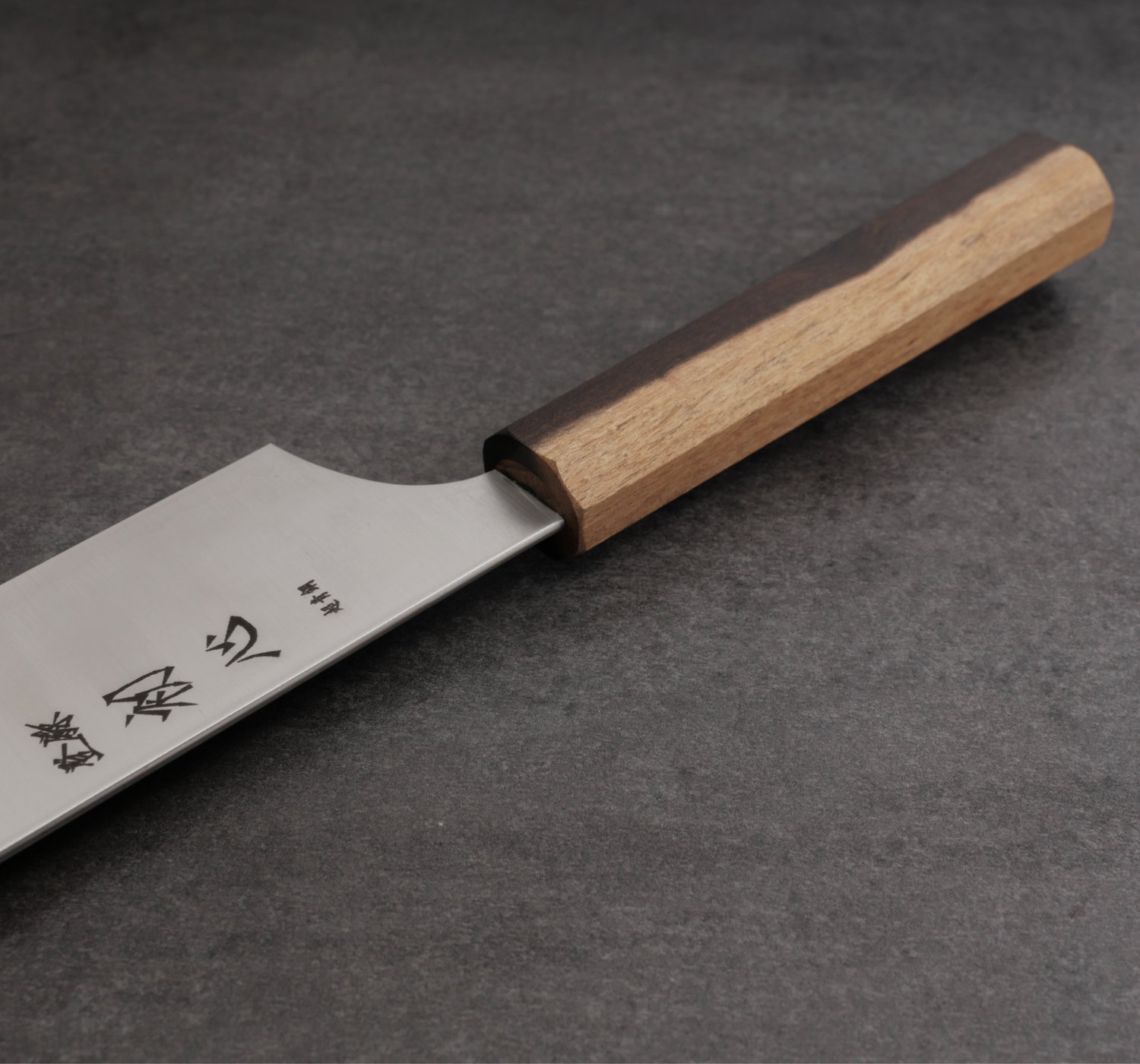 The blade has a three-layer construction with Aogami Super carbon steel as the core and stainless steel cladding. The blades are relatively thin and come extremely sharp. The hard carbon steel helps the knife retain its edge for a long time, while corrosion resistance is also very good for Aogami Super—especially considering it is paired with stainless steel blade sides.