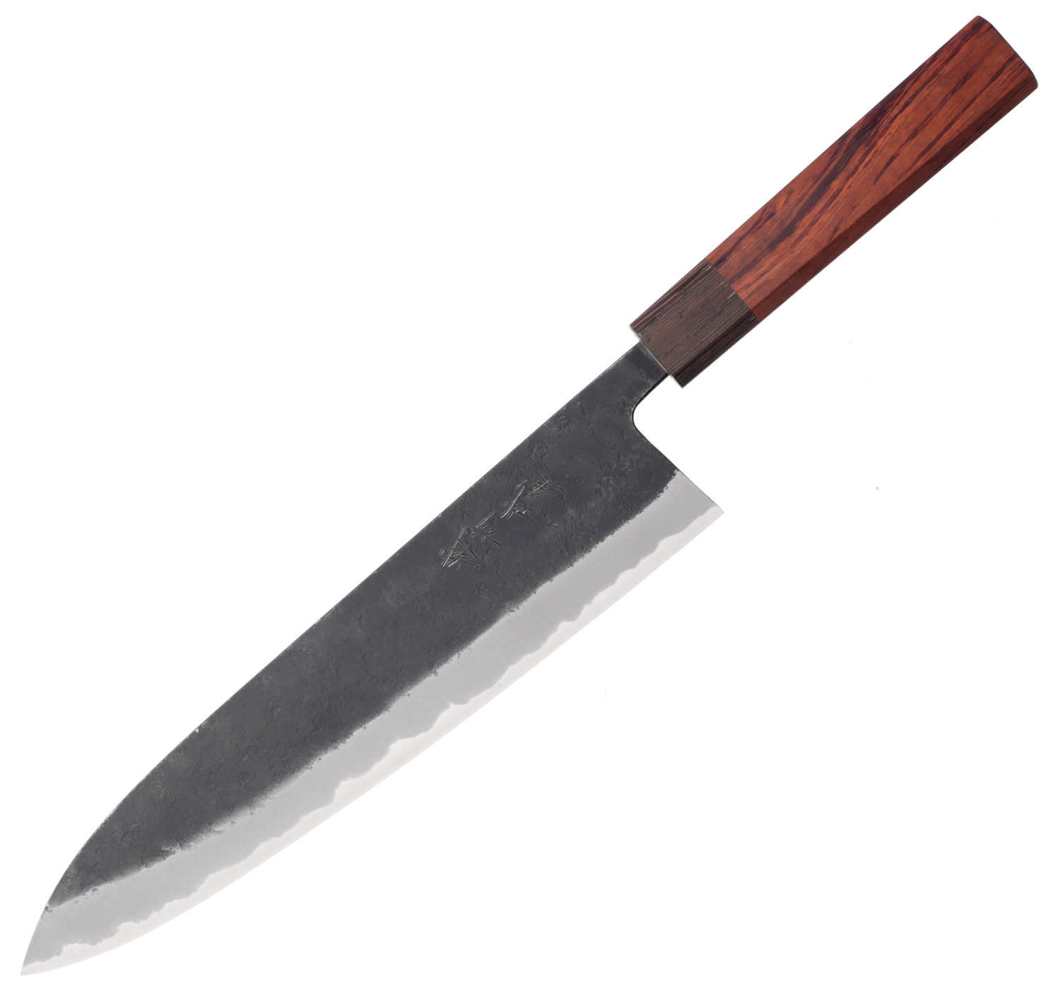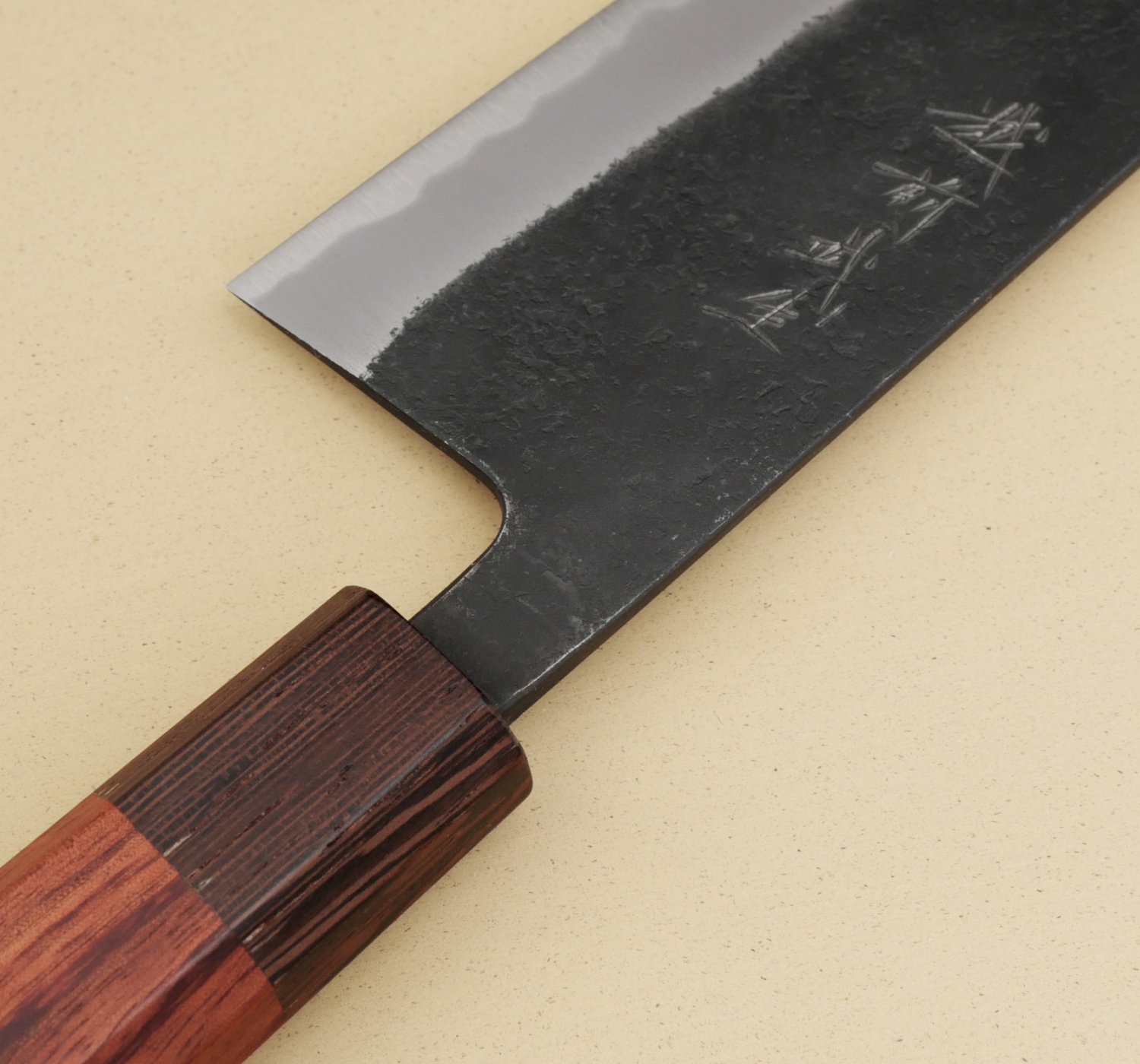 Shiro Kamo 'Kazan' is a hand-forged precision instrument from one of the biggest names in Takefu, Japan. Shiro Kamo forges thin and delicate blades with nice tapering. The thin core steel of shirogami #2 takes an extremely sharp edge and the high carbon content makes the knife easy to hone and to sharpen. Around the core steel is a layer of soft iron on each side. This coat has black oxidized kurouchi and a light nashiji finish. Nashiji means pear skin in Japanese and it is a way to provide the blade sides with a rough surface and a unique look. The handle is oktagon shaped in satin wood with pakka wood ferrule.