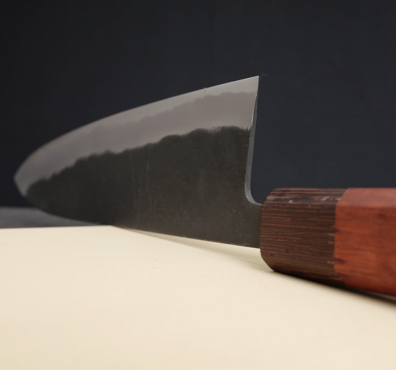 NOTE: Shirogami #2 is not stainless. The clad around the core steel is made of iron and is not stainless either. Remember to always keep the edge dry to avoid rusting, and feel free to put some oil on the blade. It increases luster and keeps rust away. Since the steel is reactive, a patina will occur relatively quickly. If you cut into proteins, a blue and green patina arises, while vegetables give more of a gray and brownish patina.