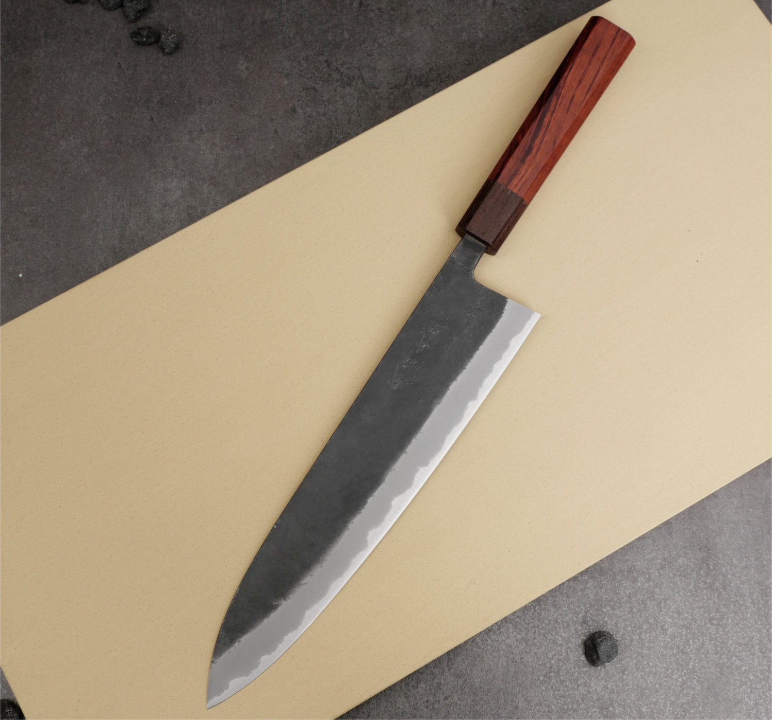 This gyuto knife is long and tall, and features a handle in red renghas wood.