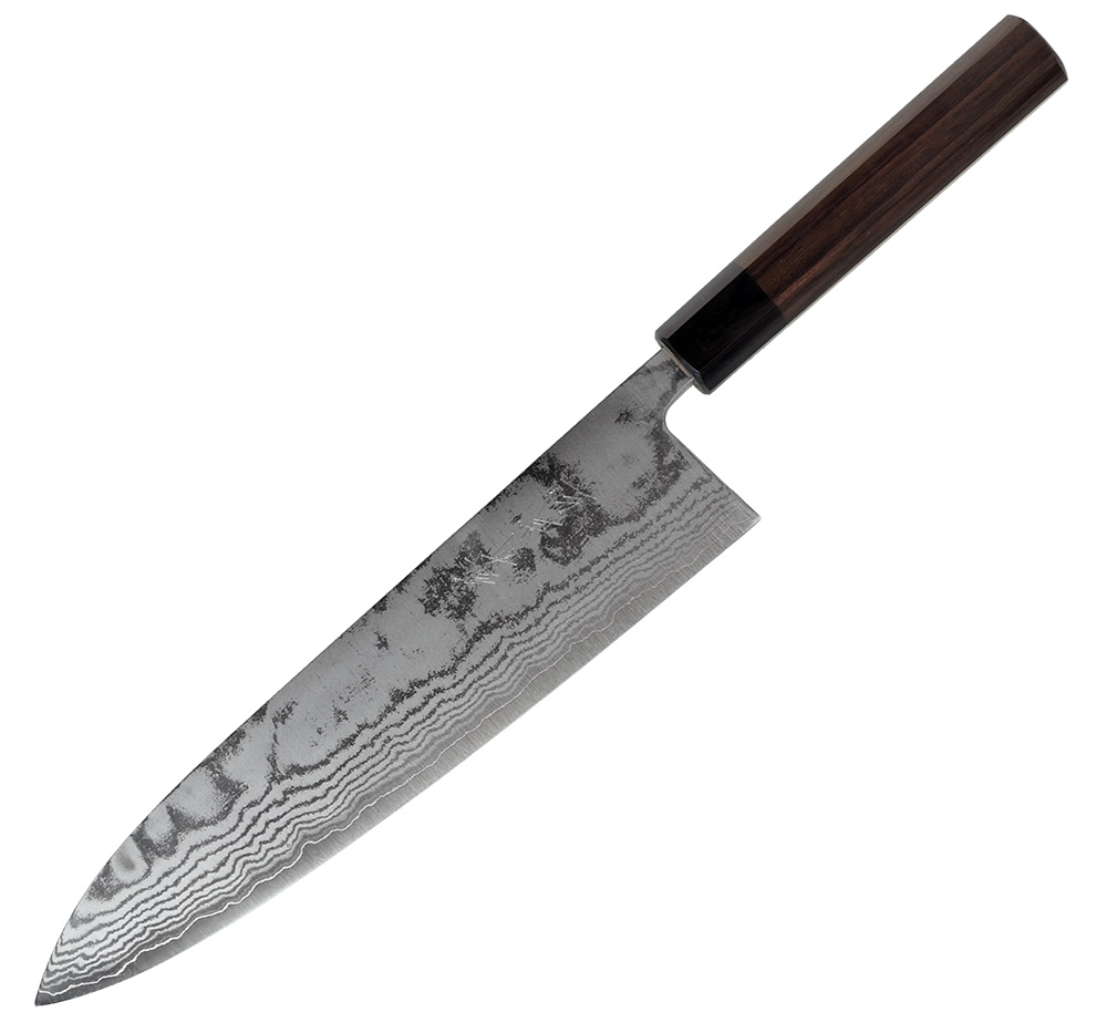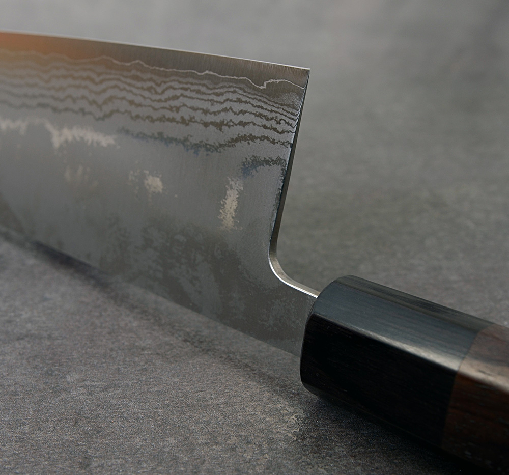 This knife is hot forged by hand in VG10 steel, heat treated to 60-62 HRC. The blades are tapered and have a beautifull nickel damascus clad. The grind is very thin, and these knives cut like lasers. A really good pick up that we truly recommend.