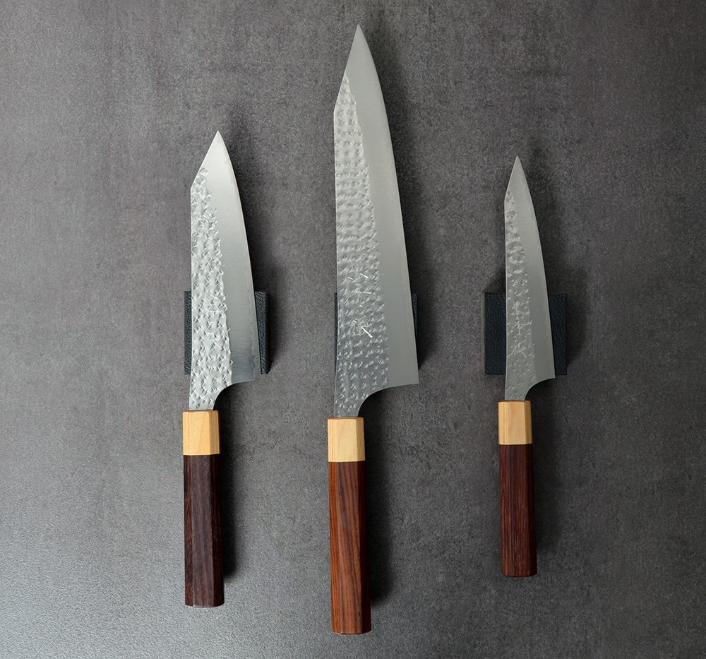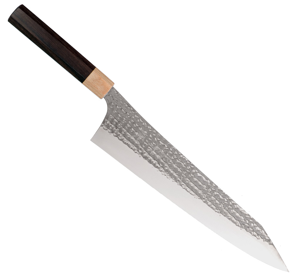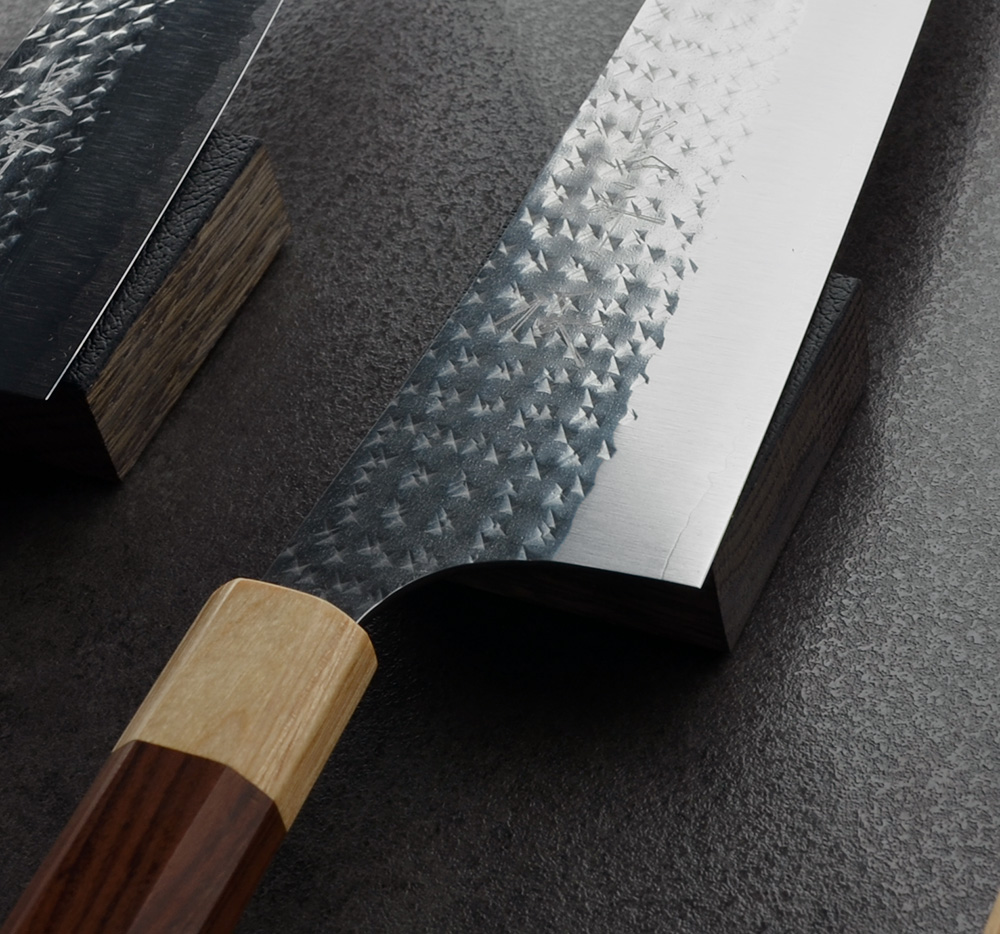In this line Kurosaki uses stainless SG-2 power steel with blade sides that he hammers to a unique pattern. The finish has high gloss and the knife gives a great feeling of quality.
