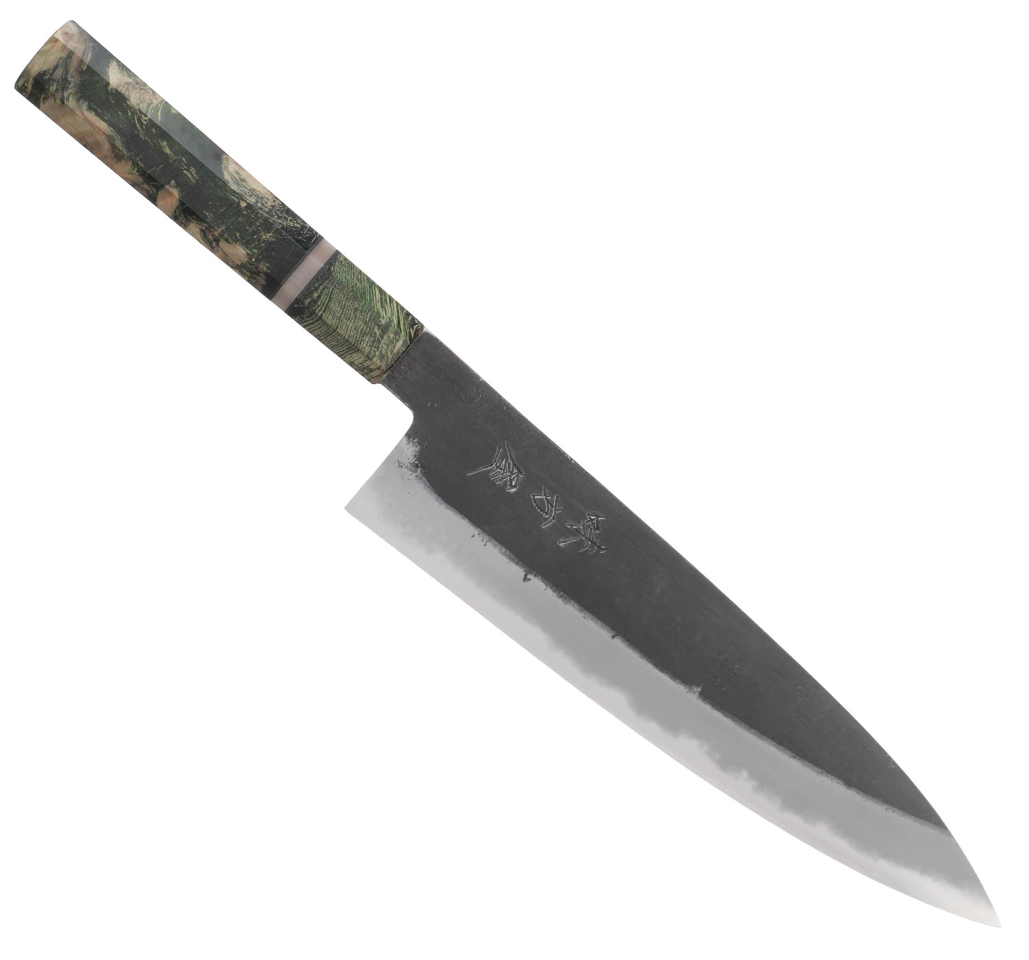 Chef’s knife, gyuto, with a 218 mm long blade, featuring fantastic tapering and a beautiful handle made of stabilized maple with a buffalo horn spacer.