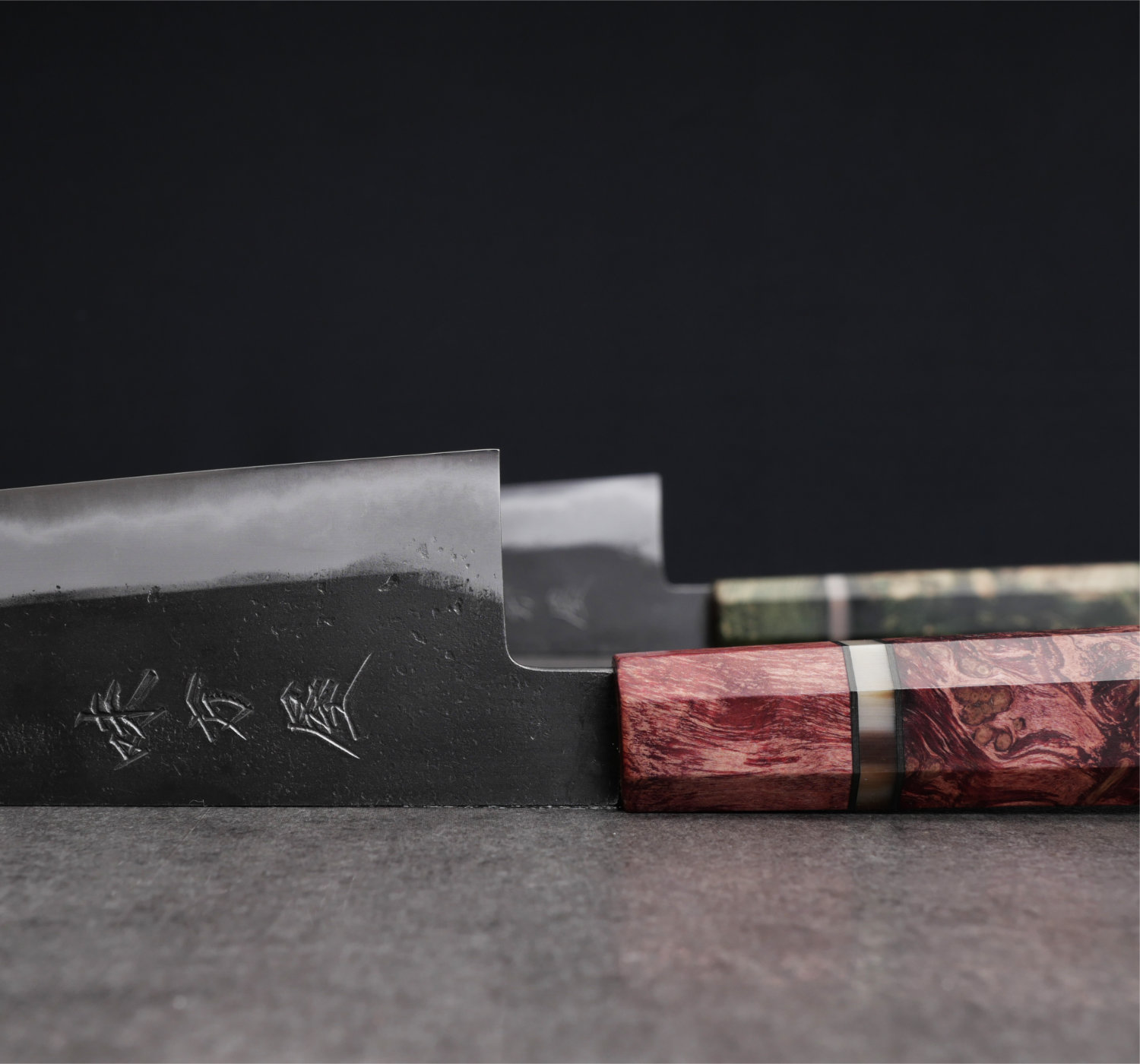 The blade finish is called nashiji-kurouchi, a rough, black-oxidized surface that gives the knife a rustic and authentic feel.