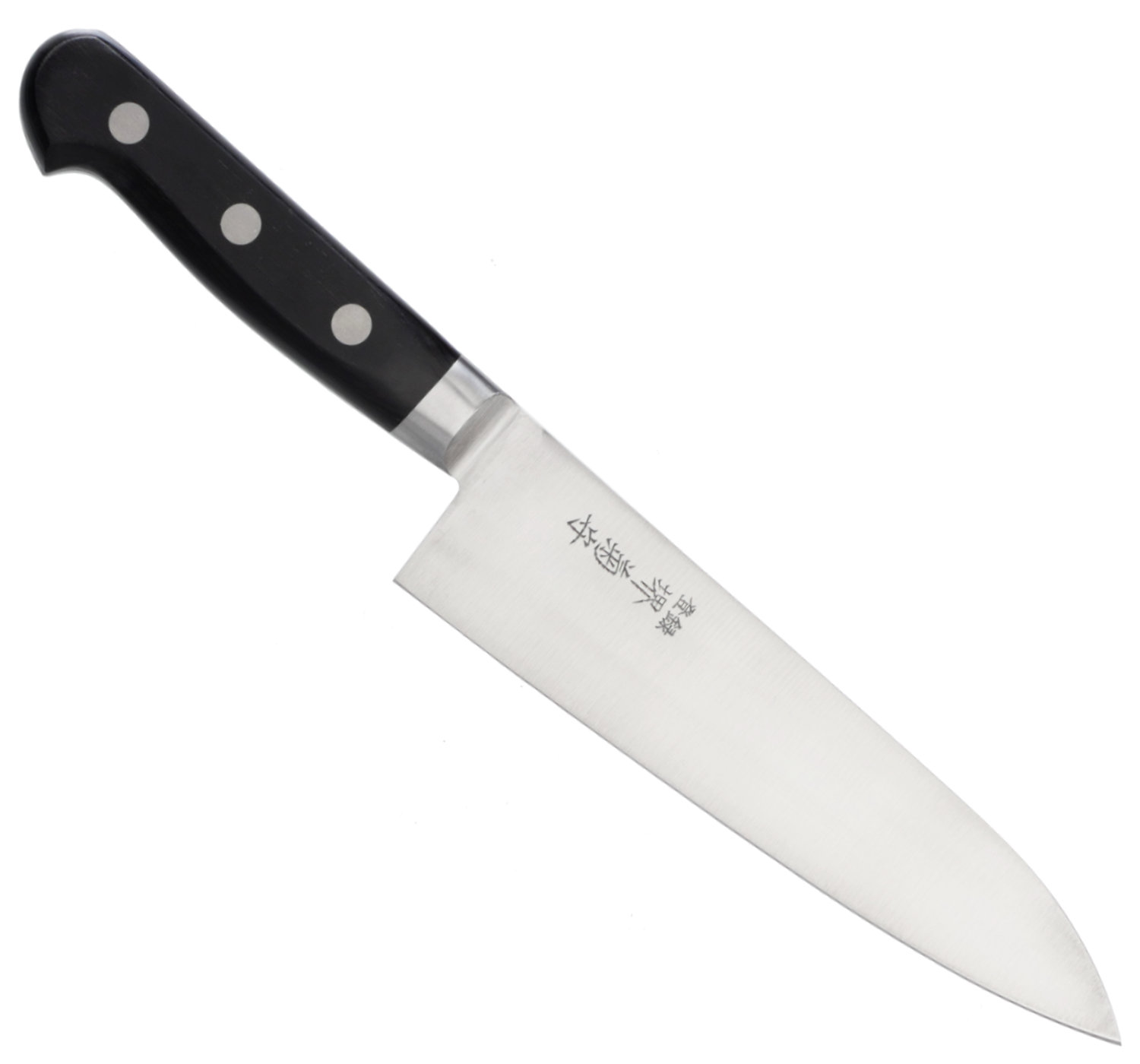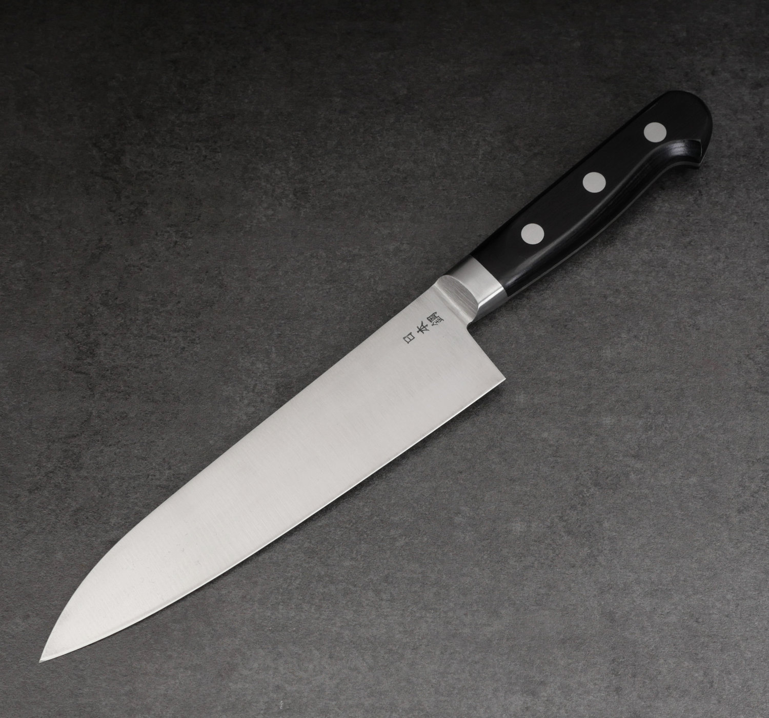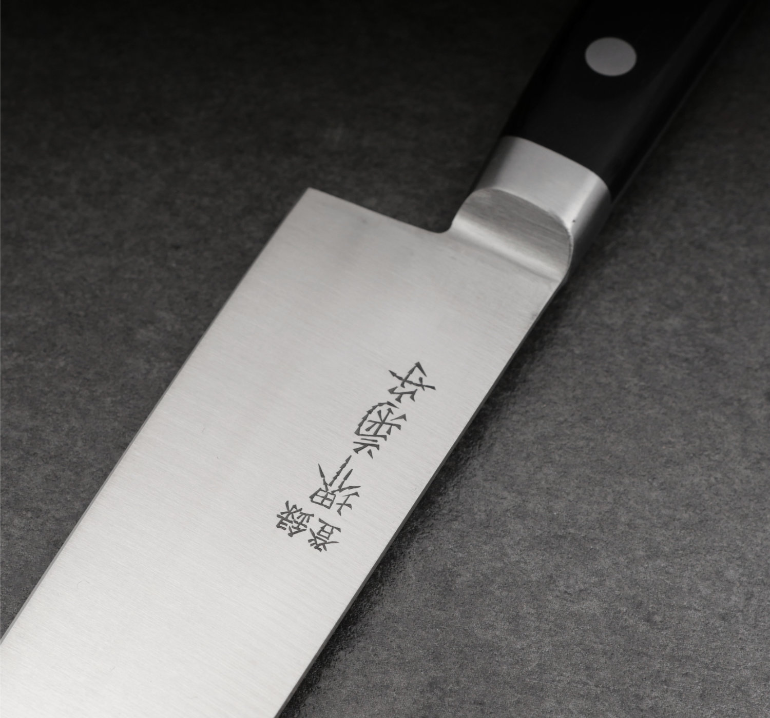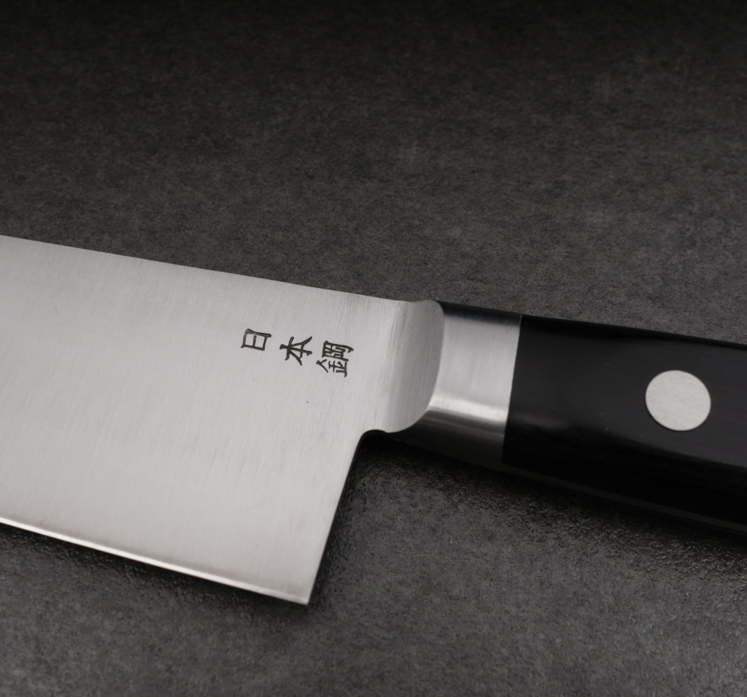 A chef knife in SK-4 carbon steel. It is not stainless and needs to be kept dry to avoid rusting over time. In return, it gets a beautiful patina on the blade and the knife is easy to sharpen. It fits well both as a first real knife and as a professional tool for the experienced chef.