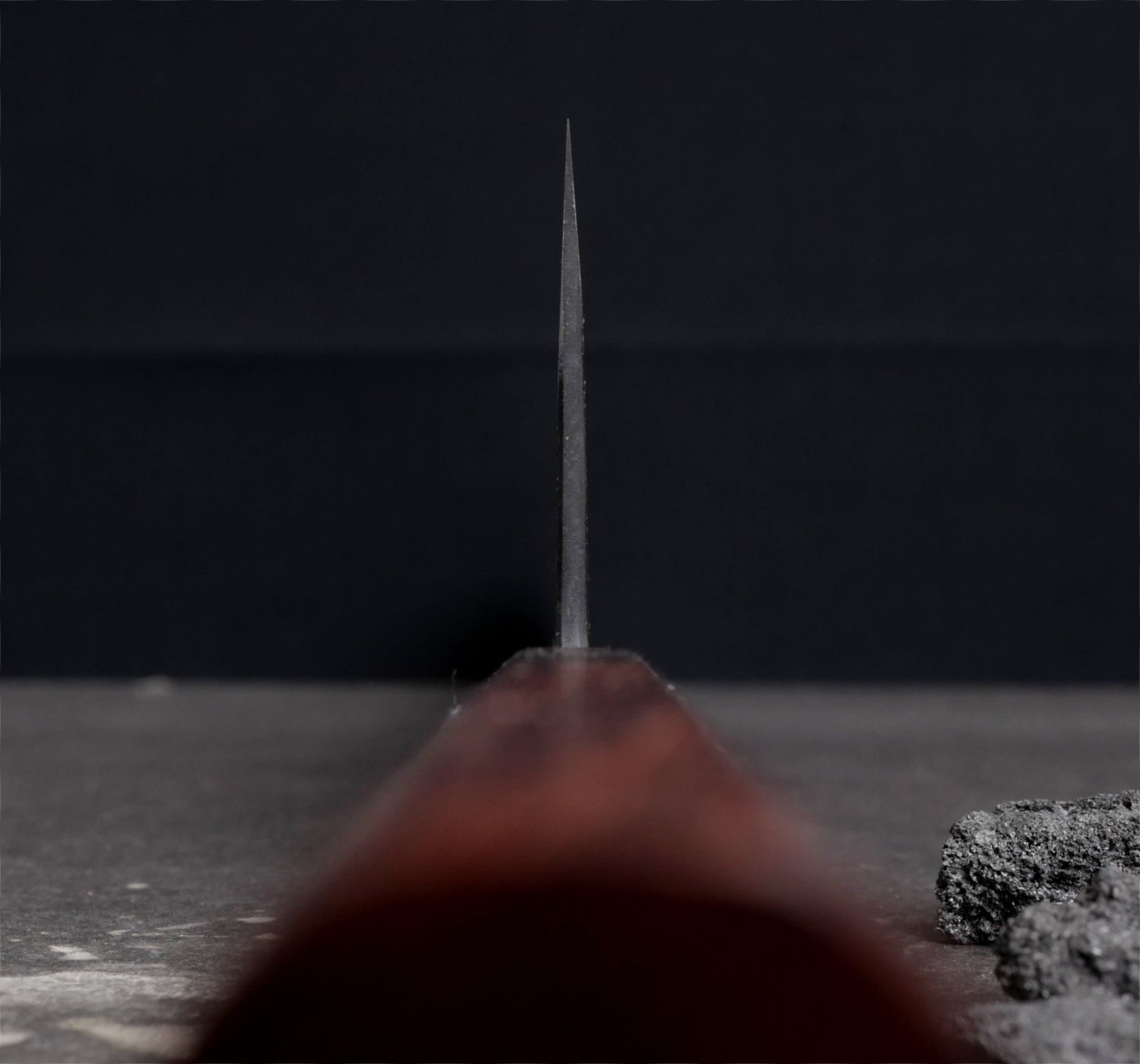 Sakimaru gyuto, a chef’s knife with a rounded tip, with a blade measuring 265 mm and an octagonal handle in renghas wood. The actual cutting edge measures 245 mm.