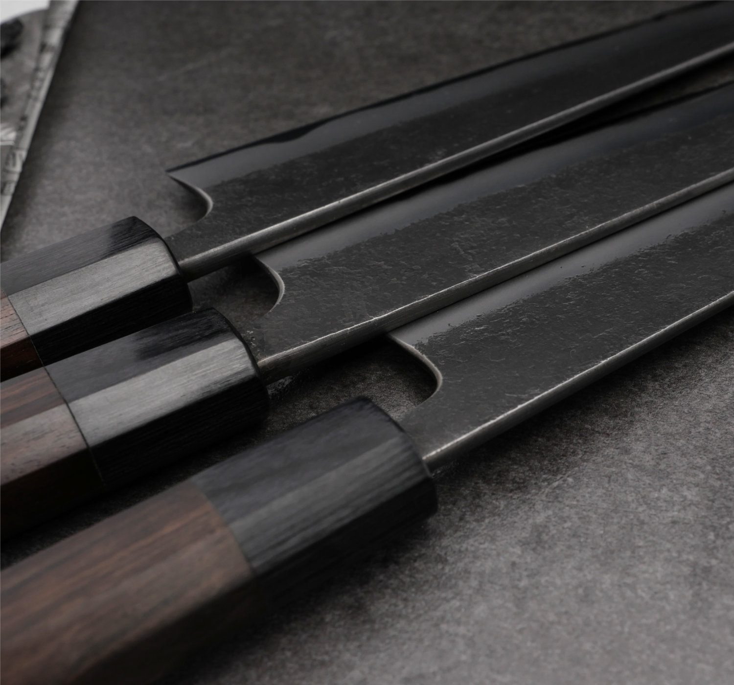 The blade’s finish is called nashiji kurouchi, a rough, blackened surface. Despite the raw finish, Wakui has rounded all edges and given the blade smooth contours. He skillfully tapers the blade (narrowing from spine to tip), resulting in excellent balance and feel.