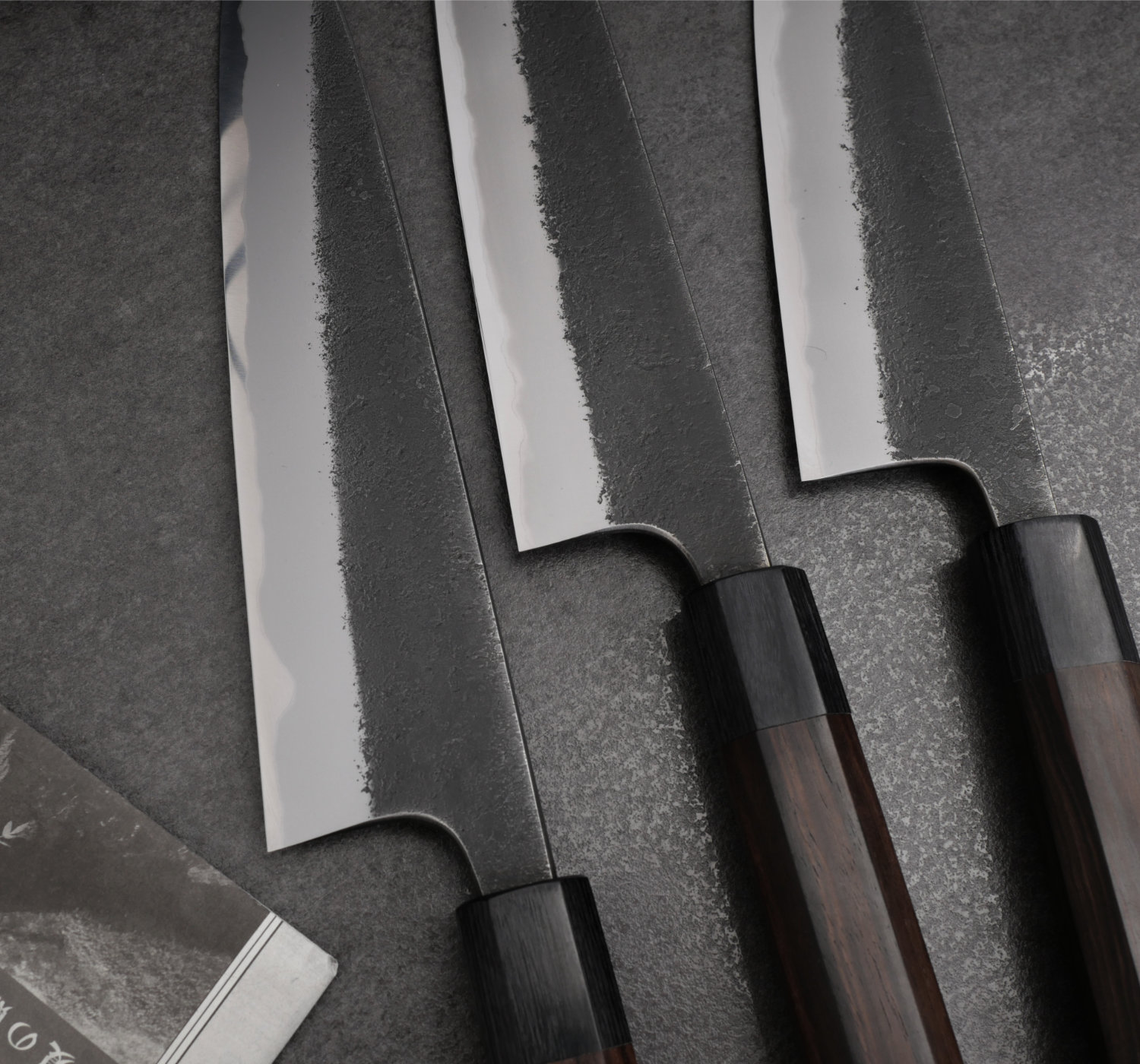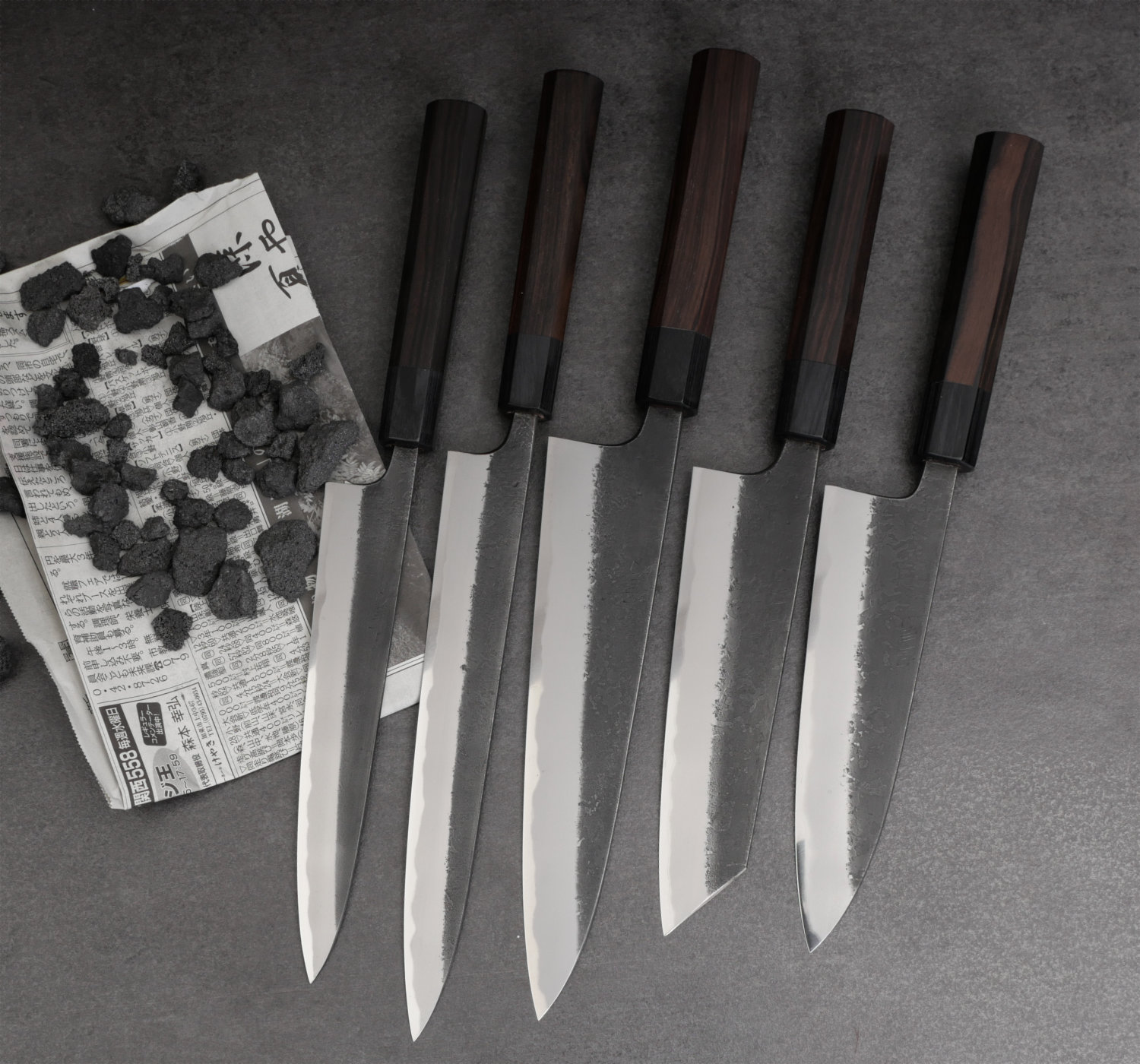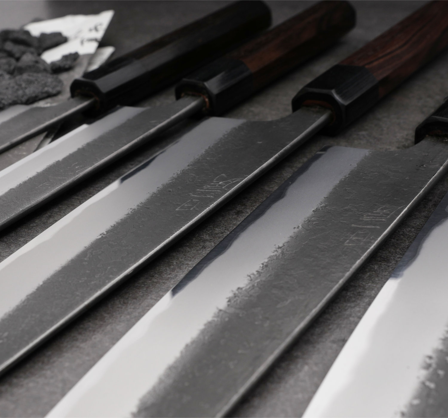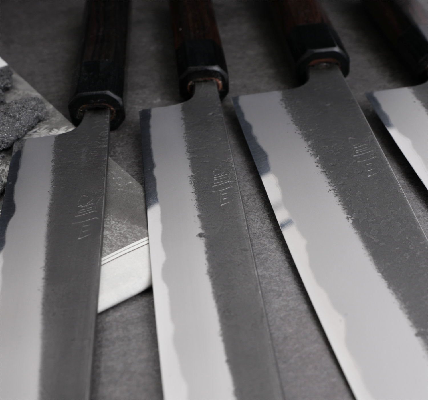 Toshihiro Wakui is an exceptionally talented craftsman who produces very well-forged knives in carbon steel. In this series, he uses Aogami #2 core steel, combined with soft iron cladding (warikomi). While most blacksmiths purchase pre-laminated steel, Wakui forges his own blade material to achieve his desired specifications.