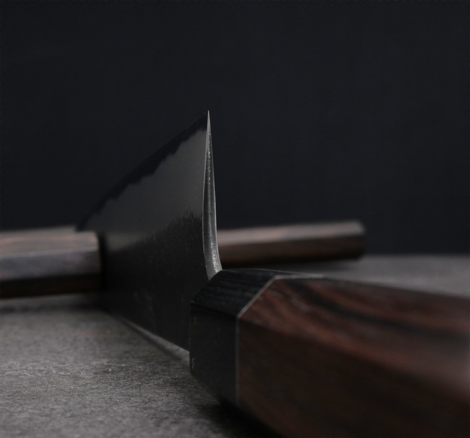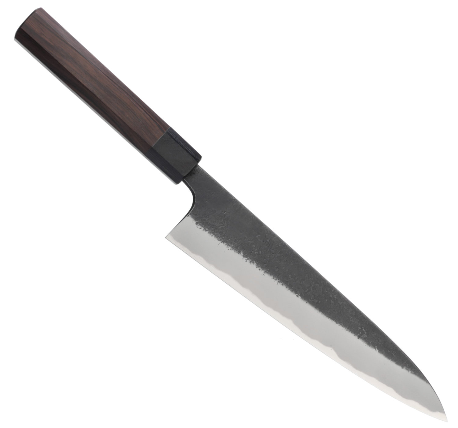 The blade’s finish is called nashiji kurouchi, a rough, blackened surface. Despite the raw finish, Wakui has rounded all edges and given the blade smooth contours. He skillfully tapers the blade (narrowing from spine to tip), resulting in excellent balance and feel.