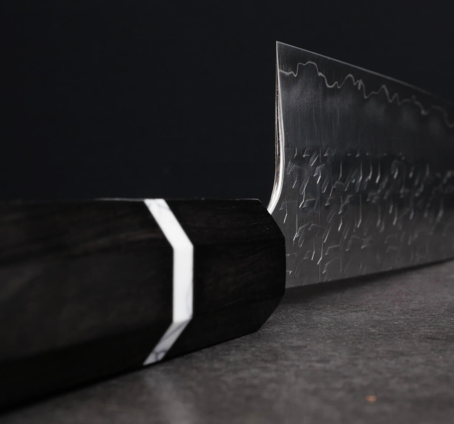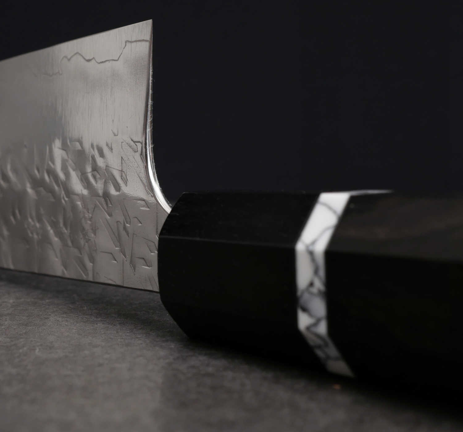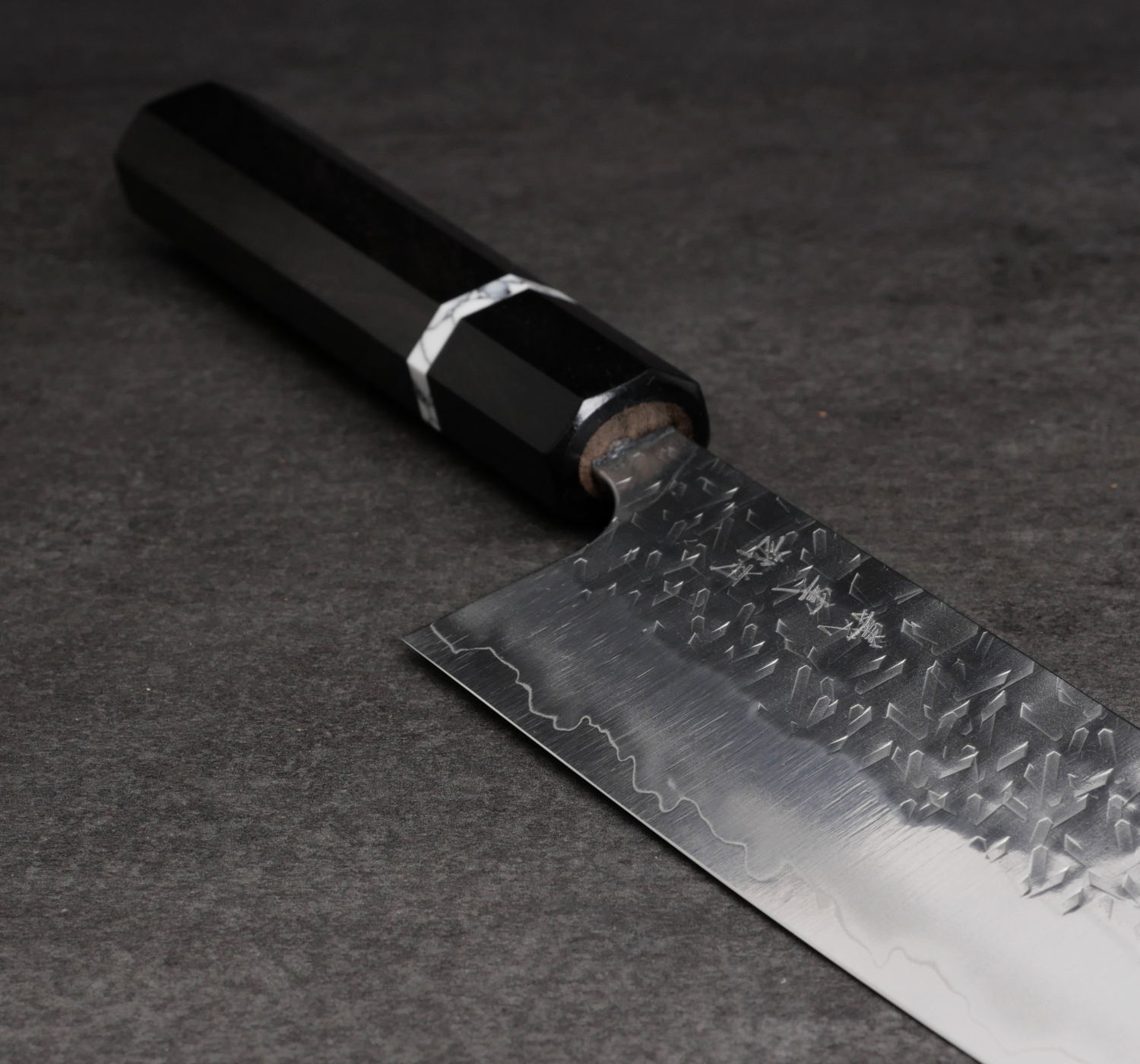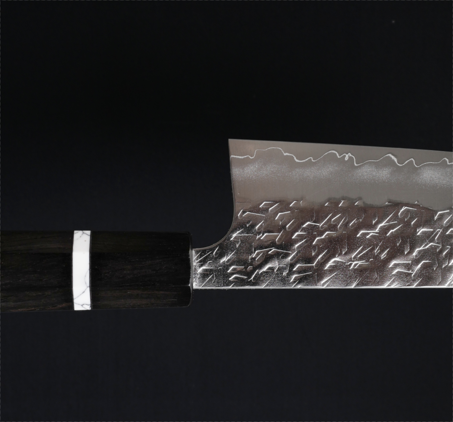 The knives in this series are forged from SG2 stainless powdered steel, a fine-grained steel that takes a very sharp edge and handles very low bevel angles. Knives of this style are often described as a “laser,” with cutting performance that impresses, especially when slicing denser ingredients such as carrots and potatoes. The blade sides are adorned with a unique hammered pattern that is then polished to a mirror finish for both beauty and optimal food release.