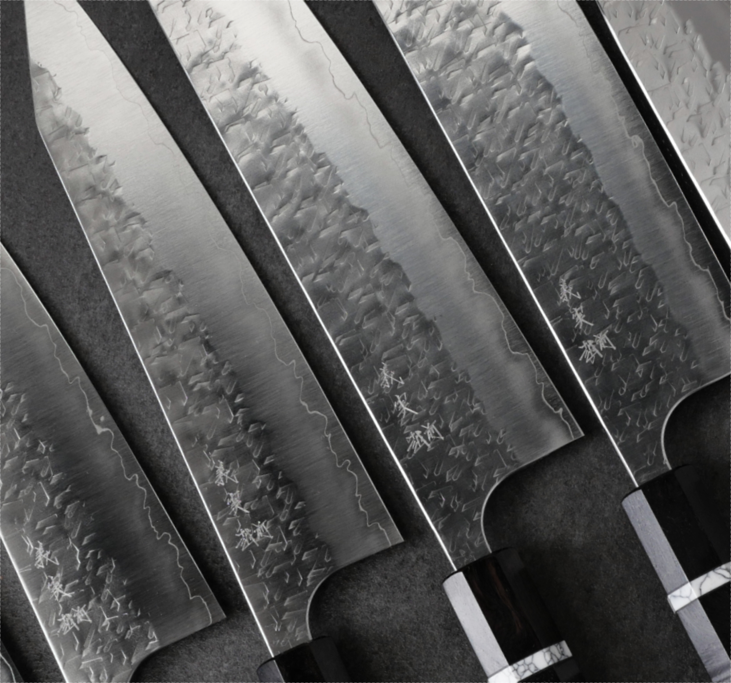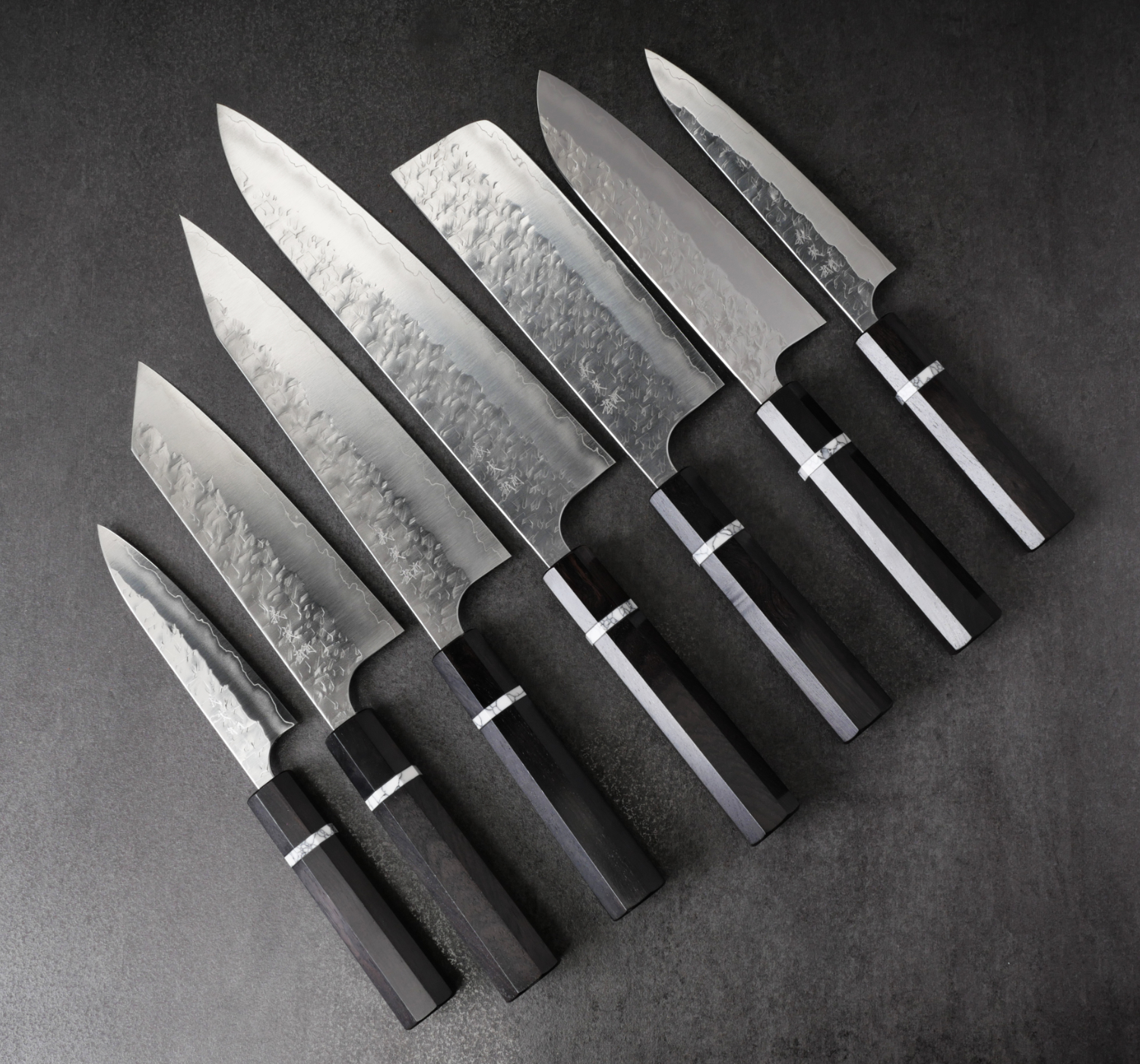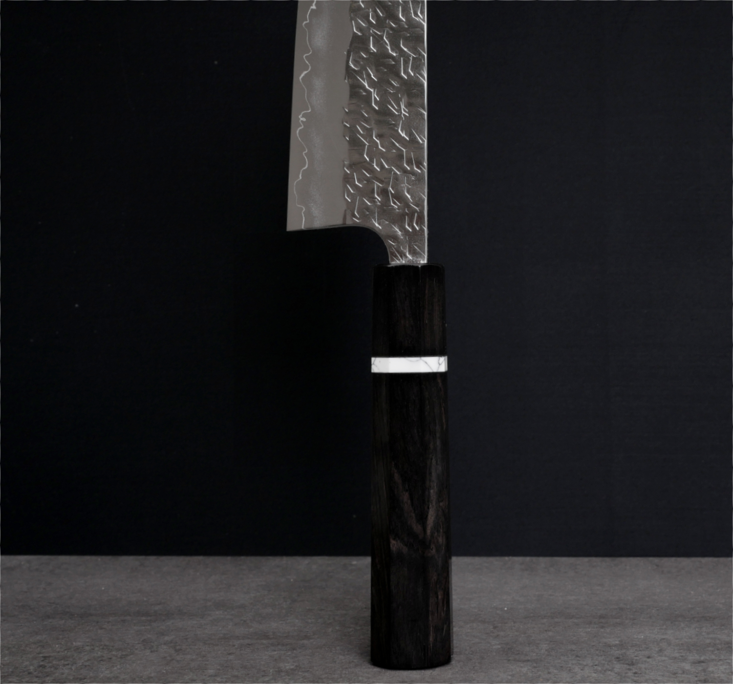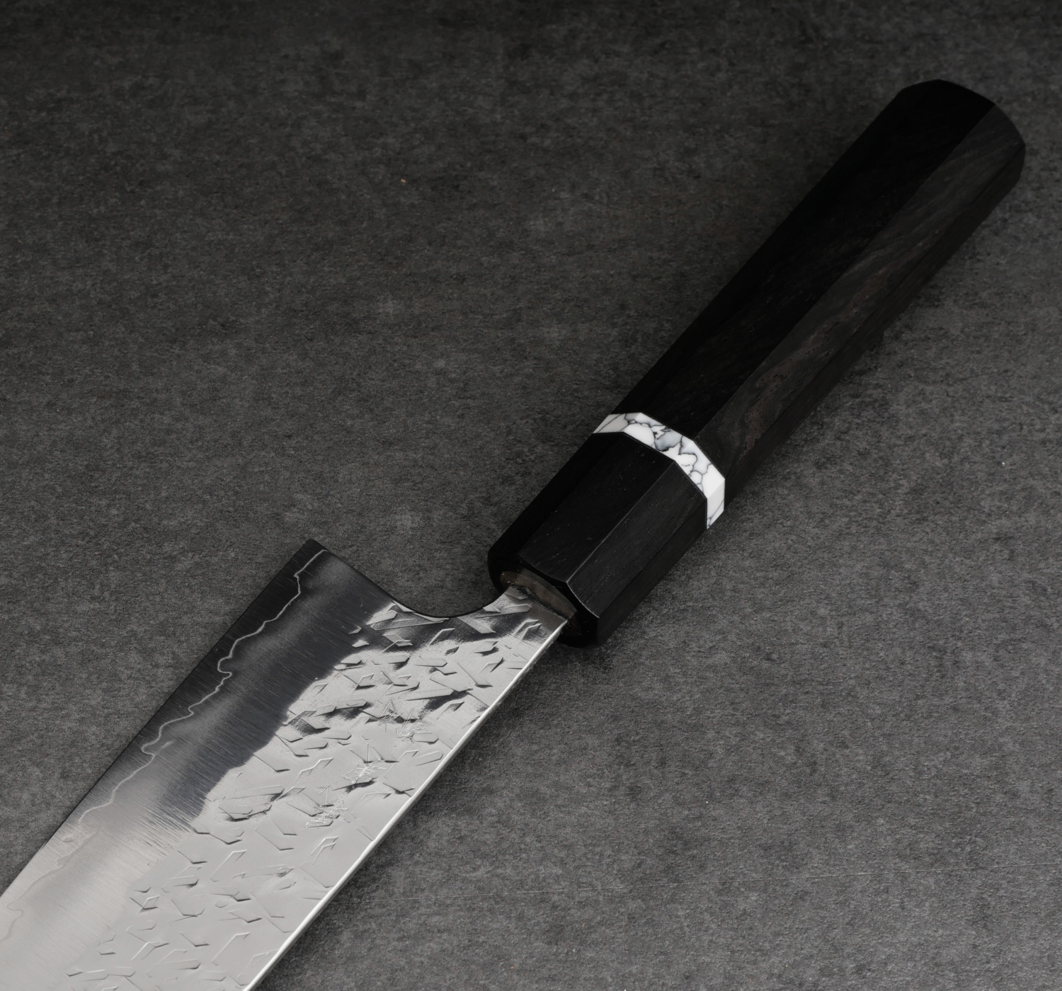 The knives in this series are forged from SG2 stainless powdered steel, a fine-grained steel that takes a very sharp edge and handles very low bevel angles. Knives of this style are often described as a “laser,” with cutting performance that impresses, especially when slicing denser ingredients such as carrots and potatoes. The blade sides are adorned with a unique hammered pattern that is then polished to a mirror finish for both beauty and optimal food release.