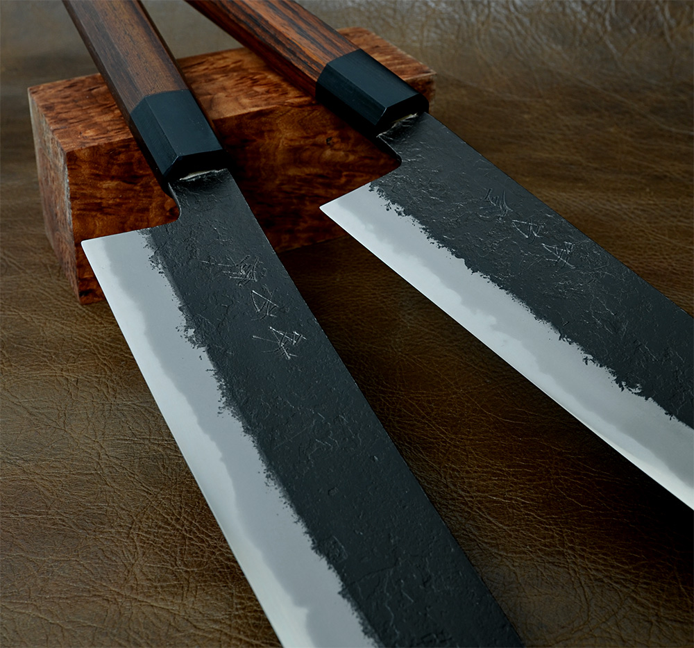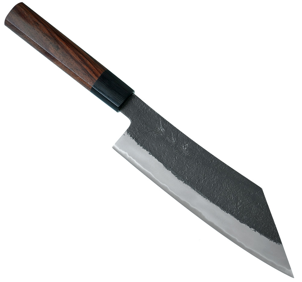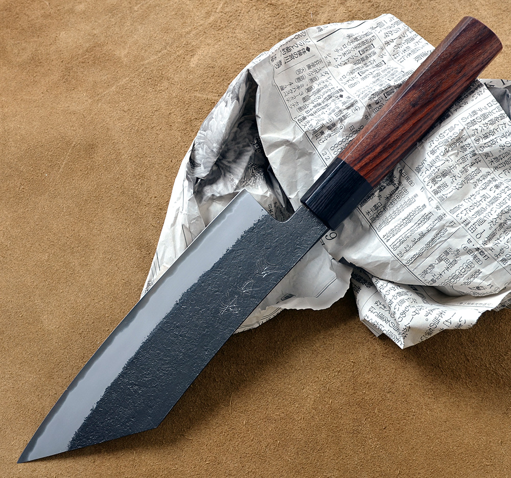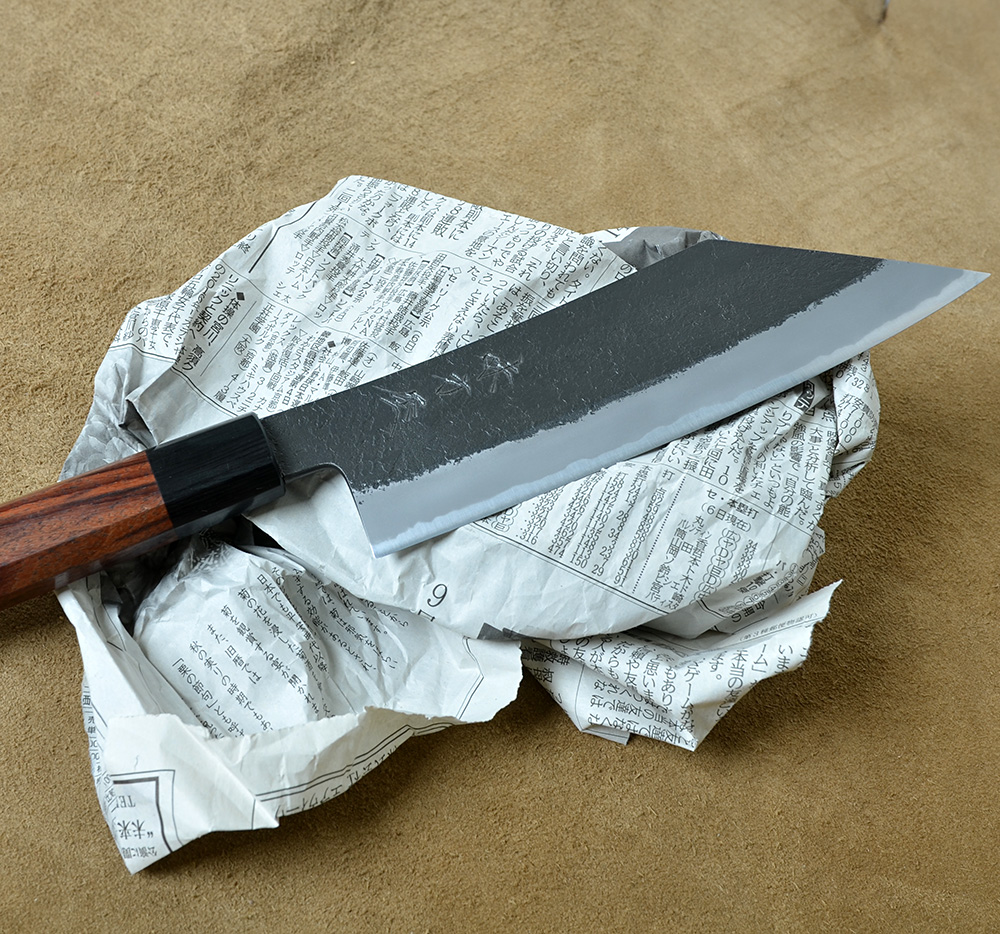 Ajikataya is the name of a series of knives made by Mutsumi Hinoura. His father, Tsukasa, is also helping out in the production but the main creator is Mutsumi. The steel is 3 layered steel with a core of shirogami#2 carbon steel, heat treated to about 63 HRC. The Hinoura family is already a legendary blacksmith family and their blades are known all over the world. All blades are hotforged by hand and nothing leaves the hands of Hinoura before the quality is top notch.