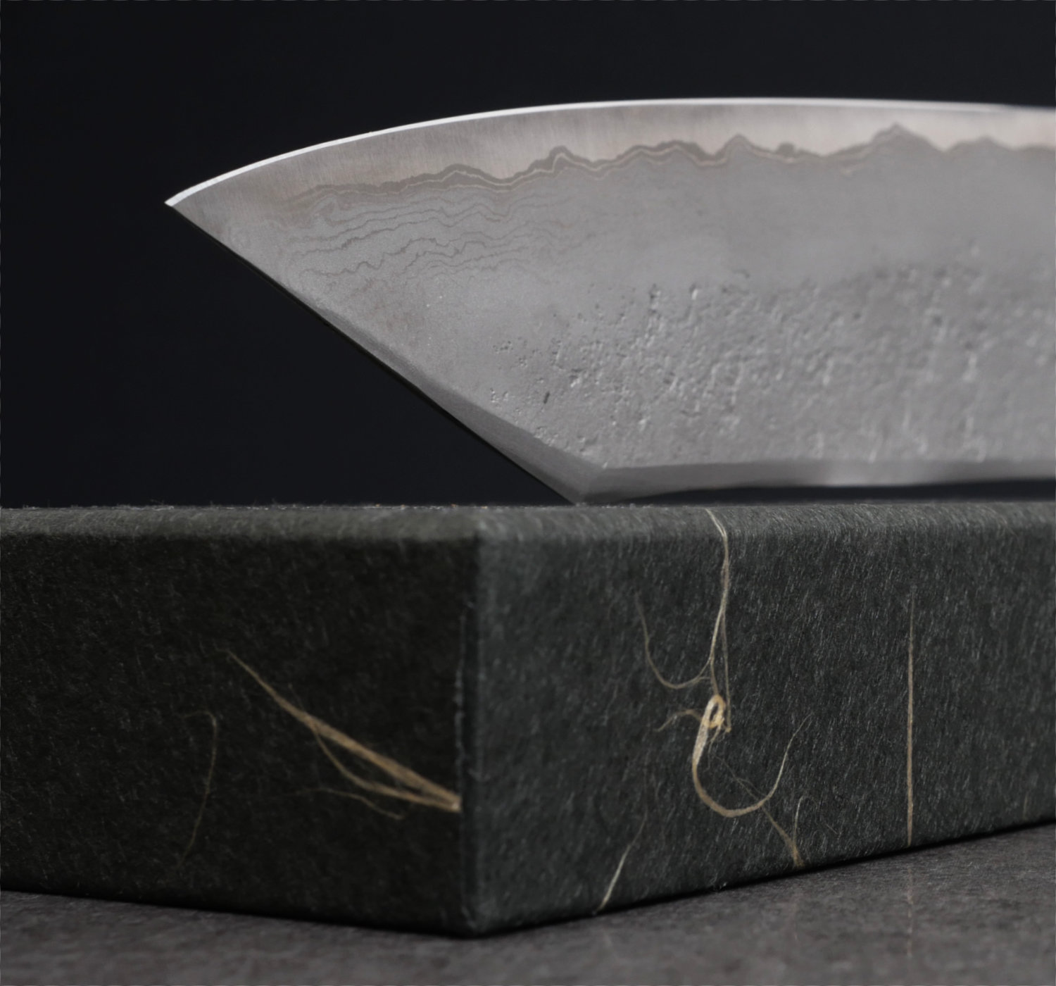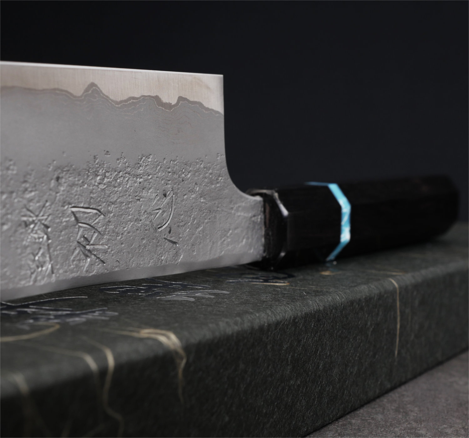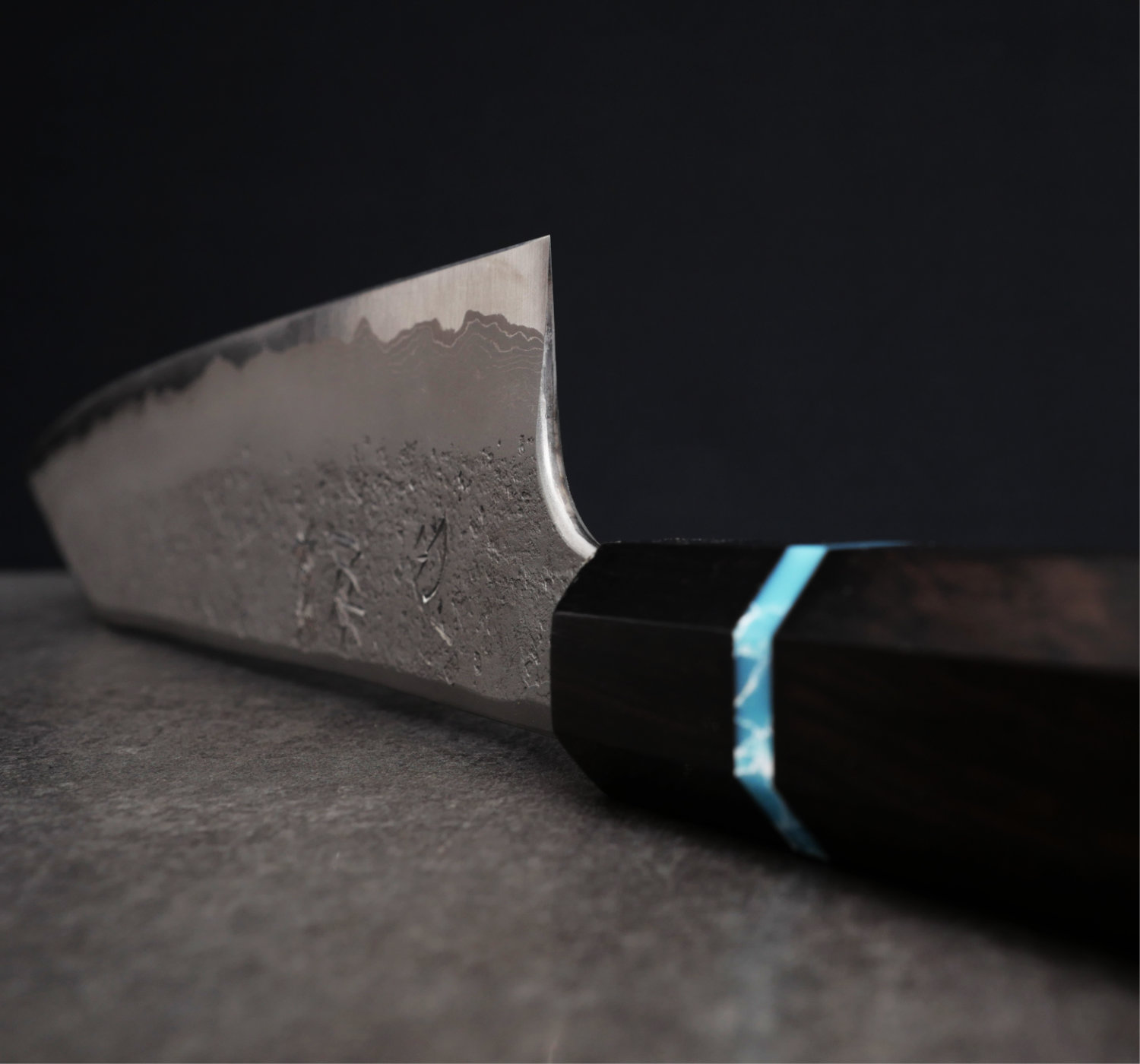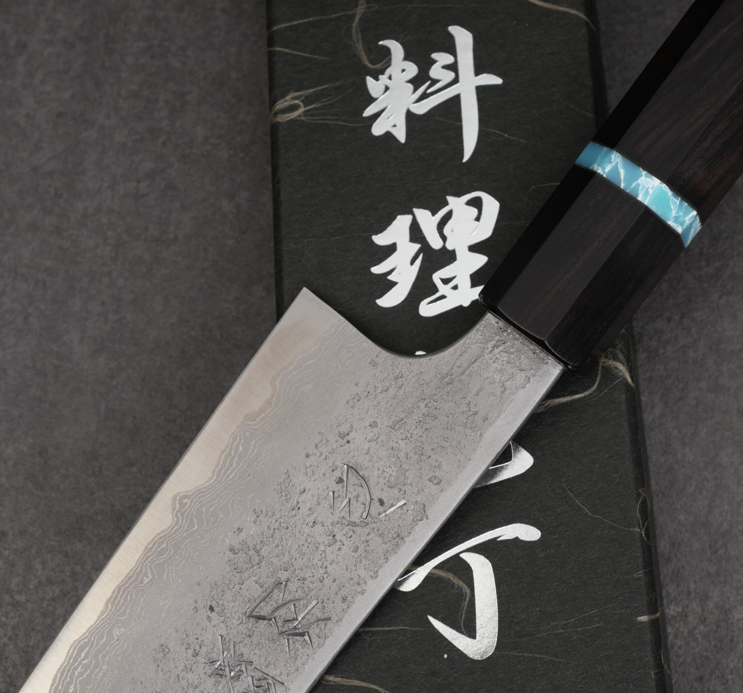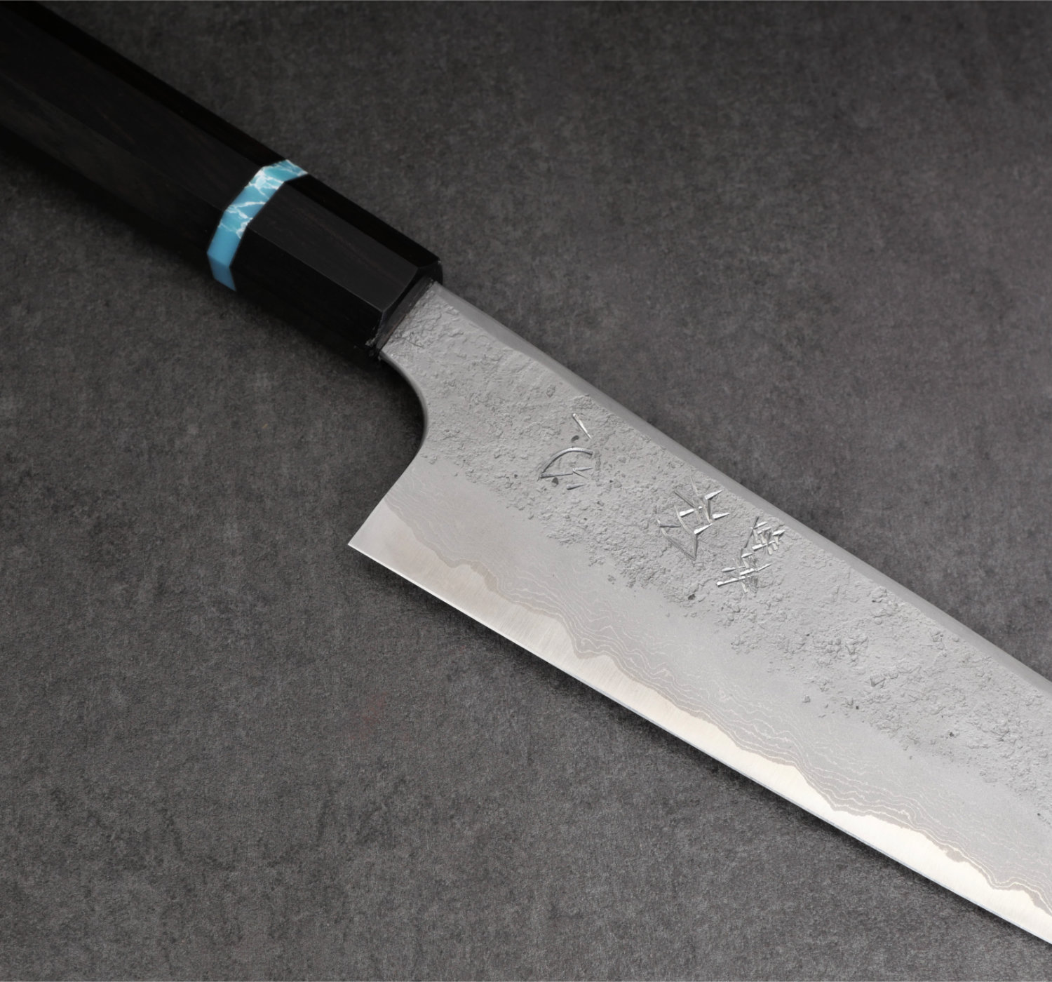 Aogami #2 offers an outstanding balance of sharpness, durability, and ease of sharpening. The stainless Damascus cladding protects the carbon steel core, making the knife more resistant to rust and easier to maintain. However, the core steel itself is not stainless, so it’s important to keep the knife dry after use, especially when cutting acidic ingredients such as tomatoes or citrus.