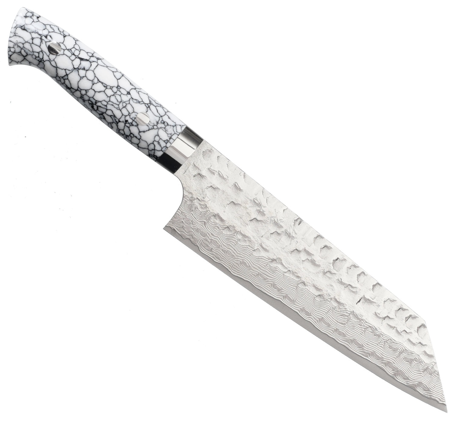 A beautiful masterpiece by Takeshi Saji. This Bunka knife has a 176 mm long blade crafted from VG-10 core steel with stunning damascus cladding.