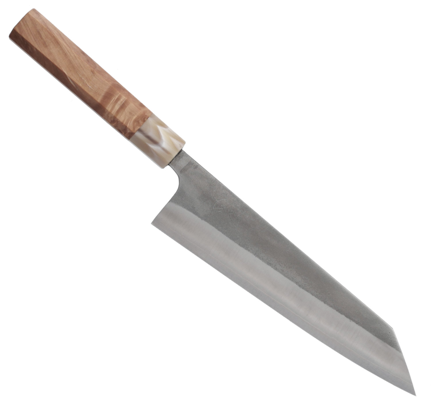 This is a fantastic knife, hand forged in Sanjo by the famous Yoshikane factory, one of the best makers in the business. Its a shirogami#2 knife with a very thin and delicate edge. The sharpness is mind blowing and the geometry ensures extreme cutting abilities. Have we talked it up enough yet? Well, theres only one way to find out, and we stake our reputation on the performance of this bad boy. The stainless blade sides have a matte nashiji finish and the carbon steel core is polished.