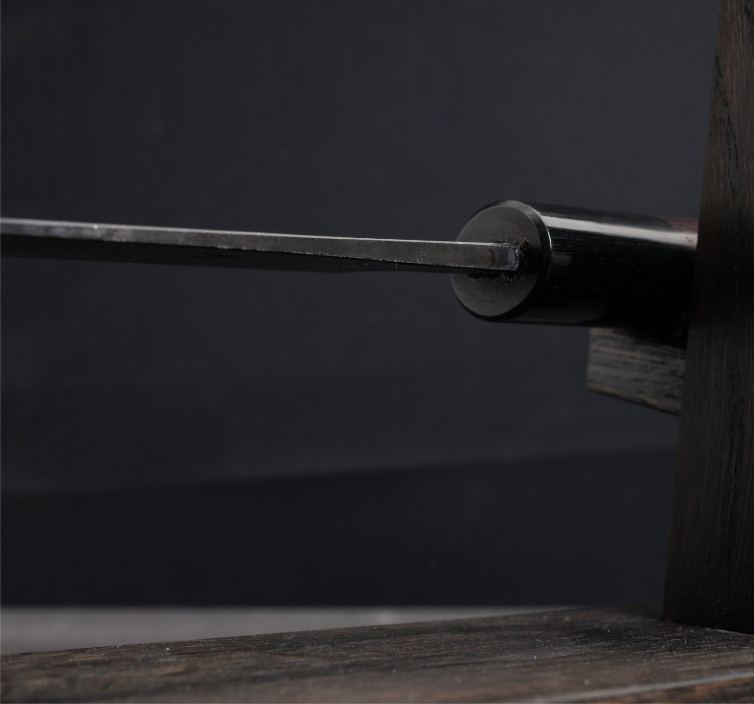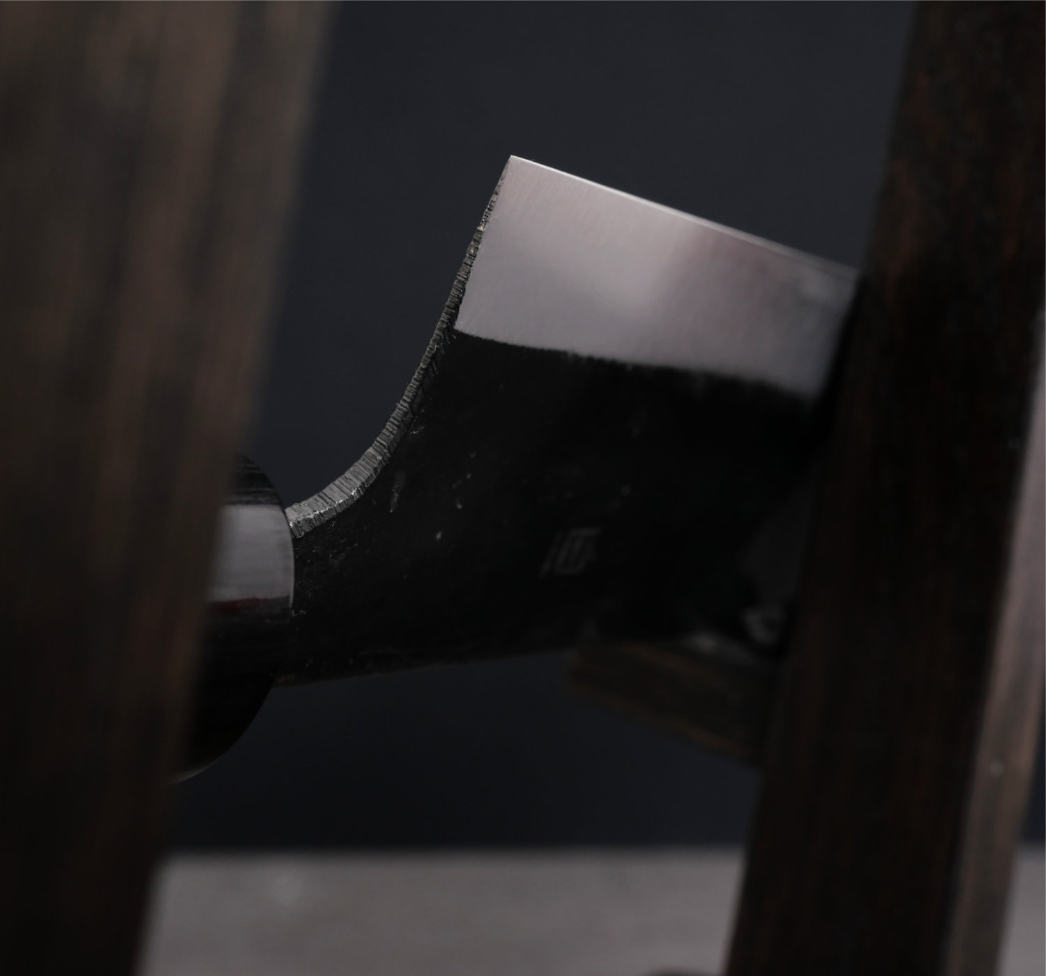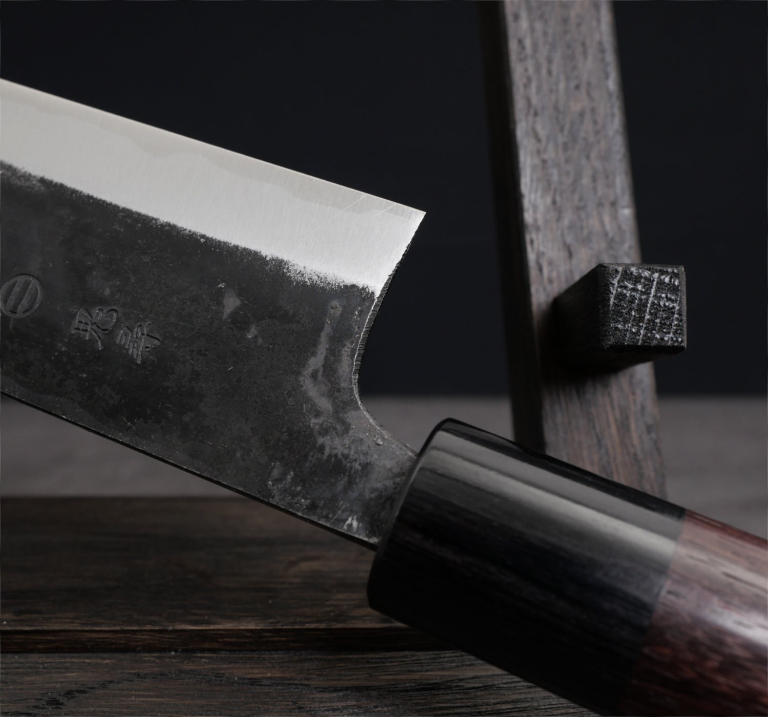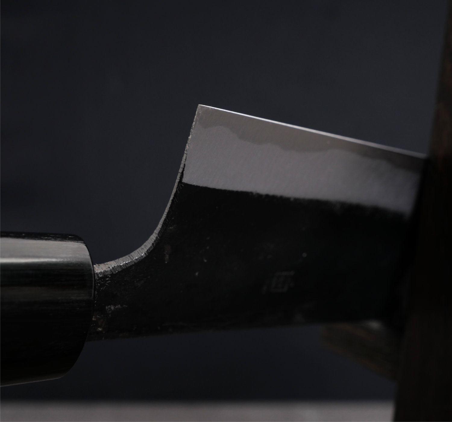 The blade features a kurouchi finish – a dark, raw forged surface that gives a rustic appearance while offering some protection against oxidation. The geometry is relatively robust at the heel but tapers quickly, resulting in a stable yet efficient feel for vegetable prep.