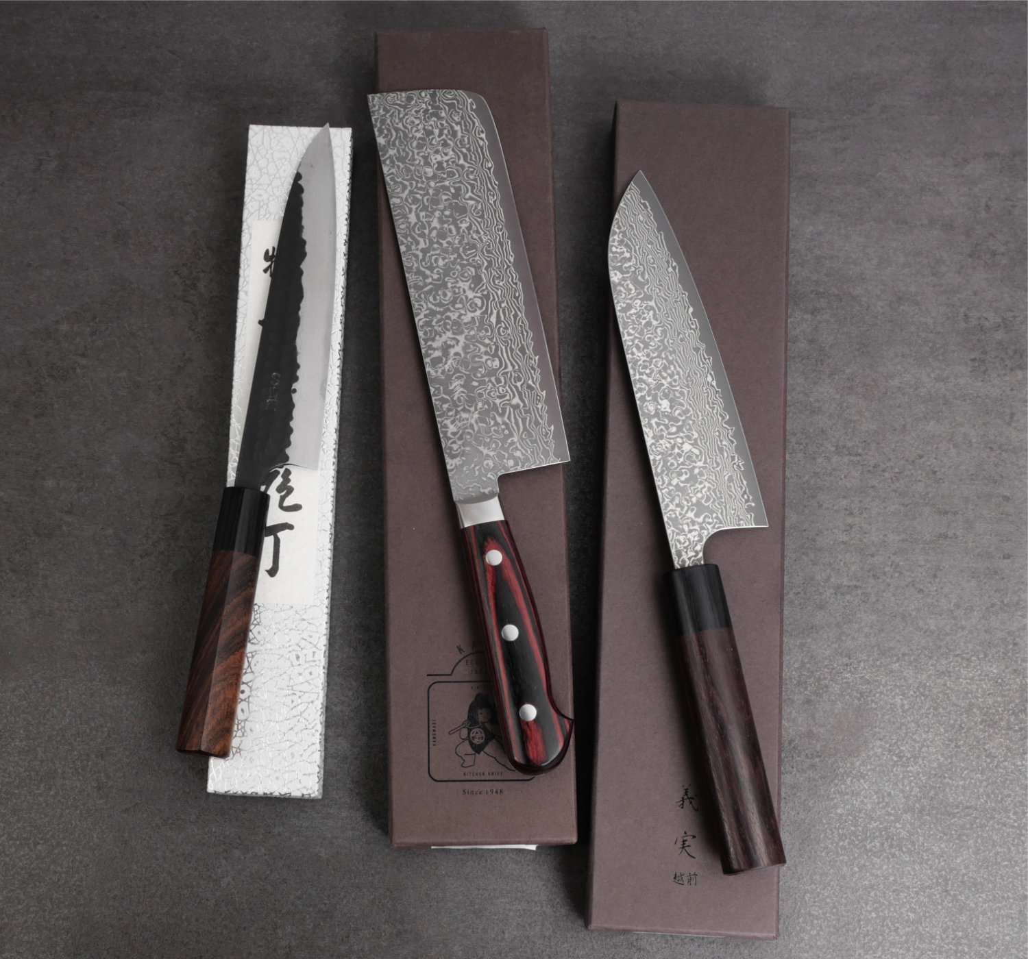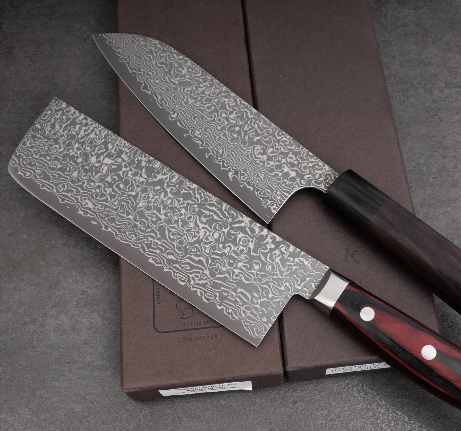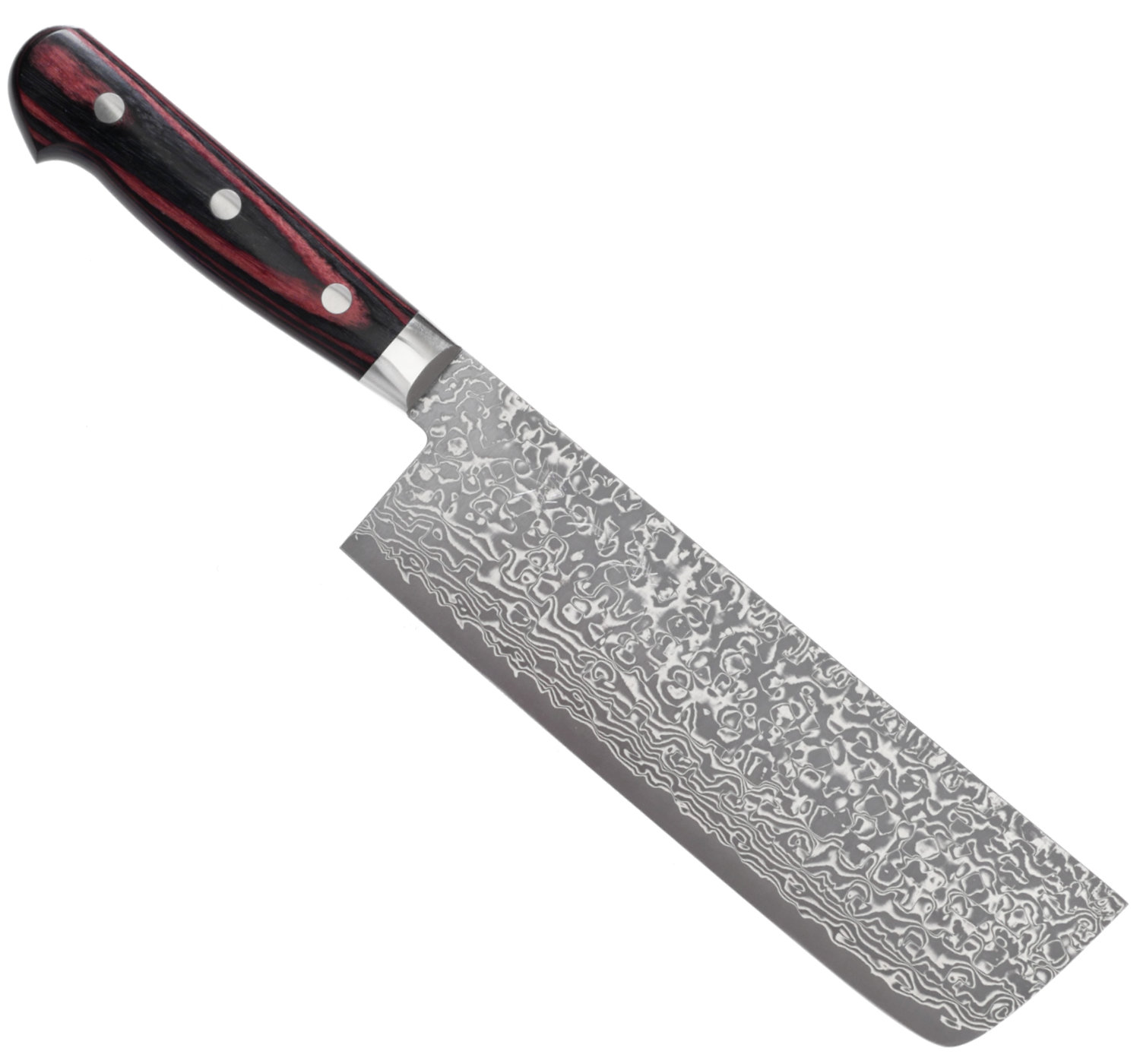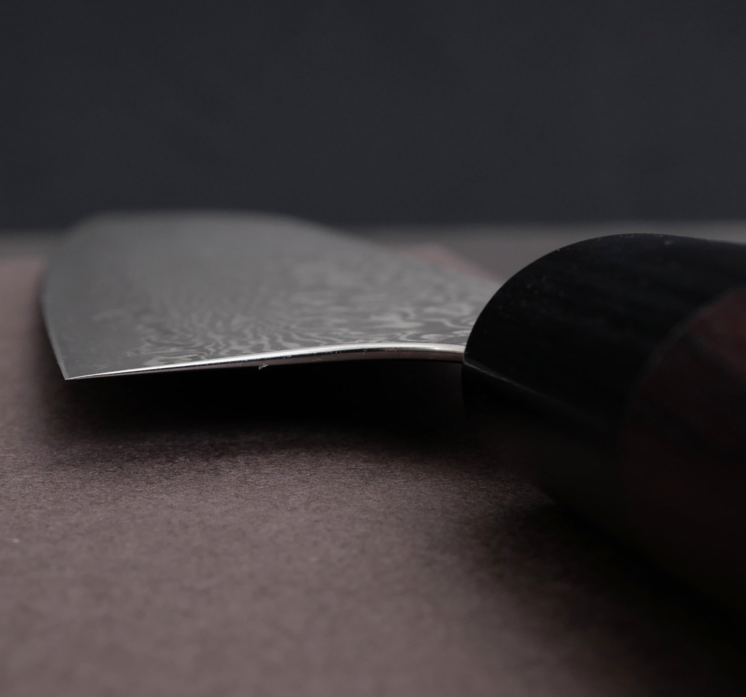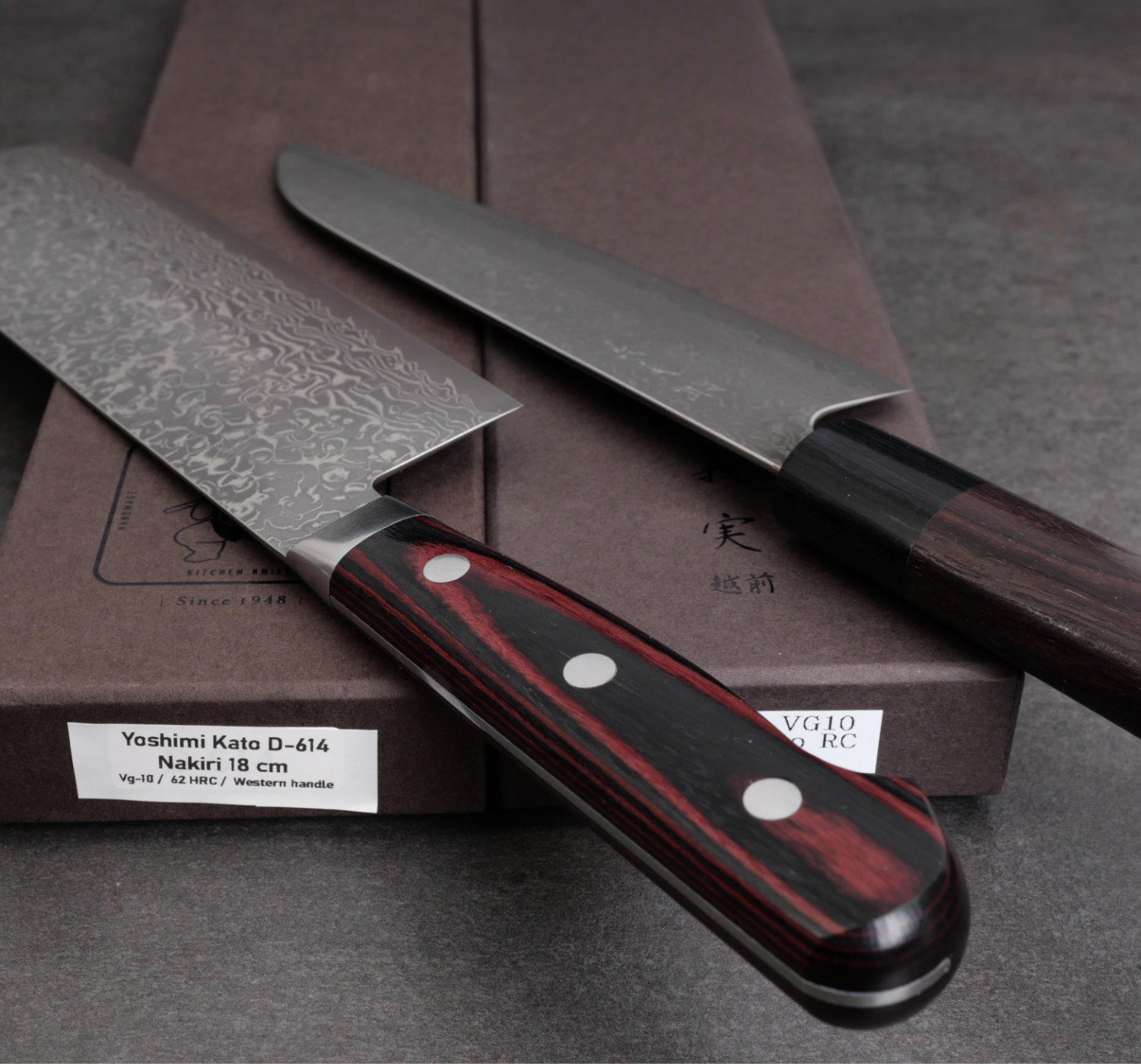 This knife series is a visual delight. Kato works with VG-10 steel clad in beautiful nickel damascus, creating elegant contrasts between bright and dark tones. The handle is made from mixed pakkawood in red and black hues. The knife sits very comfortably in the hand and gives a light, refined impression.