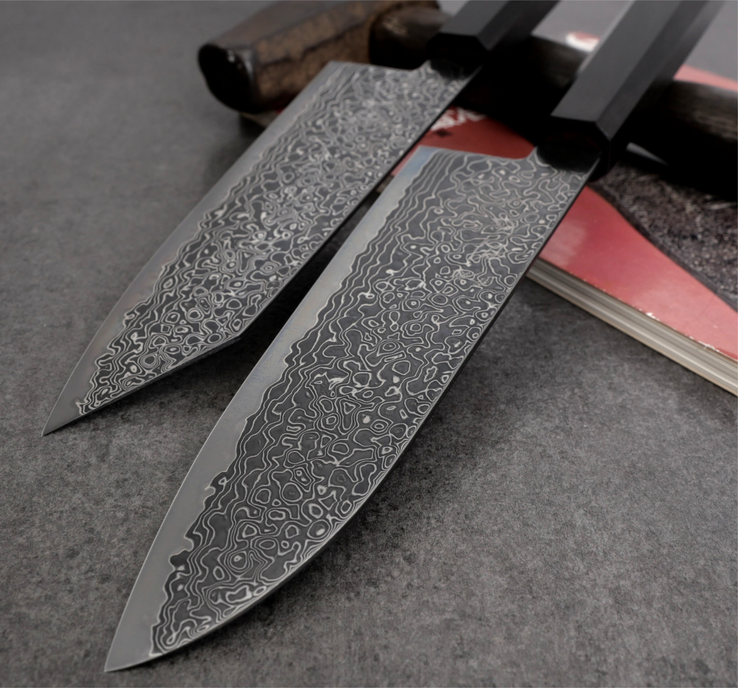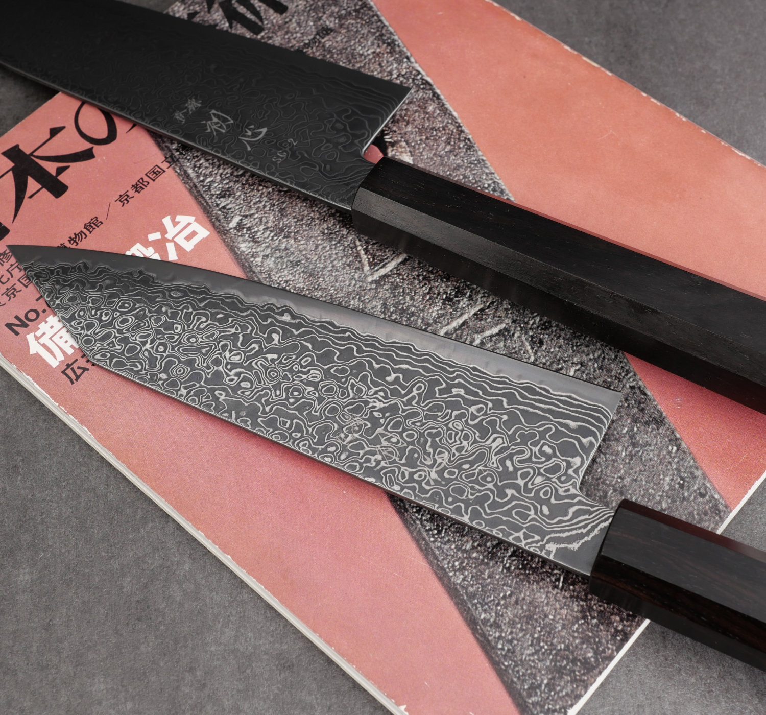Ryuhyo from Hatsukokoro is a truly spectacular knife made from top-tier stainless SG-2 powdered steel. Surrounding the core steel is a dark-etched nickel damascus cladding with incredible contrast. The edge is thin, and the knife cuts like a razor. It’s a high-performance “laser” that is breathtakingly beautiful to look at. The handle is made from ebony.
